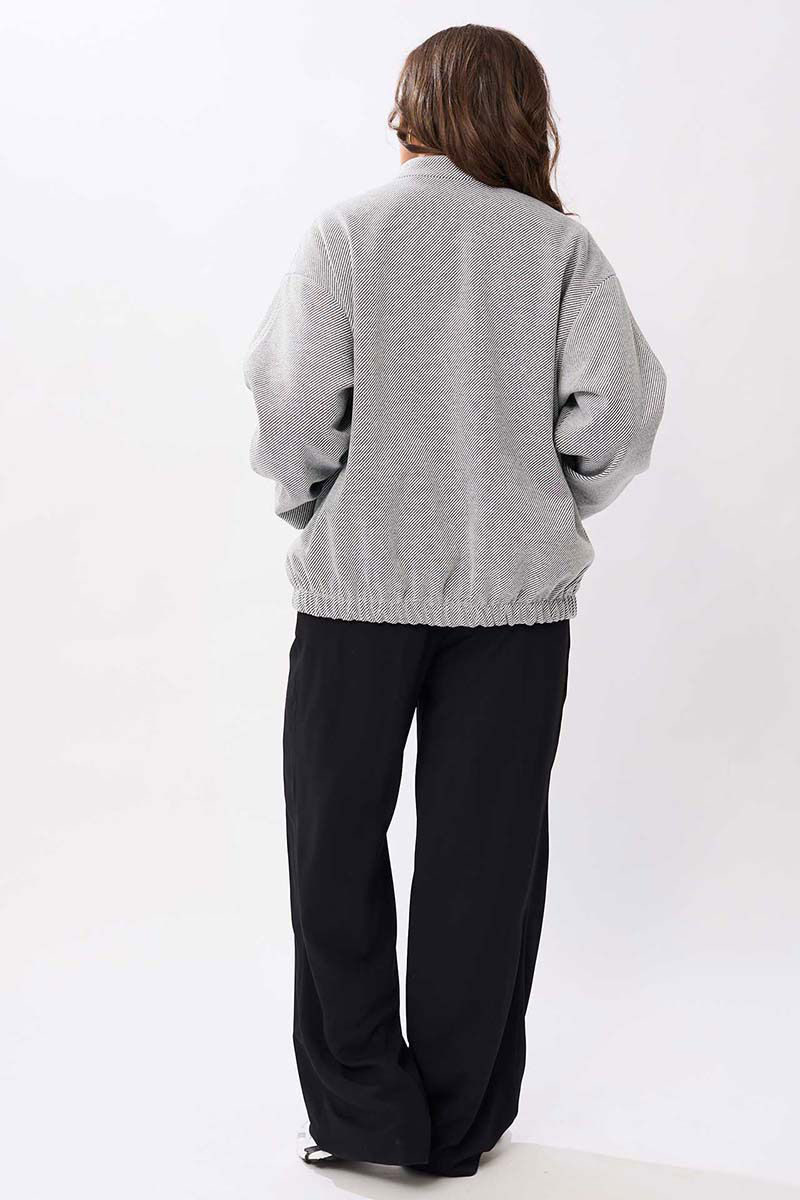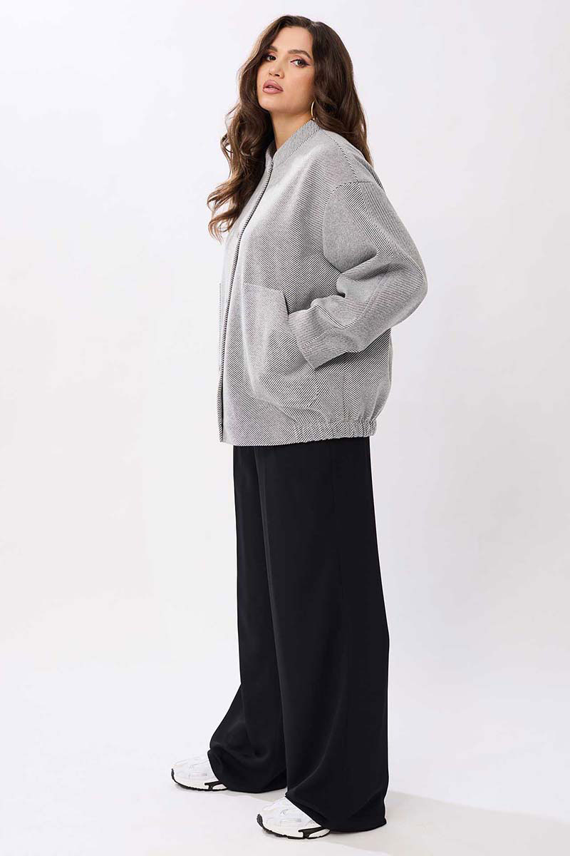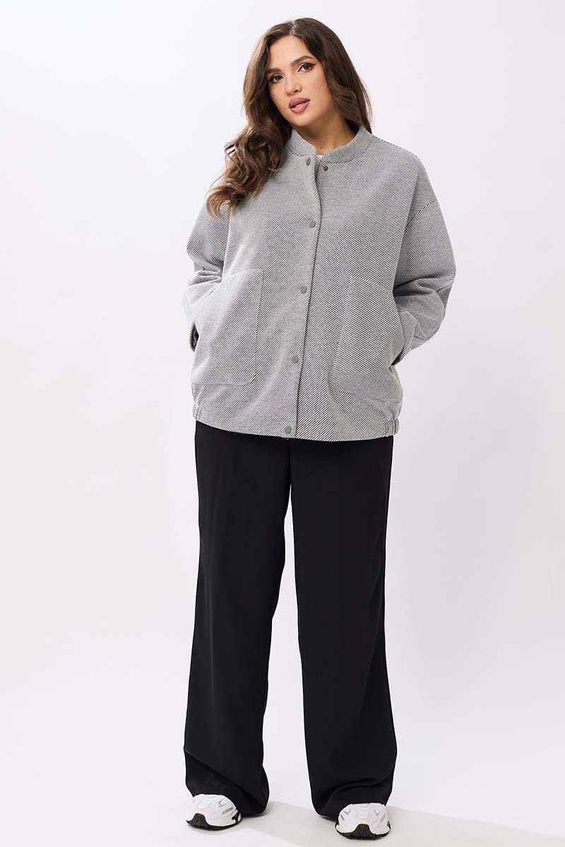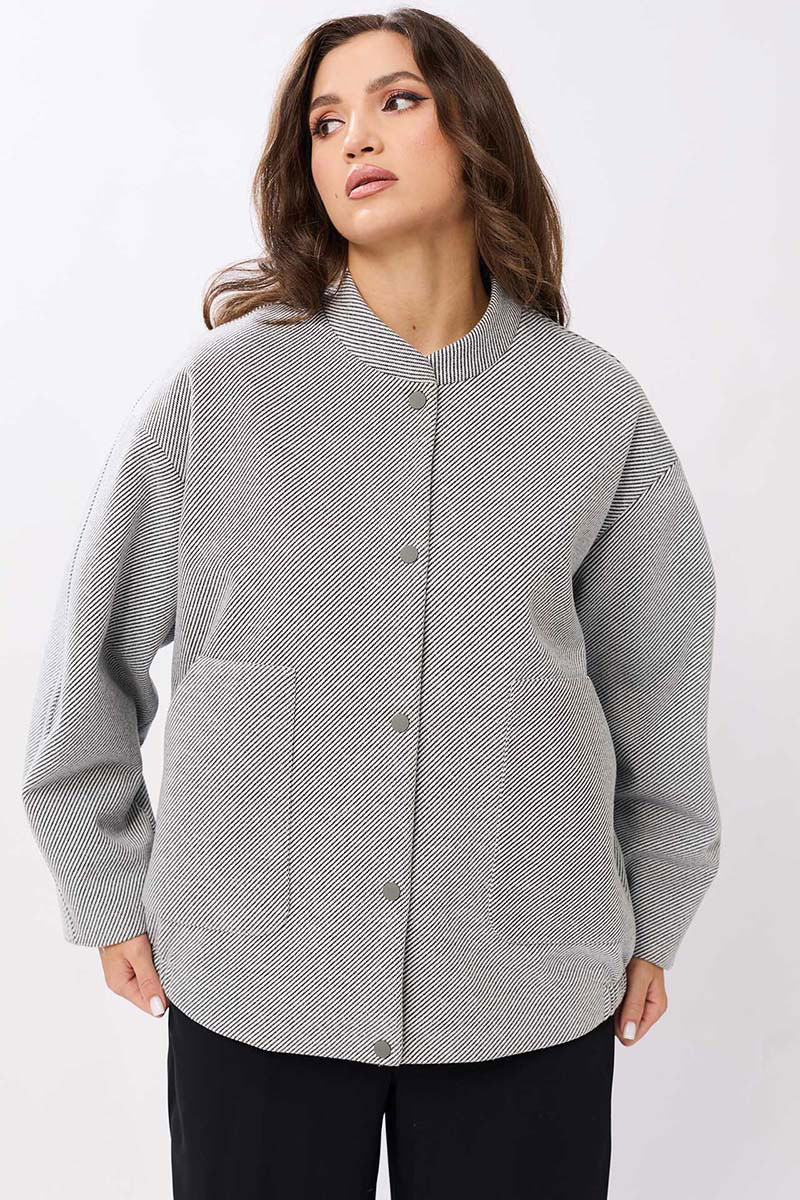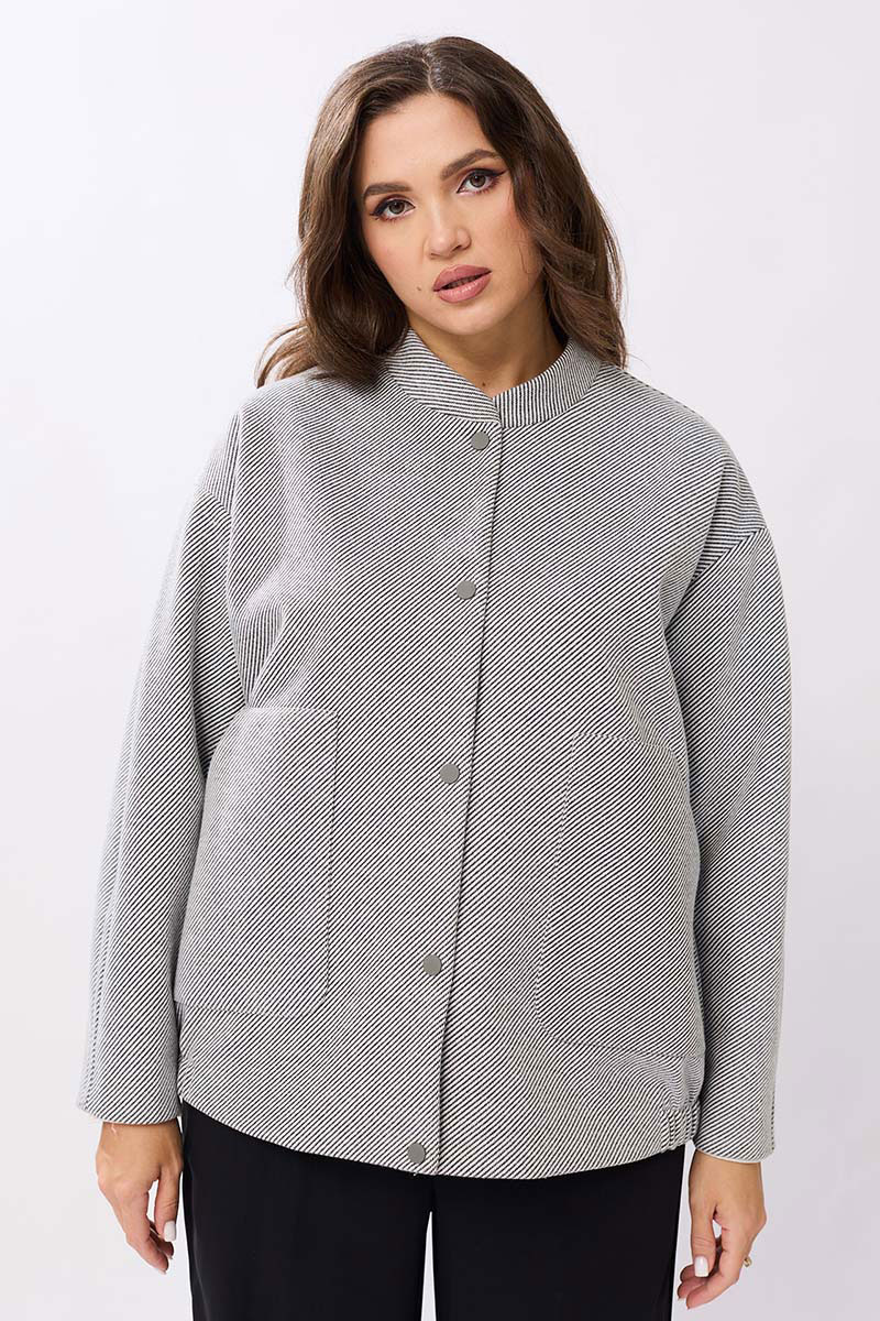 Женский жакет выполнен из мягкой, пальтовой ткани что придаёт изделию универсальность и комфорт. Воротник-стойка. Застёжка: на пробивные кнопки. Рукава со спущенной проймой втачной, двухшовный. В изделии предусмотрены накладные карманы на передней части. Эластичная резинка по нижнему краю жакета создаёт лёгкую сборку, что подчёркивает силуэт и обеспечивает дополнительное удобство. Жакет на подкладке.