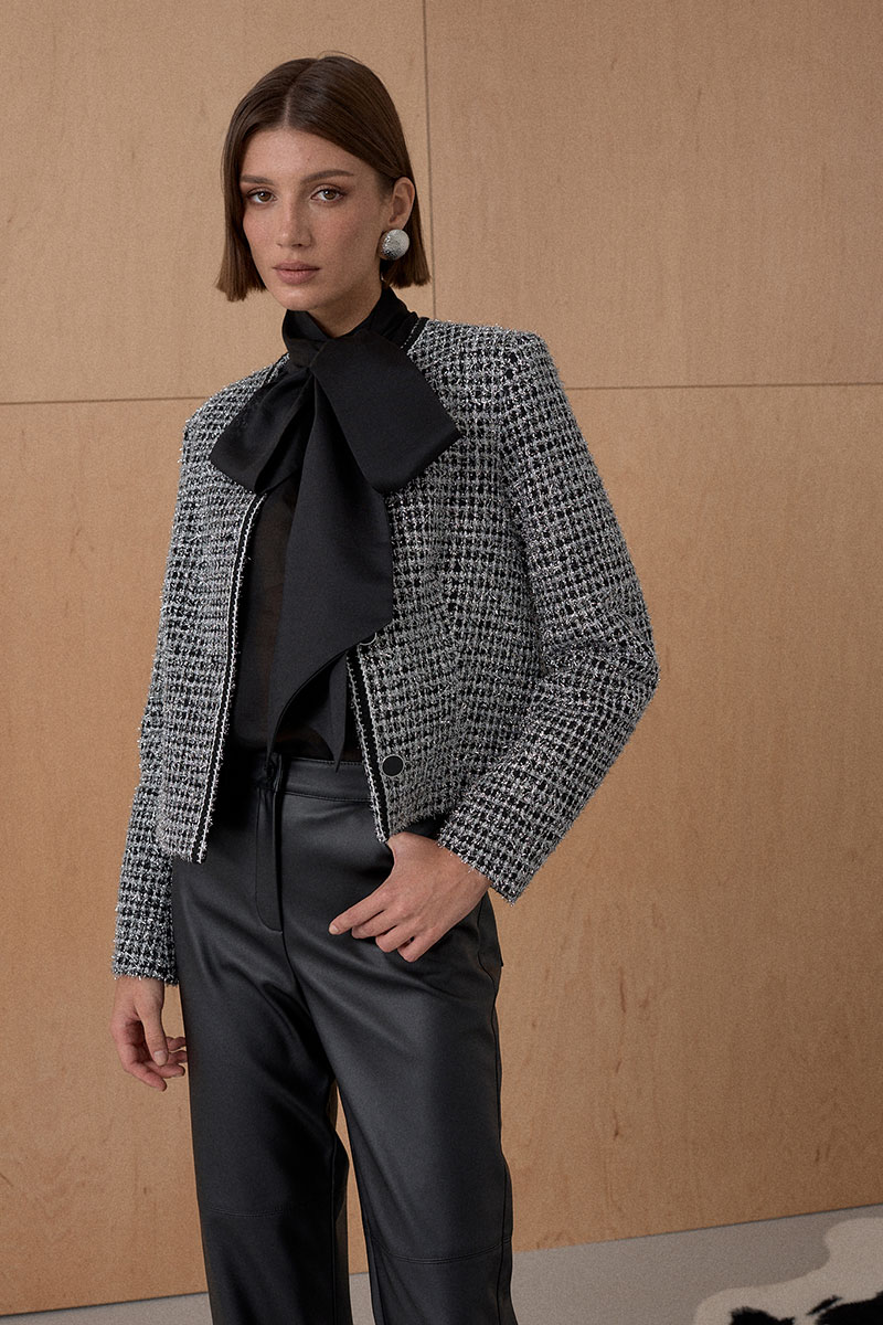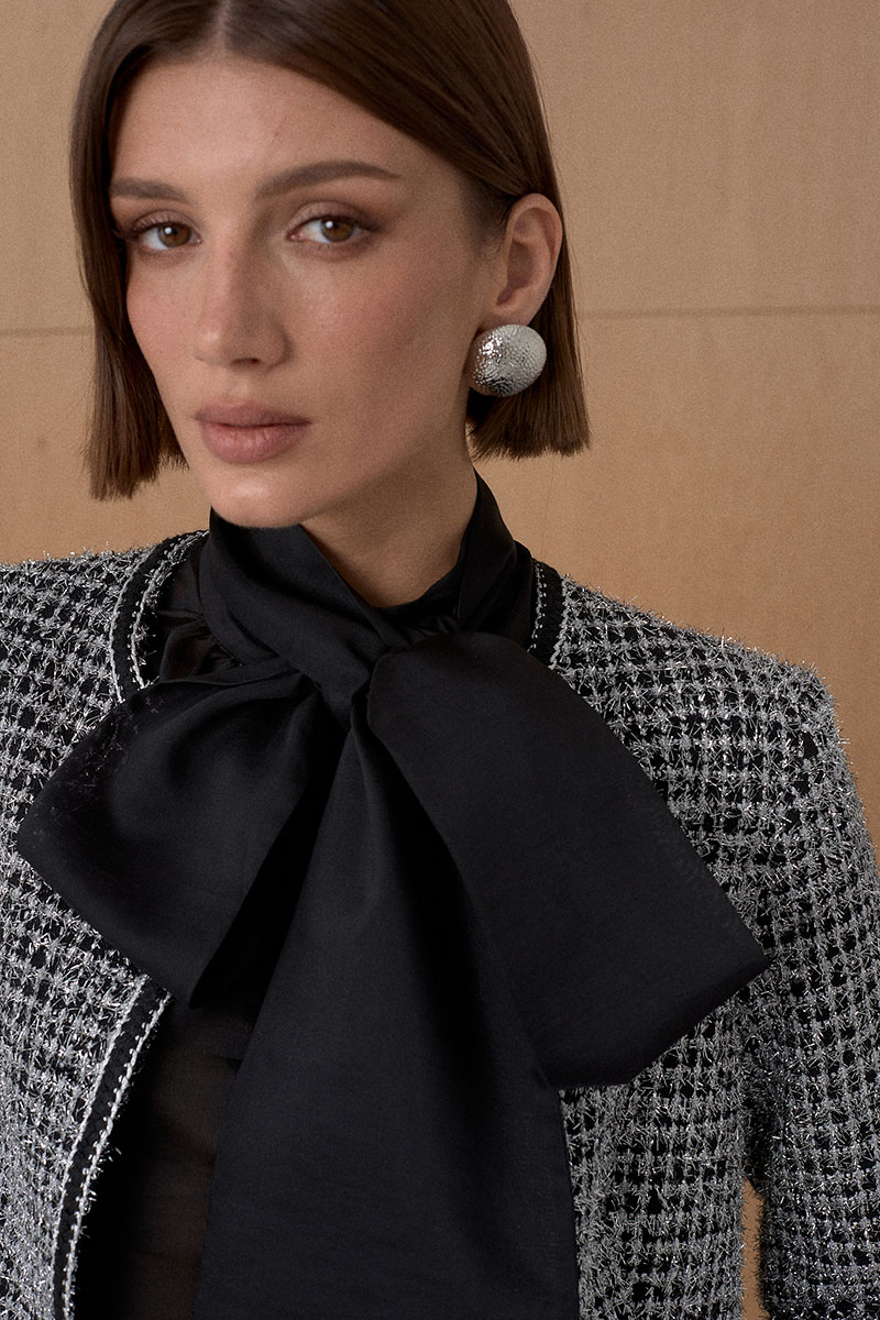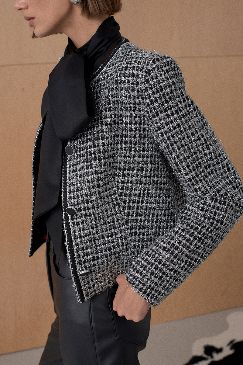 Жакет из жаккардового полотна с добавлением люрексной нити. Дизайн ткани выполнен по индивидуальному заказу нашего бренда на европейских текстильных фабриках.