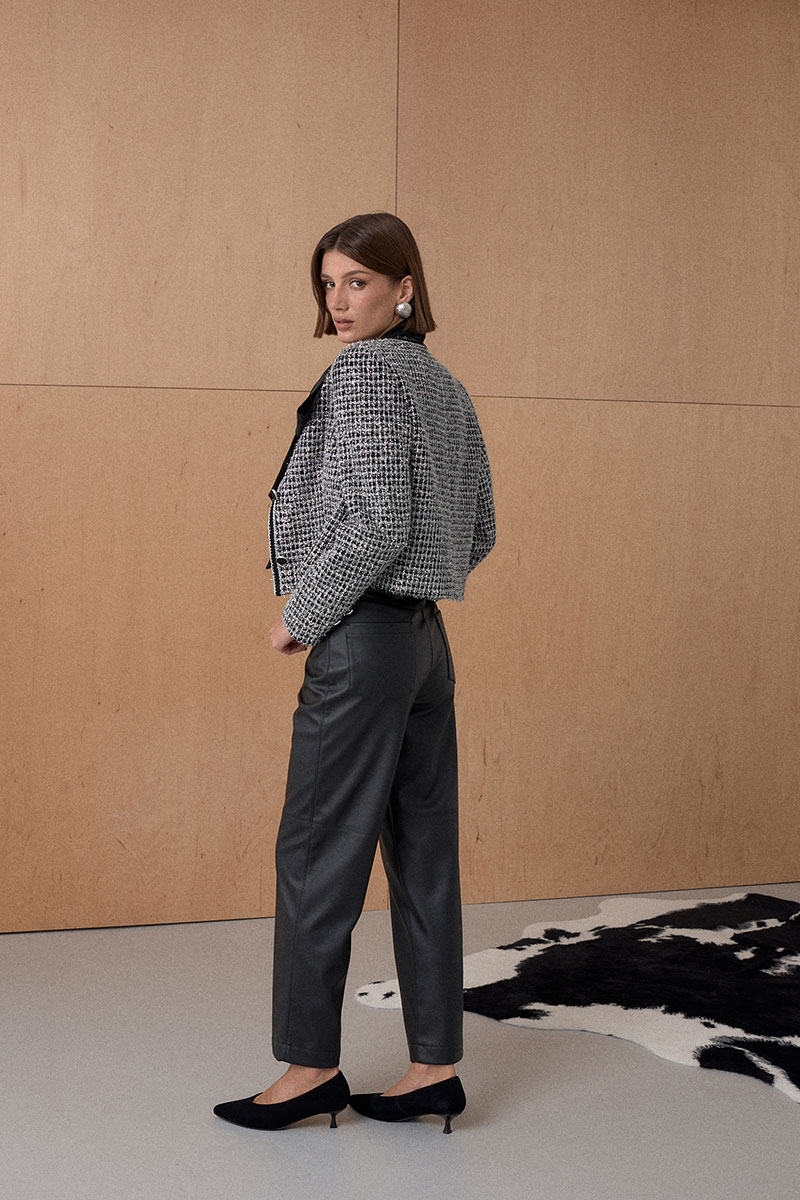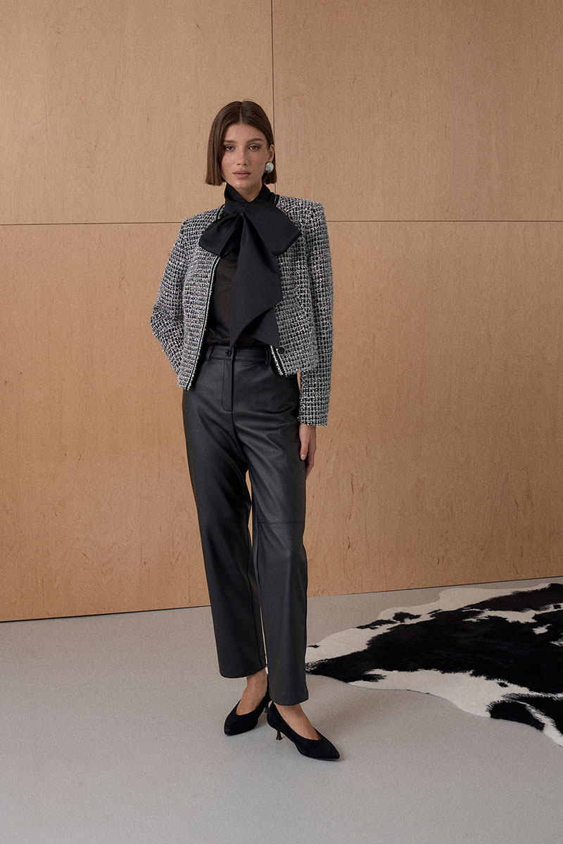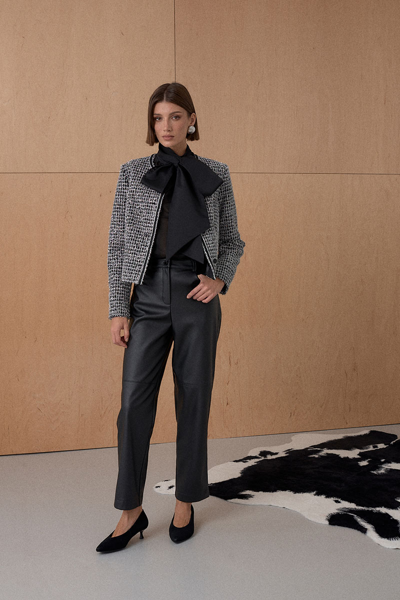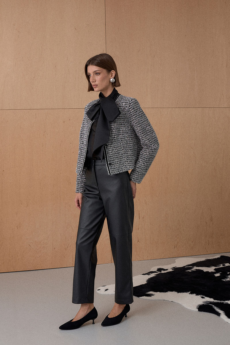 Жакет из жаккардового полотна с добавлением люрексной нити. Дизайн ткани выполнен по индивидуальному заказу нашего бренда на европейских текстильных фабриках.