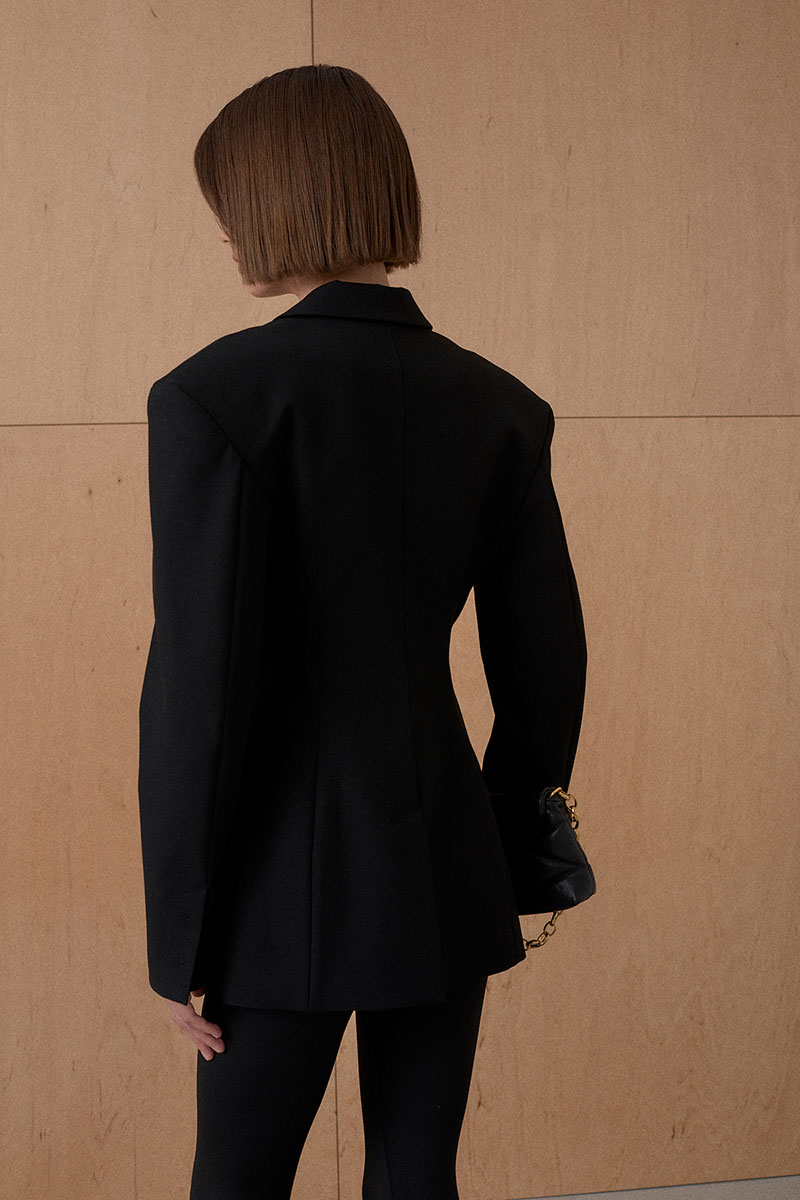 Жакет из формообразующей костюмной ткани. Усиленная и расширенная форма плеча. Приталенный. Двубортный.