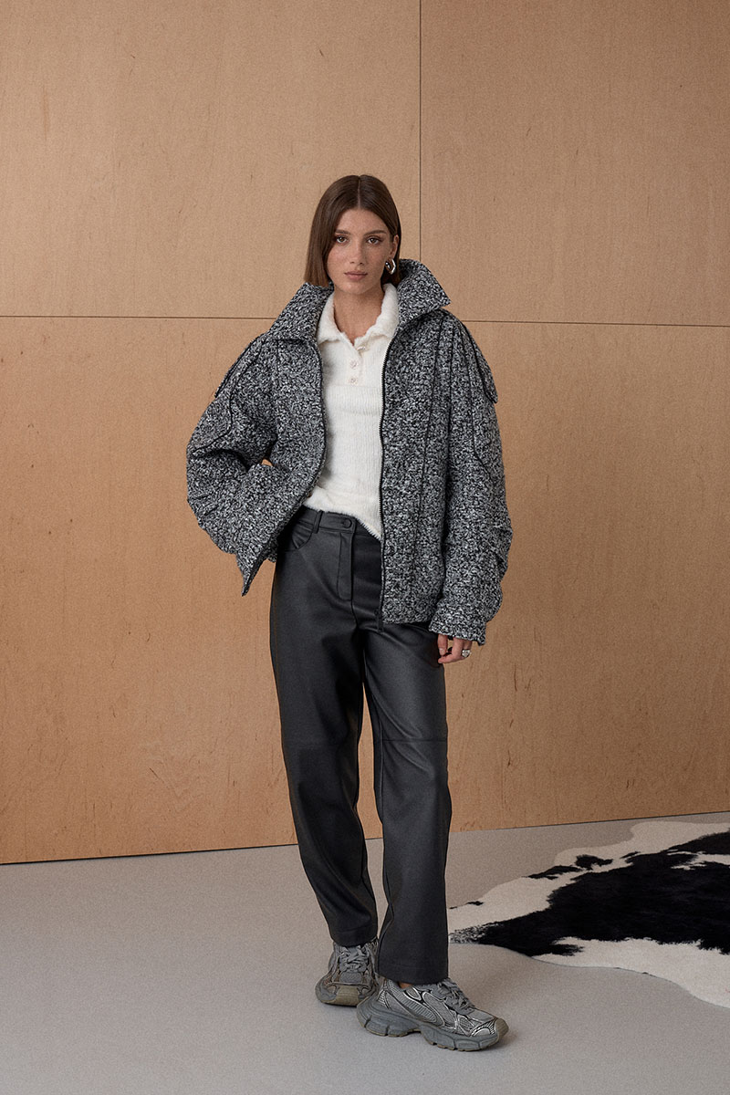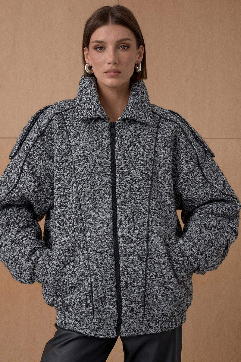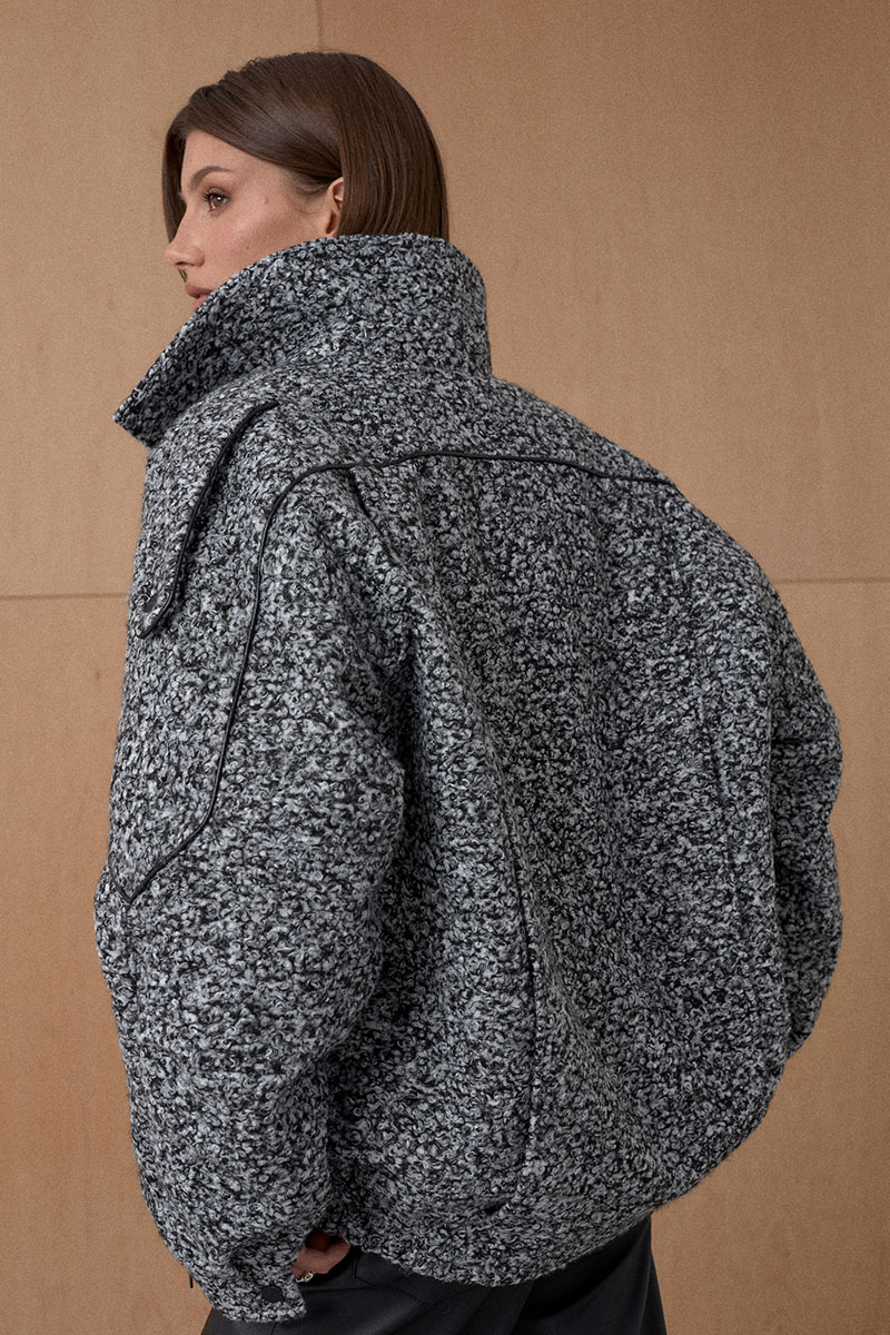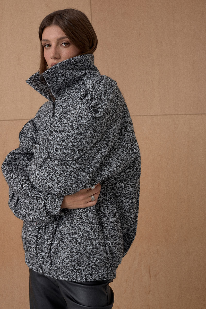 Жакет Oversize. Кожаный кант подчеркивает интересное конструктивное решение. По низу резинка. На утеплителе. Температурный режим до +5.