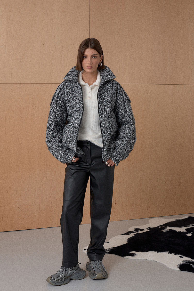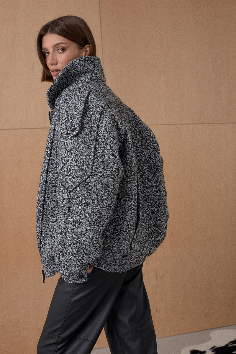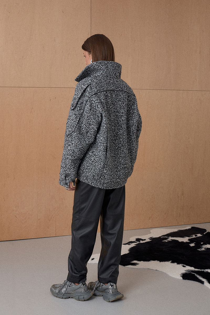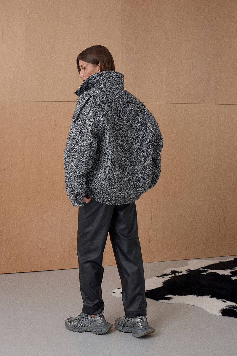 Жакет Oversize. Кожаный кант подчеркивает интересное конструктивное решение. По низу резинка. На утеплителе. Температурный режим до +5.