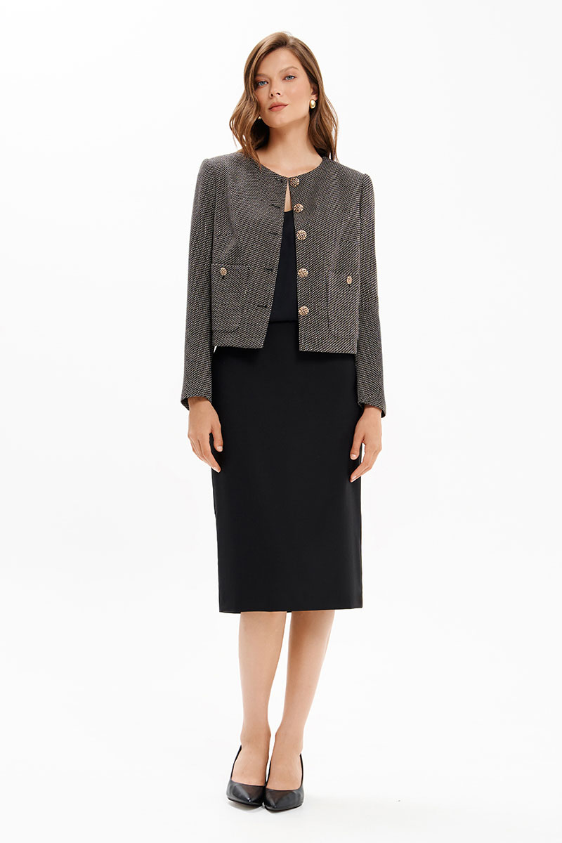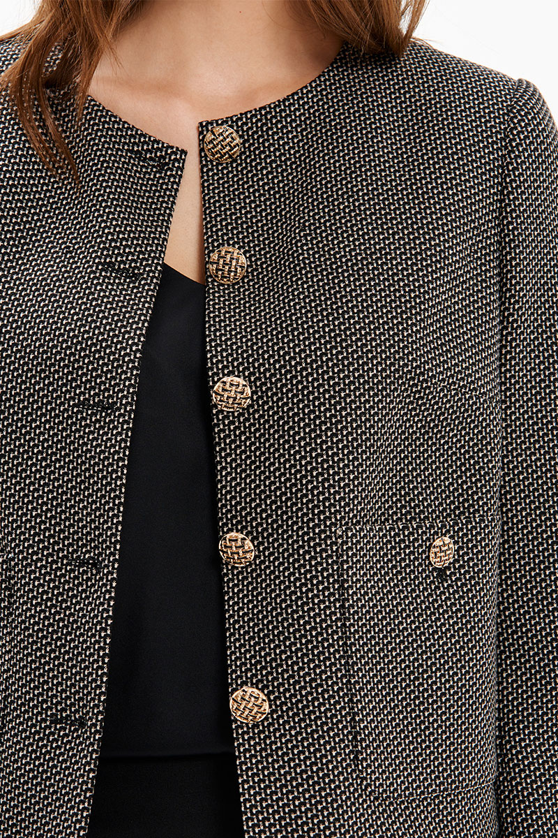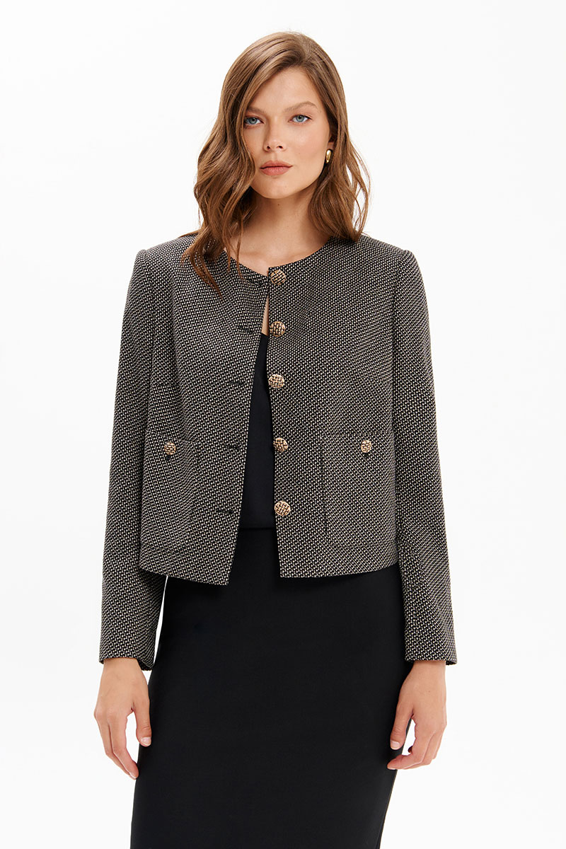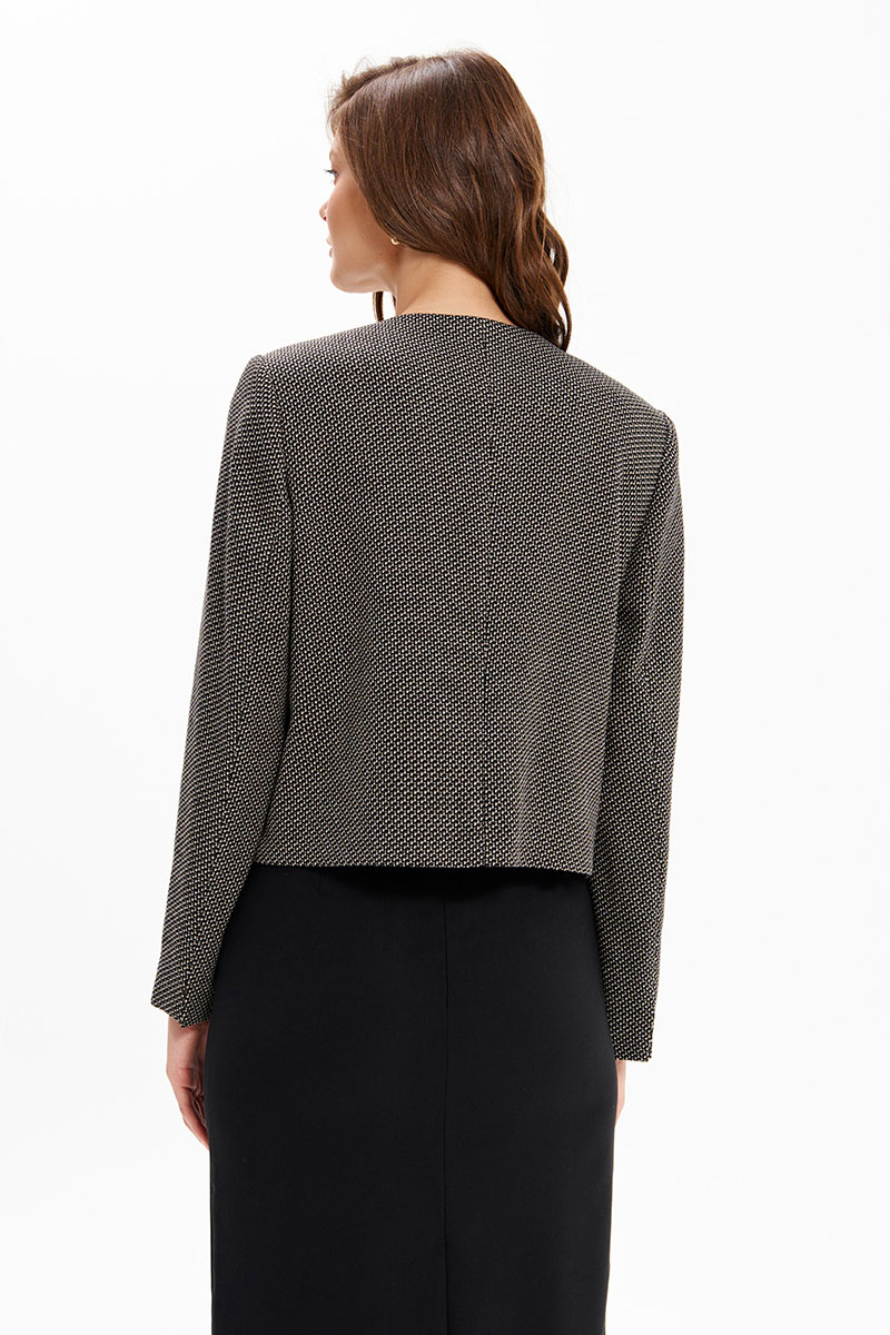 Женский укороченный жакет от бренда FRIDAY by NELVA в эксклюзивном черно-кремовом цвете «джакарт»! Эта модель задаcт тон вашему гардеробу, предлагая идеальный баланс элегантности и дерзкой современности. Укороченный крой жакета подчеркивает талию и визуально вытягивает силуэт, создавая утонченный и женственный образ. Сочетание глубокого черного и нежного кремового оттенков в изысканном узоре делает эту модель невероятно универсальной: она легко комбинируется с брюками и джинсами для офисного стиля, а также с платьями и юбками для создания вечернего лука. Жакет выполнен из качественного материалов, который гарантирует комфорт и сохраняет безупречный вид напротяжение всего дня. Обновите свой стиль с помощью этого изделия от FRIDAY by NELVA — сделайте выбор в пользу безупречного качества и актуального дизайна. С любовью и заботой о Вас, команда брендов NELVA и FRIDAY by NELVA!
