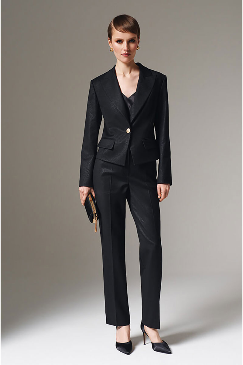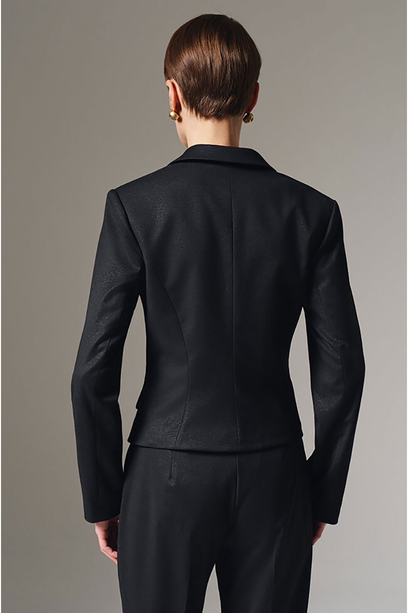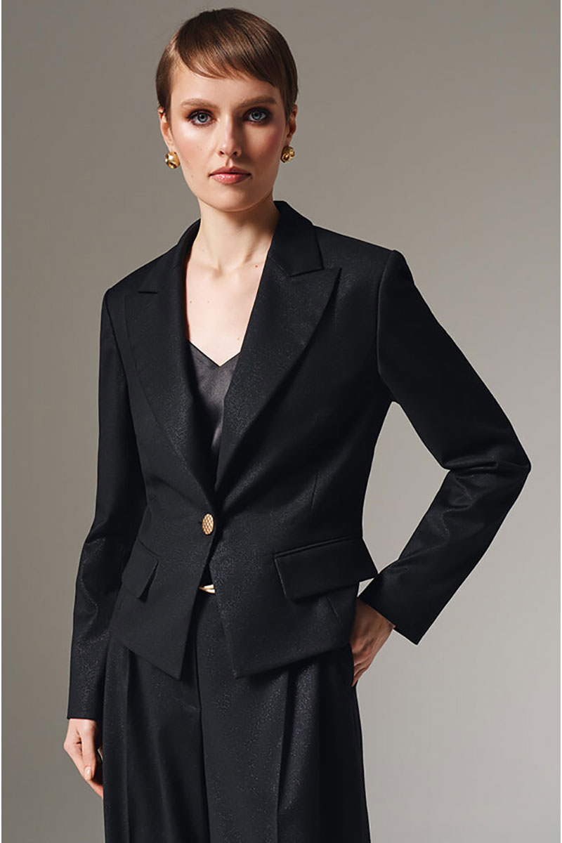Укороченный однобортный жакет премиального качества. Изделие безупречного дизайна, изготовленное из роскошного костюмного полотна, которое подарит вашему стилю исключительность и престиж. Этот жакет выполнен из костюмного полотна с эффектом мерцания. Отложной воротник с лацканами обеспечивает элегантность и универсальность в сочетании с любыми нарядами. Застежка выполнена на фактурную пуговицу. Спереди имитация карманов с клапанами. Подкладка украшена оригинальным дизайнерским принтом, который делает изделие уникальным и привлекательным даже изнутри. Однобортный жакет станет вашей незаменимой инвестицией в совершенный внешний вид и успешный имидж. Отличный выбор для уверенных в себе женщин, желающих выделяться среди остальных своей непревзойденностью и вкусом. С любовью и заботой о Вас, команда бренда NELVA!