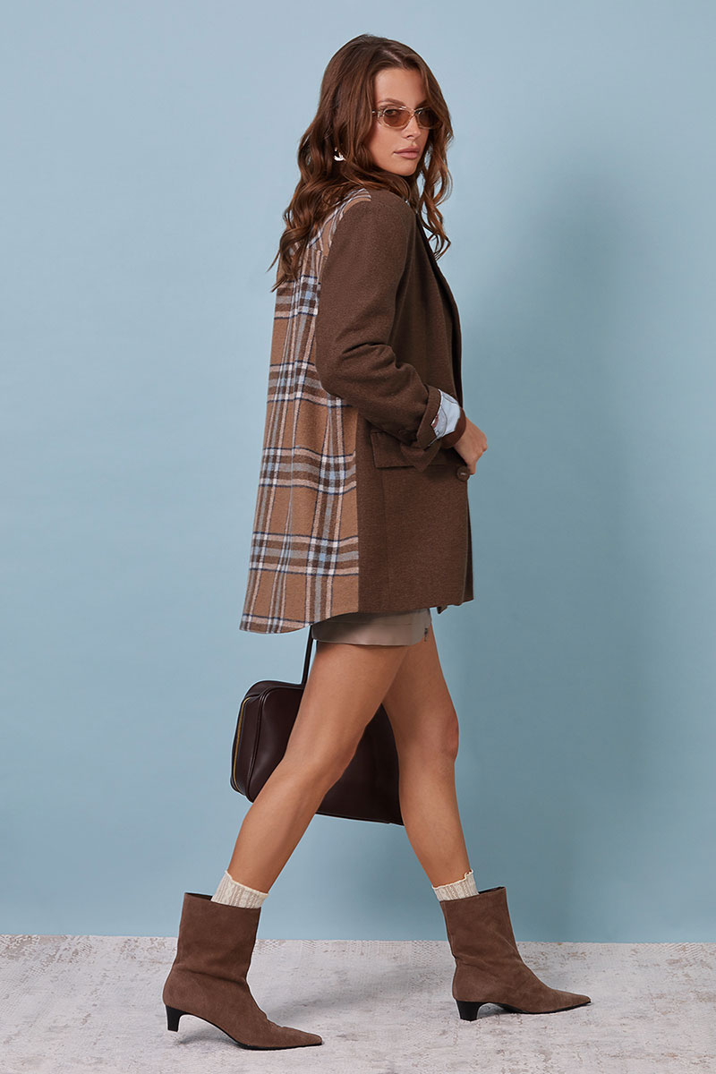 Стильный расслабленный жакет прямого силуэта на вискозной авторской подкладке. Изделие комбинированное. Спереди выполнен в виде жакета, сзади в виде рубашки. Изделие с двубортной застежкой на петли и пуговицы. Длина до середины бедра. Воротник пиджачного типа. На полочках нагрудные вытачки, прорезные карманы в рамку и клапаны. Борта прямые. Спинка прямая с отрезной кокеткой. Втачной длинный рукав со шлицей и декоративными петлями и пуговицами.