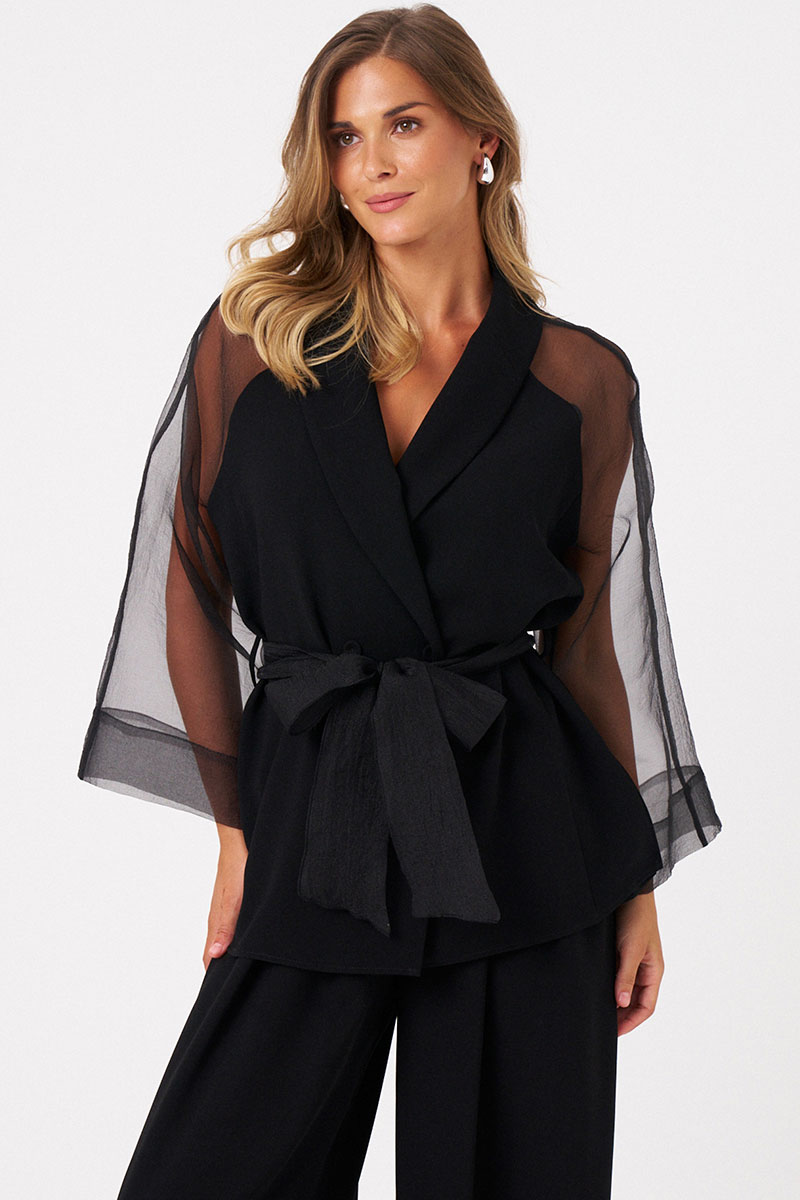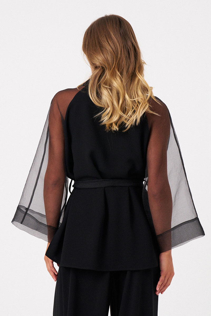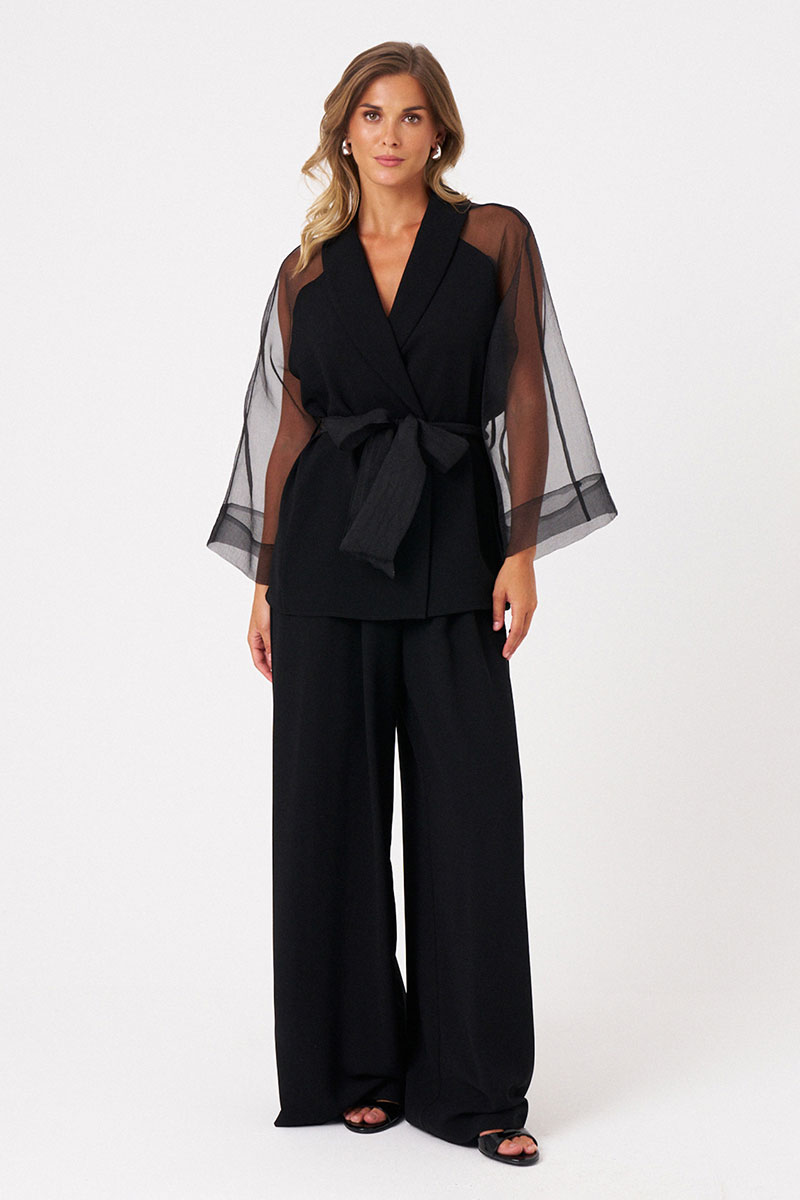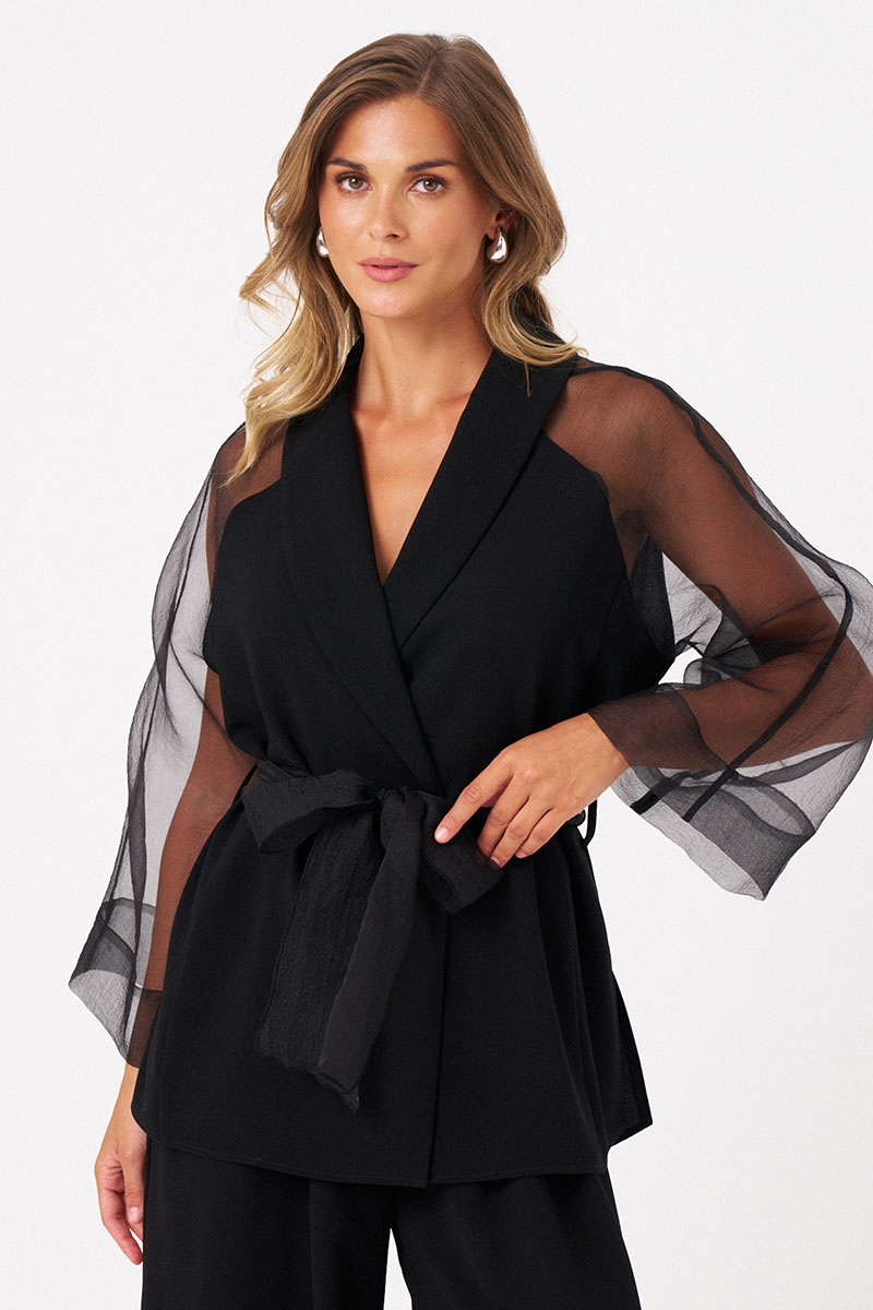 Женский жакет из струящейся ткани, идеально подходящий для торжественных случаев. Модель выполнена с центральной бортовой застежкой на обметанные петли и пуговаицы, что придает ей аккуратный и элегантный вид. Передняя часть украшена двумя рельефами, идущими от проймы до линии низа, что создает интересные линии и добавляет объемности силуэту. В боковых швах расположены небольшие разрезы, обеспечивающие свободу движений и комфорт при носке. Также в боковых швах вставлены шлевки, позволяющие дополнительно закрепить пояс или использовать их для декоративных целей. Горловина оформлена воротником-шаль, придающим образу мягкость и изящность. Рукава -- реглан, выполнены из прозрачной ткани добавляют легкости и романтичности образу. Жакет комплектуется поясом, который подчеркивает талию и создает женственный силуэт. Пояс также из прозрачной ткани.