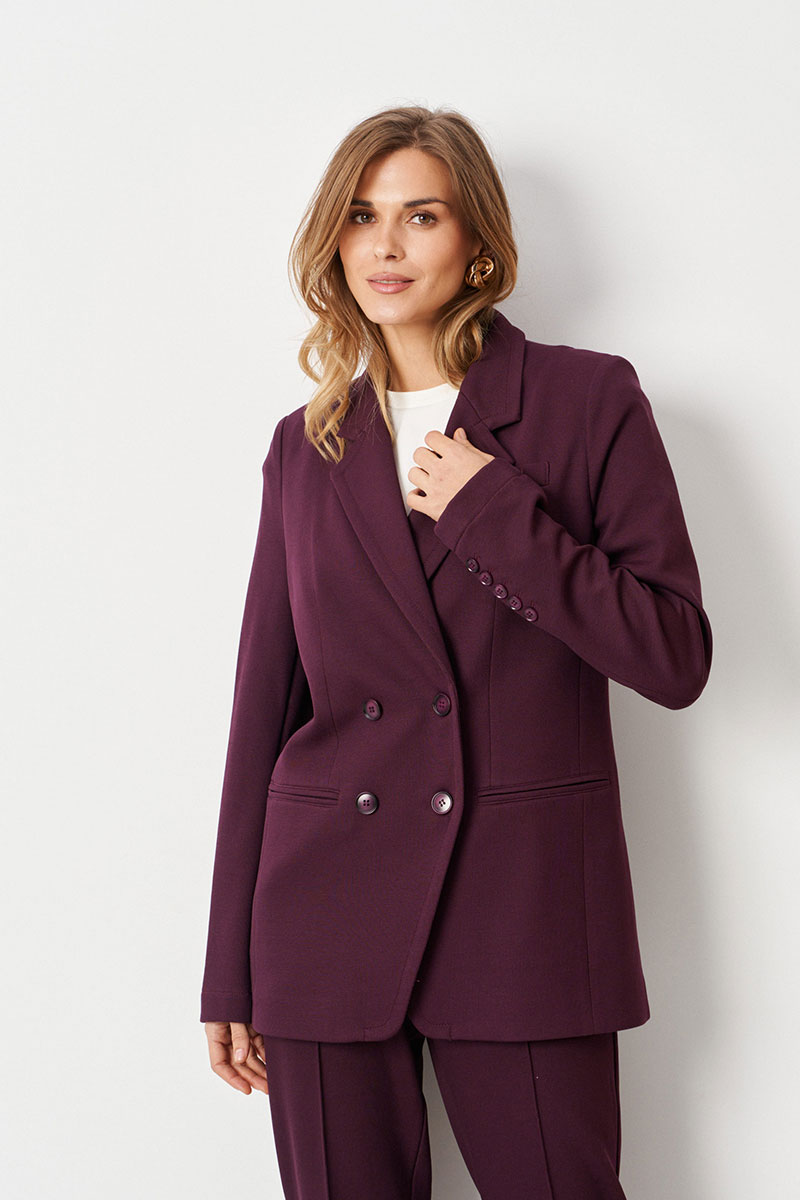 Жакет женский из трикотажного полотна для повседневной носки и деловых встреч. Жакет полуприлегающего силуэта. Жакет двубортный, застежка на две обметанные петли и две пуговицы с криволинейной линией борта. Перед имеет нагрудный карман с листочкой. По переду имеется прорезной карман с двумя обтачками и две талиевые вытачки. Спинка со средним швом и двумя рельефами, идущими от линии плеча до низа изделия. Жакет имеет отрезной бочок. Горловина обработана пиджачным воротником. Рукава двухшовные со шлицей по низу рукава, на шлице имеются четыре пуговицы. Жакет с поливискозной подкладкой по переду. Данное изделие станет отличным дополнением к любому гардеробу. И обязательно осчастливит его обладательницу своим прекрасным фасоном.