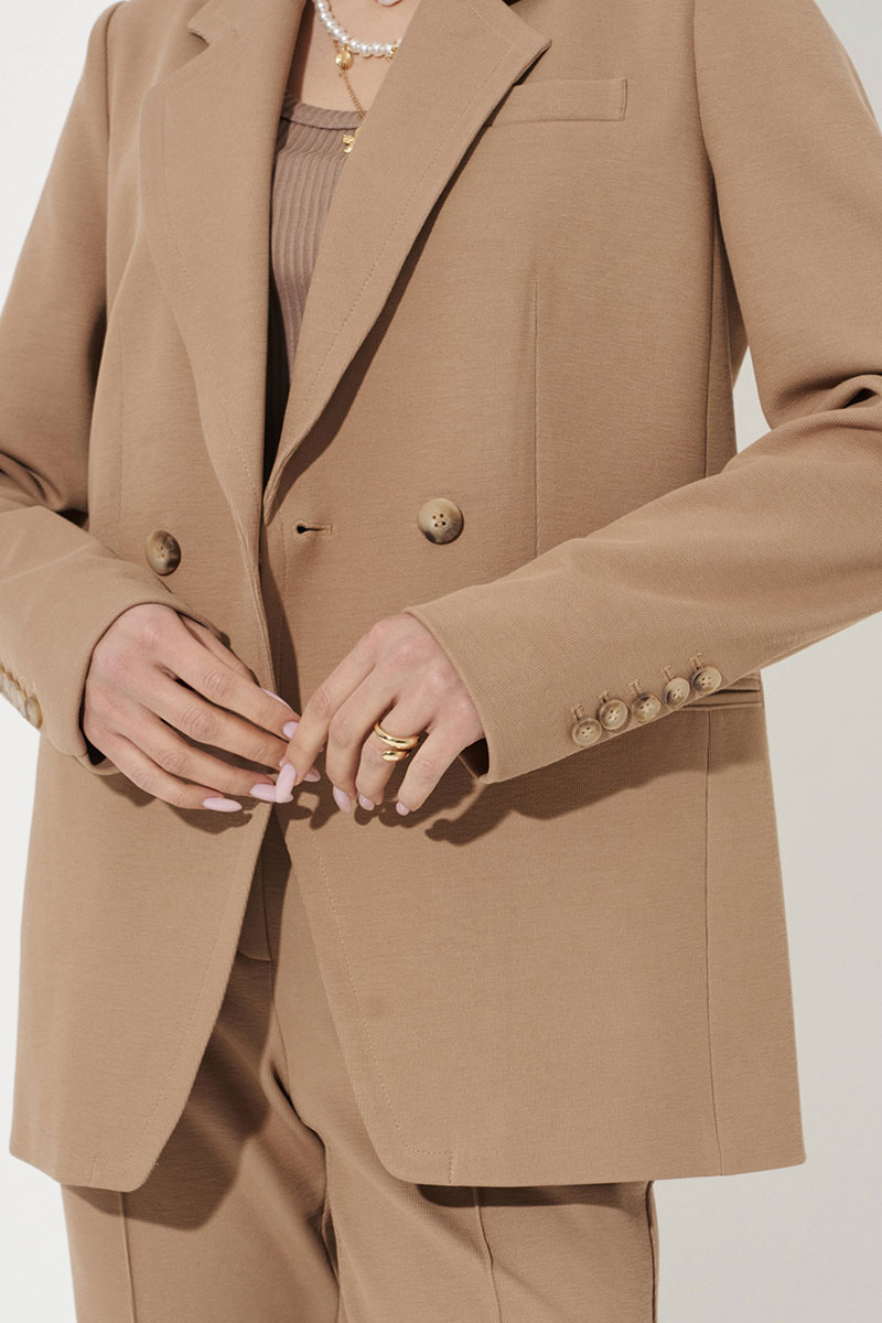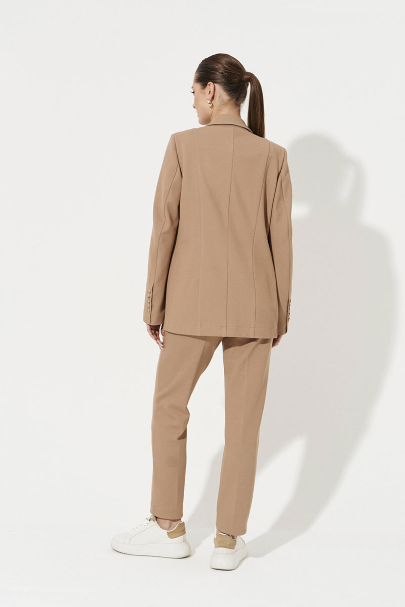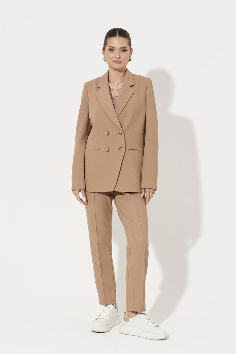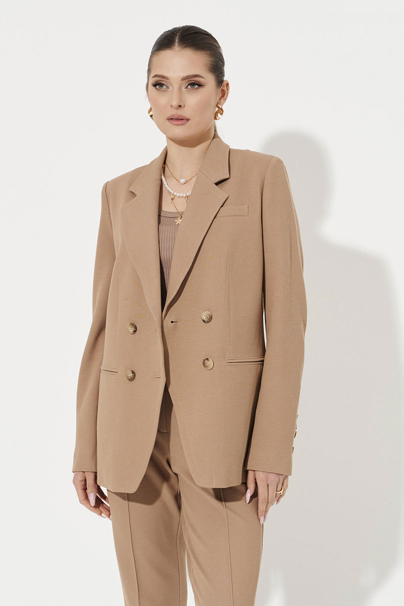 Жакет женский из трикотажного полотна для повседневной носки и деловых встреч. Жакет полуприлегающего силуэта. Жакет двубортный, застежка на две обметанные петли и две пуговицы с криволинейной линией борта. Перед имеет нагрудный карман с листочкой. По переду имеется прорезной карман с двумя обтачками и две талиевые вытачки. Спинка со средним швом и двумя рельефами, идущими от линии плеча до низа изделия. Жакет имеет отрезной бочок. Горловина обработана пиджачным воротником. Рукава двухшовные со шлицей по низу рукава, на шлице имеются четыре пуговицы. Жакет с поливискозной подкладкой по переду. Данное изделие станет отличным дополнением к любому гардеробу. И обязательно осчастливит его обладательницу своим прекрасным фасоном.