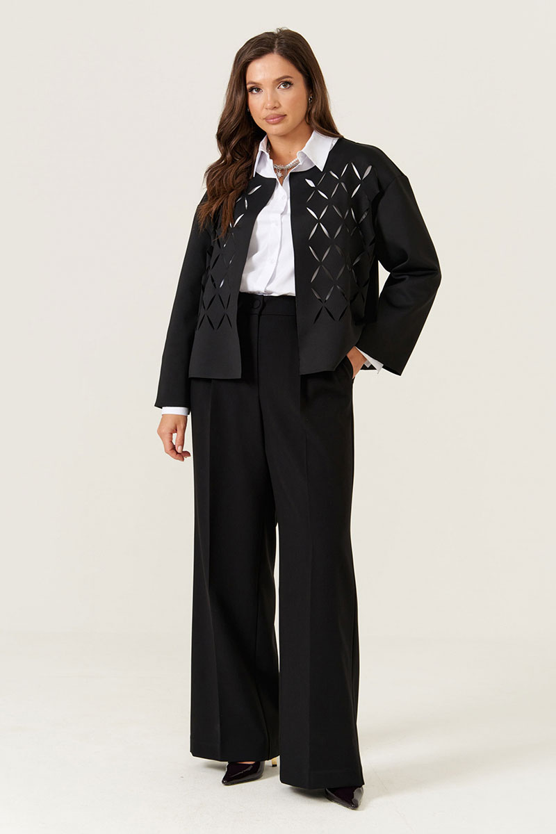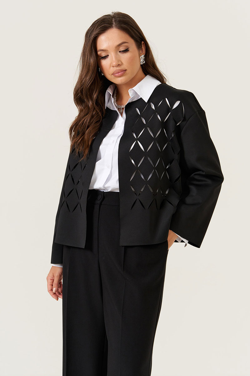 Жакет женский прямого силуэта из трикотажного полотна. Перед украшен перфорацией в виде узора, которая добавлят изюминку. Горловина круглая. Линия плеча слегка спущенна. Рукав прямой, длинный. Спинка без швов. Затёжки нет. По краю жакета проложенны отделочные строчки. Жакет без подкладки. Оригинальный вариант жакета.