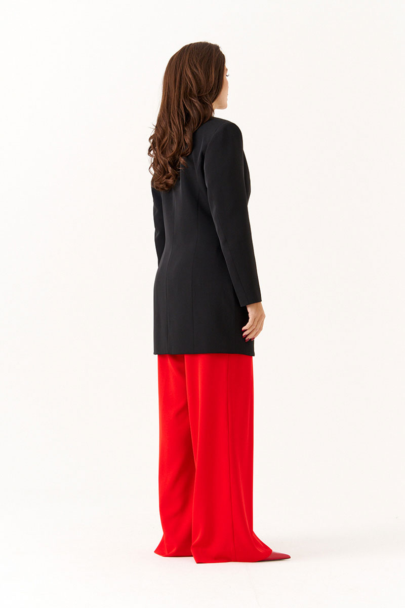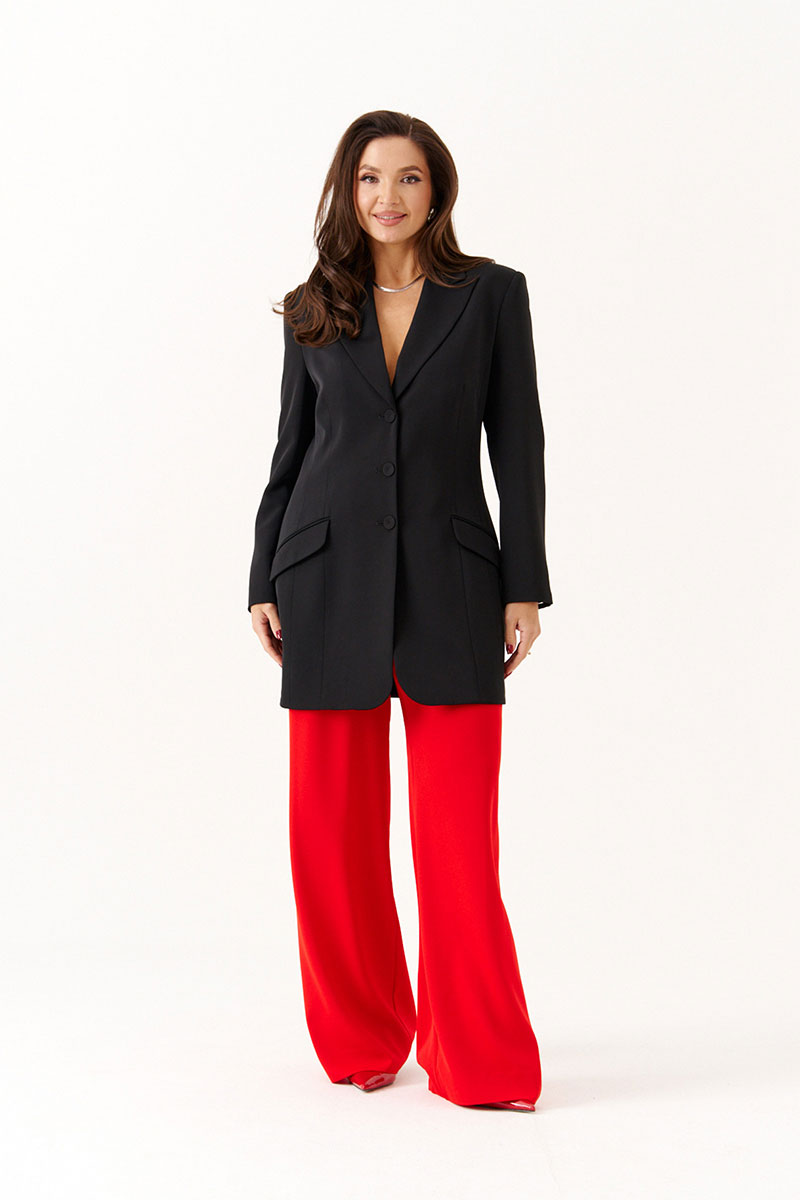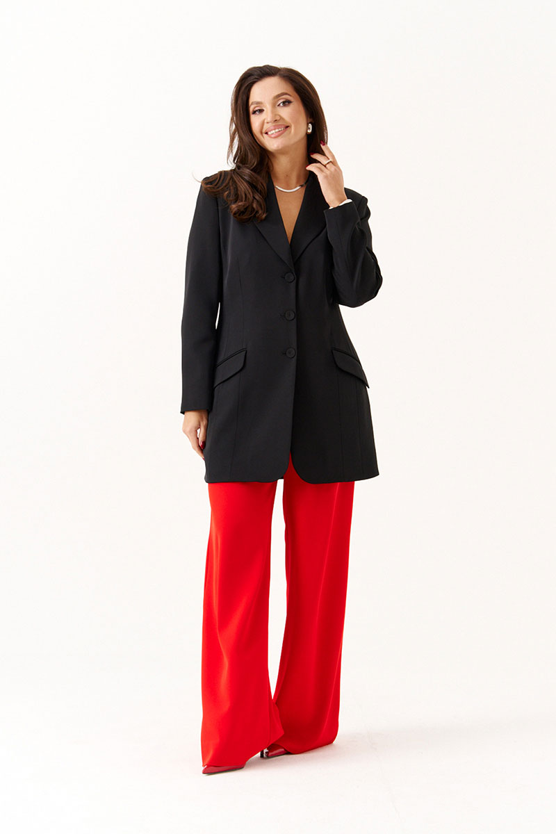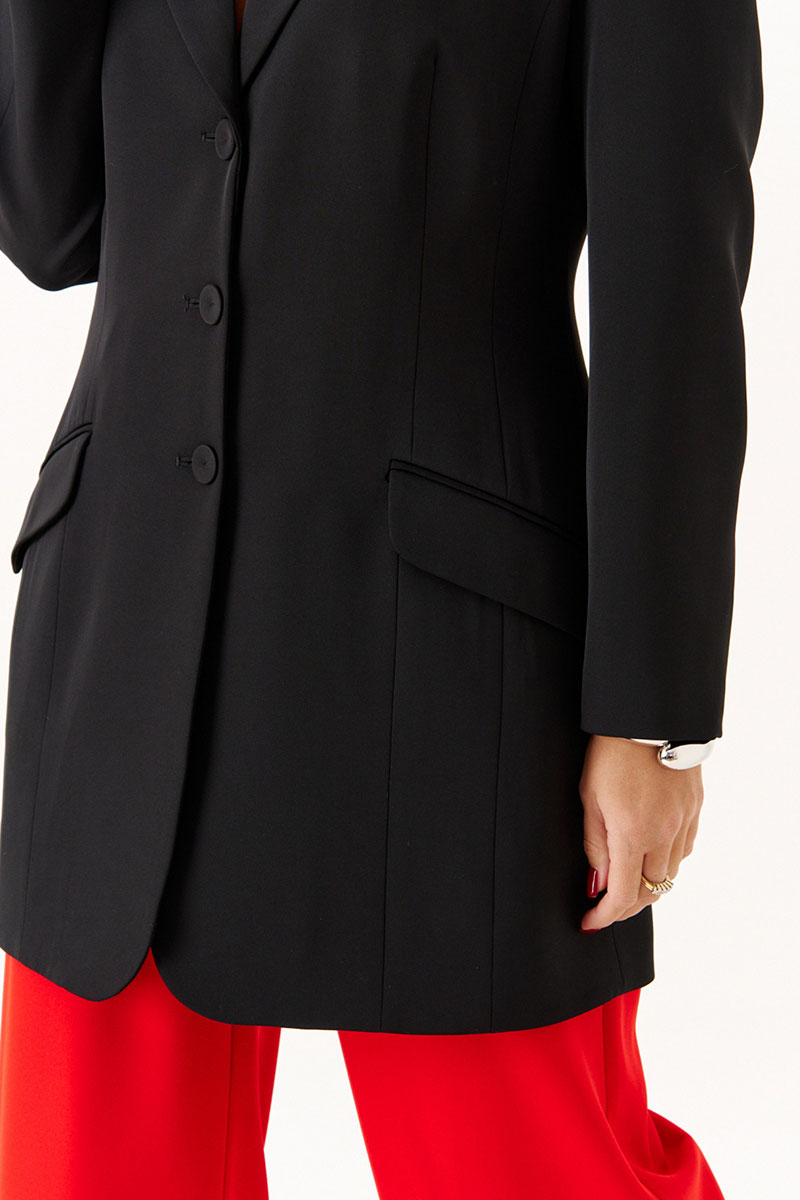 Элегантный черный жакет выполнен из мягкой поливискозной ткани высокого качества, обеспечивающей комфорт и отличный внешний вид. Модель с центральной застежкой на пуговицы, оформленной аккуратными обметанными петлями. Особенности кроя включают два рельефа и вытачки спереди, которые прекрасно подчеркивают фигуру, а также прорезные карманы с клапаном и двумя обтачками. Спинка со средним швом и двойными рельефами создаёт четкий силуэт. Классический пиджачный воротник и длинные втачные рукава делают жакет универсальным для различных образов. В комплект входит пояс на пряжке, позволяющий акцентировать талию. Модель полностью на поливискозной подкладке для дополнительного комфорта. Длина чуть ниже бедер — отлично подходит как для офисного стиля, так и для повседневной носки.
