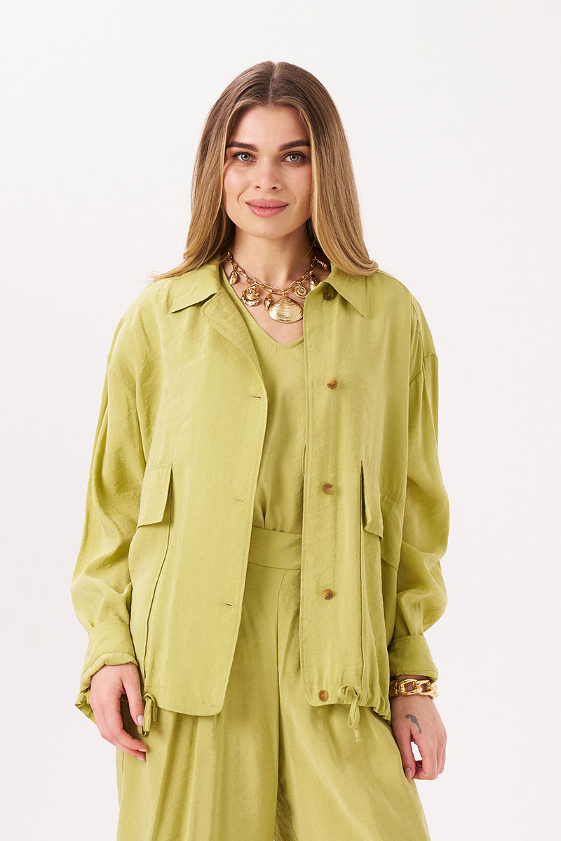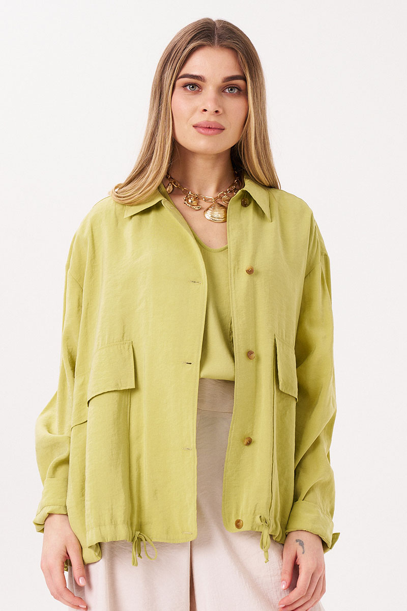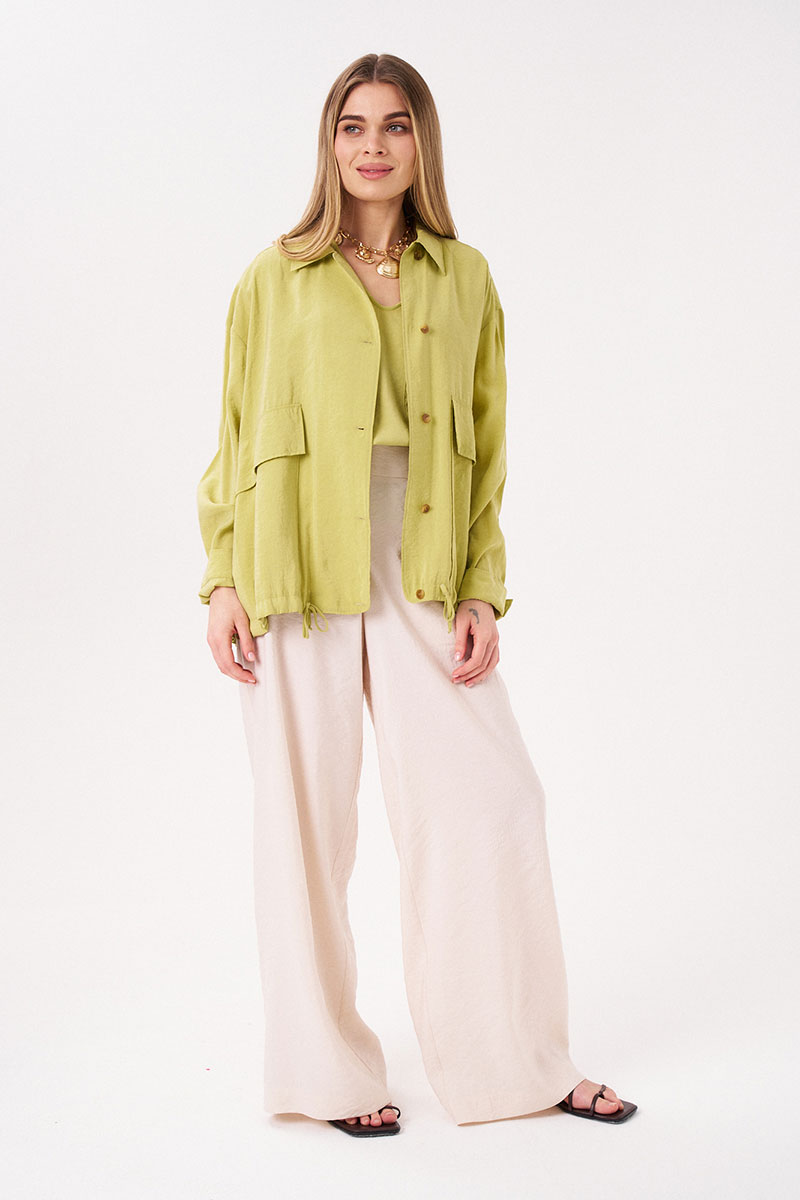 Жакет из вискозной ткани для повседневной носки. Жакет с втачным длинным рукавом оформленным притачной манжетой. Изделие с фронтальной застежкой на пуговицы, воротником- стойкой. По переду накладные карманы с клапанами. По спинке отрезная кокетка. Перед с кулисами по низу изделия. Длина классическая.