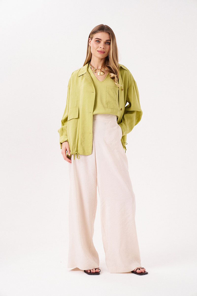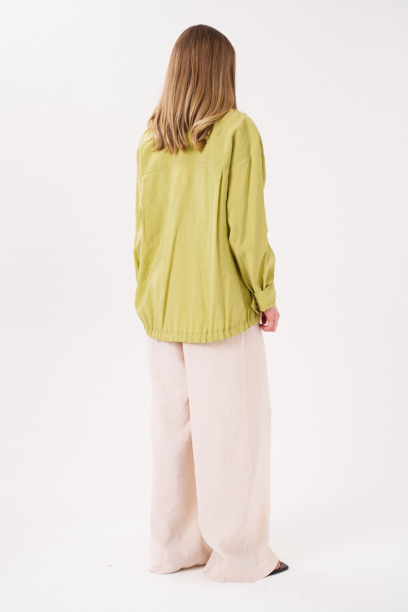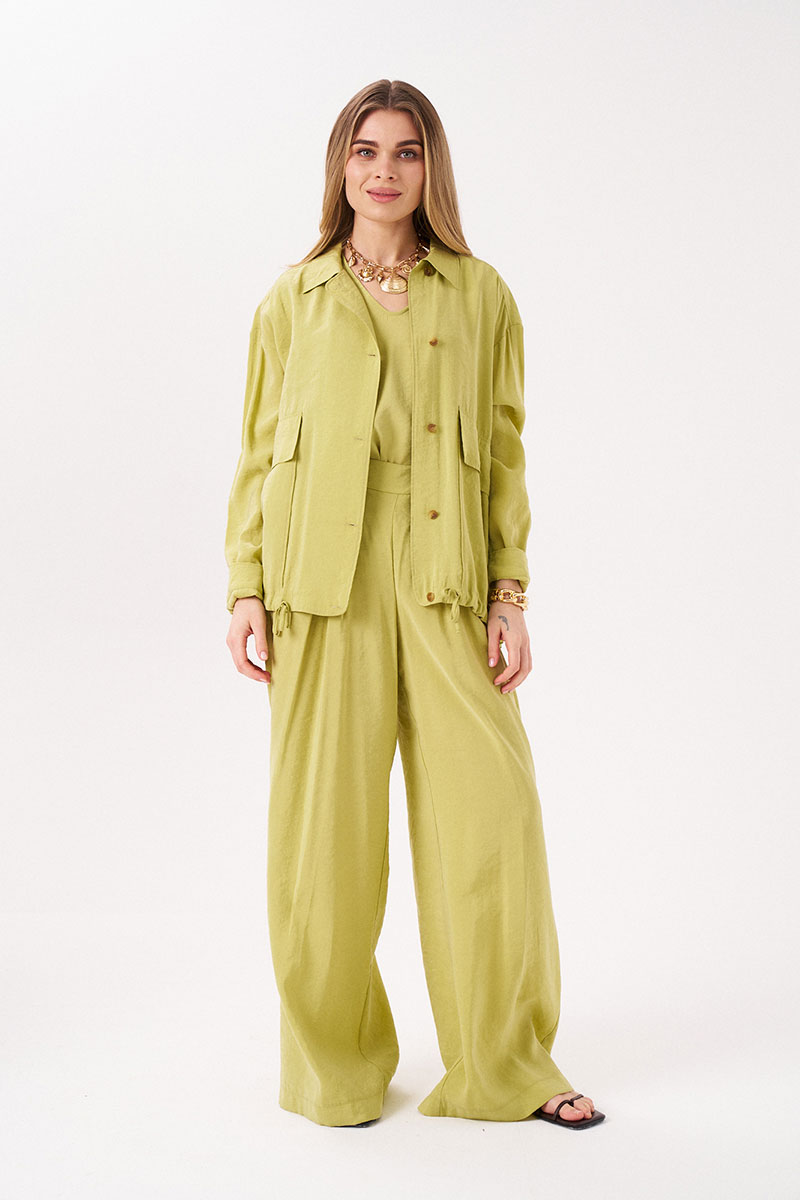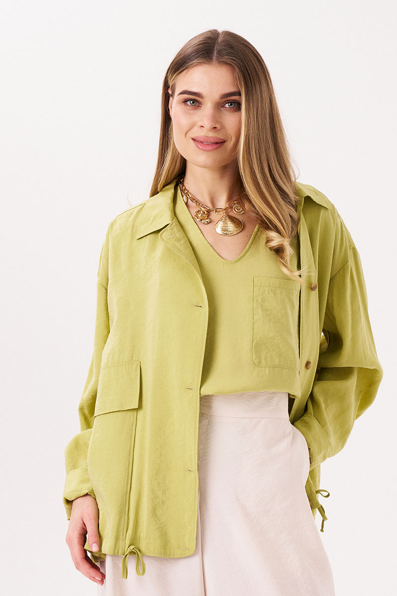 Жакет из вискозной ткани для повседневной носки. Жакет с втачным длинным рукавом оформленным притачной манжетой. Изделие с фронтальной застежкой на пуговицы, воротником- стойкой. По переду накладные карманы с клапанами. По спинке отрезная кокетка. Перед с кулисами по низу изделия. Длина классическая.