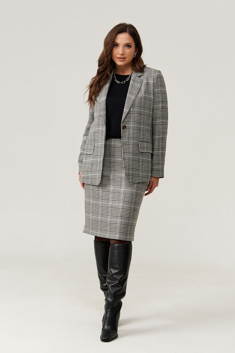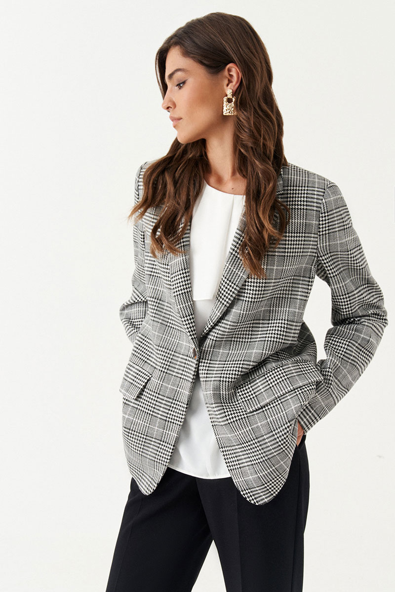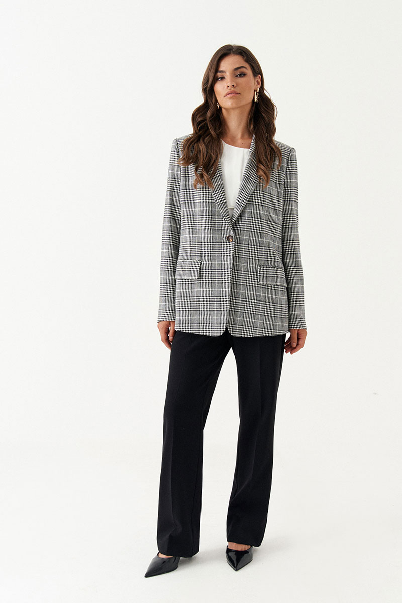 Этот жакет предназначен для повседневной носки и выполнен в классическом прямом силуэте. Застежка расположена по центральной бортовой линии и состоит из одной обметанной петли и одной пуговицы, что обеспечивает удобство и аккуратный внешний вид. Передняя часть украшена двумя карманами с клапанами, добавляющими функциональности и стилю. Горловина оформлена пиджачным воротником, придающим изделию элегантность. Рукава втачные, длинные, с низом, имитирующим шлицу, украшенным декоративными пуговицами — такой элемент добавляет изящества и декоративности. Внутри жакет подшит поливискозной подкладкой, что обеспечивает комфорт при носке и хорошую посадку. Длина изделия классическая, что делает его универсальным для различных ситуаций и сочетаний. Этот жакет отлично подойдет для повседневных образов, сочетаясь как с деловыми, так и с casual-луками.