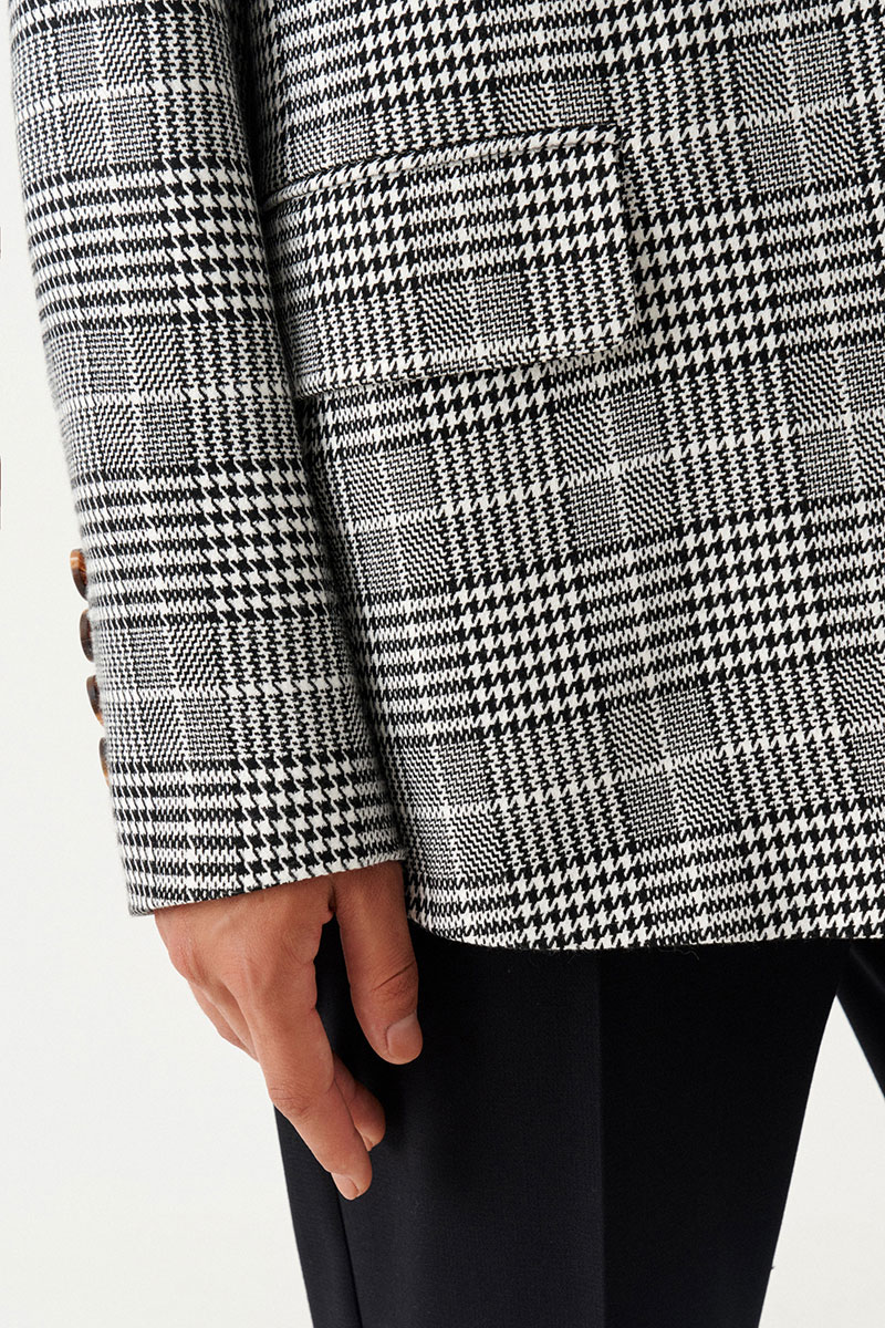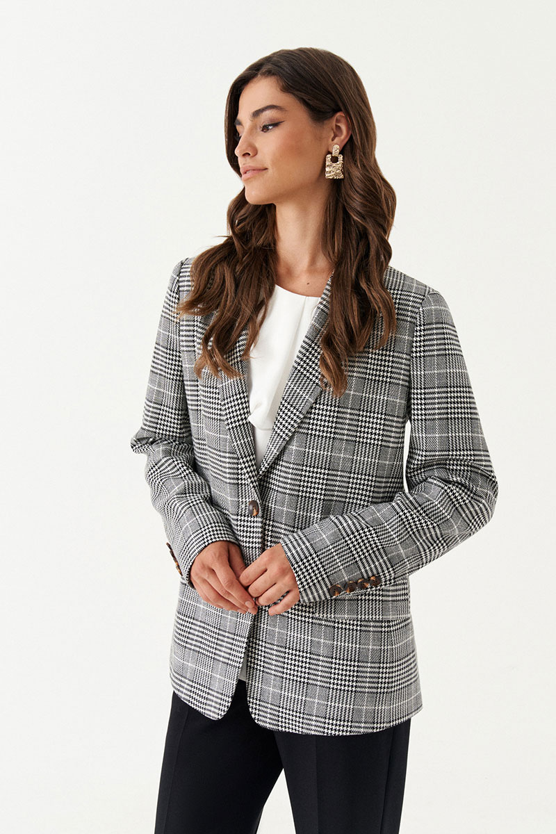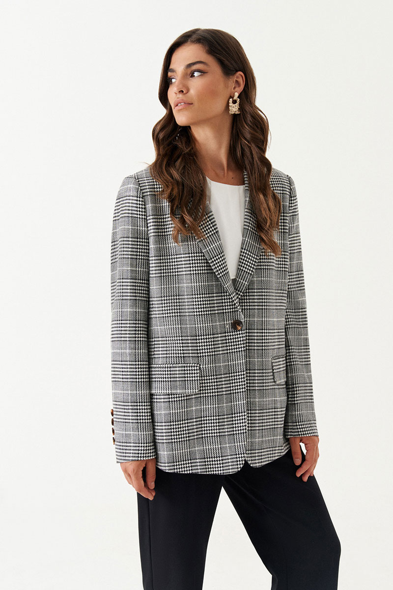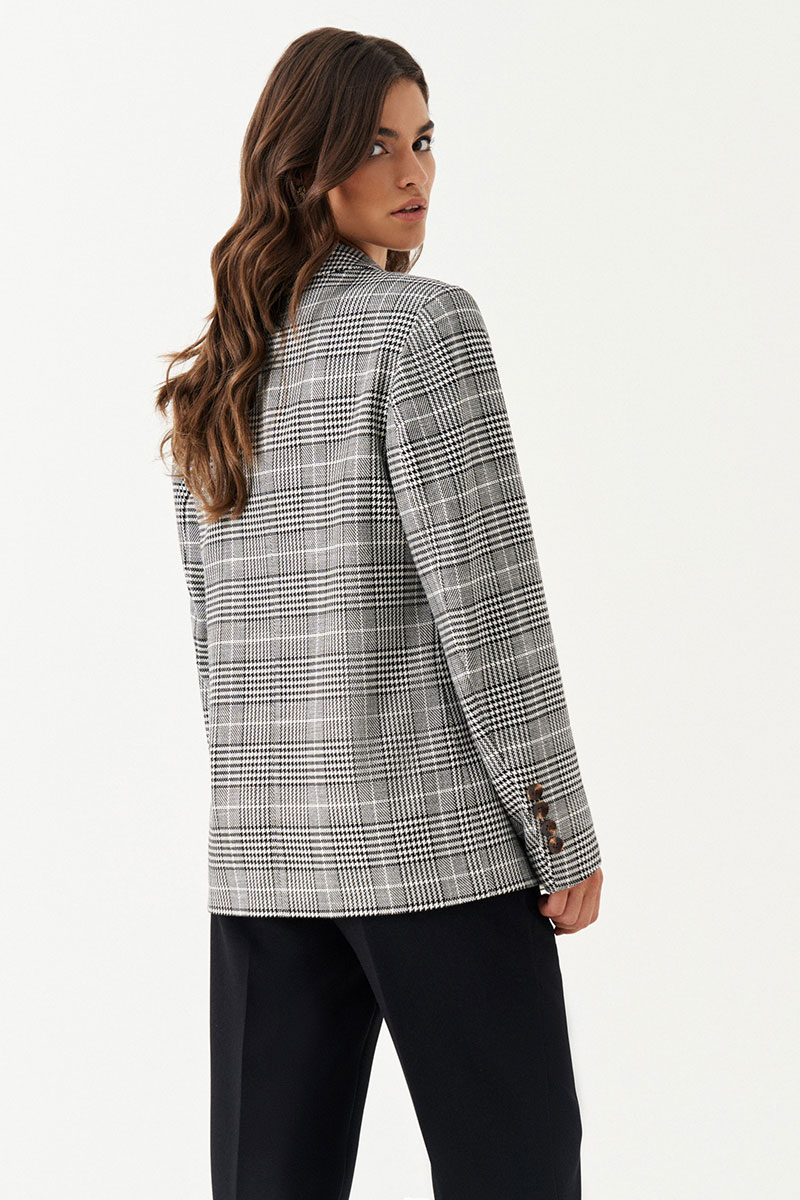 Этот жакет предназначен для повседневной носки и выполнен в классическом прямом силуэте. Застежка расположена по центральной бортовой линии и состоит из одной обметанной петли и одной пуговицы, что обеспечивает удобство и аккуратный внешний вид. Передняя часть украшена двумя карманами с клапанами, добавляющими функциональности и стилю. Горловина оформлена пиджачным воротником, придающим изделию элегантность. Рукава втачные, длинные, с низом, имитирующим шлицу, украшенным декоративными пуговицами — такой элемент добавляет изящества и декоративности. Внутри жакет подшит поливискозной подкладкой, что обеспечивает комфорт при носке и хорошую посадку. Длина изделия классическая, что делает его универсальным для различных ситуаций и сочетаний. Этот жакет отлично подойдет для повседневных образов, сочетаясь как с деловыми, так и с casual-луками.