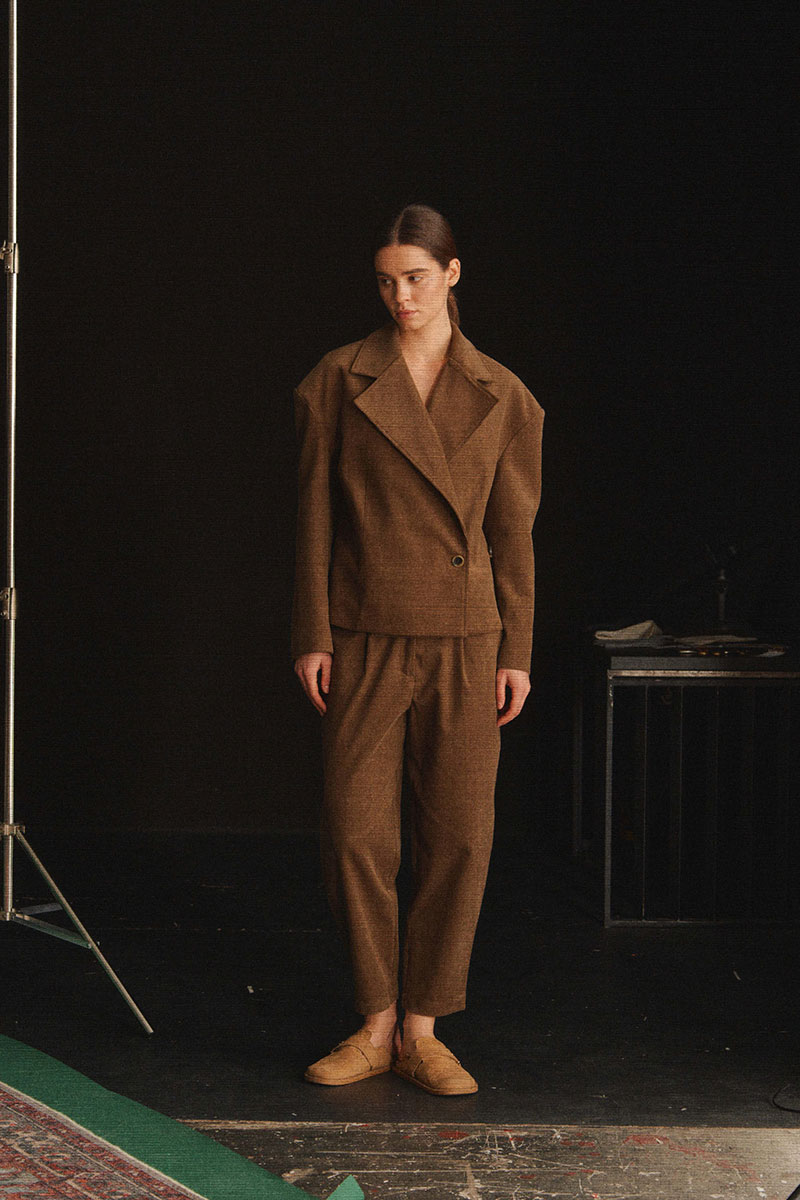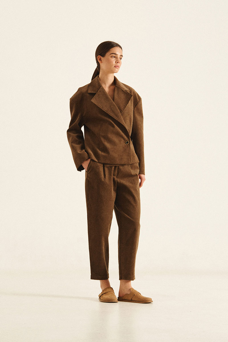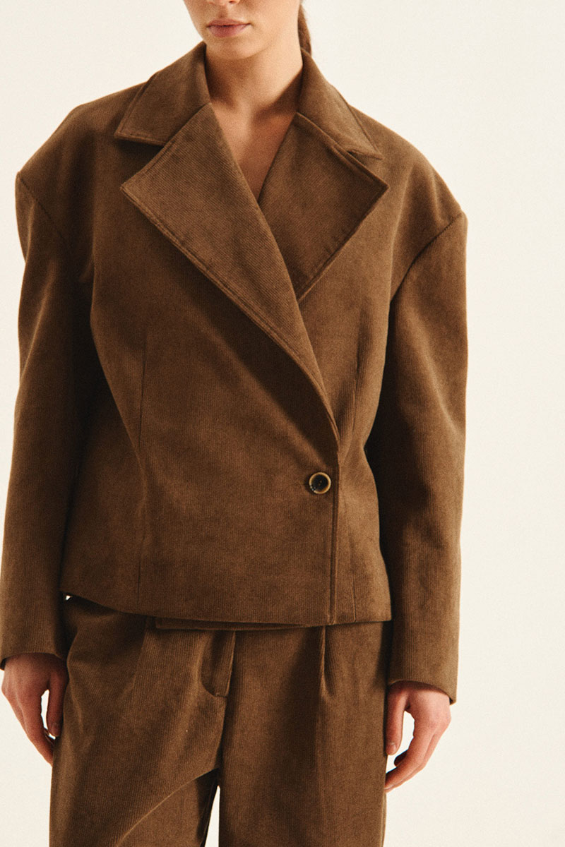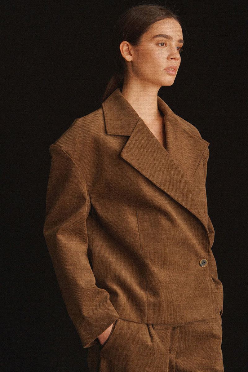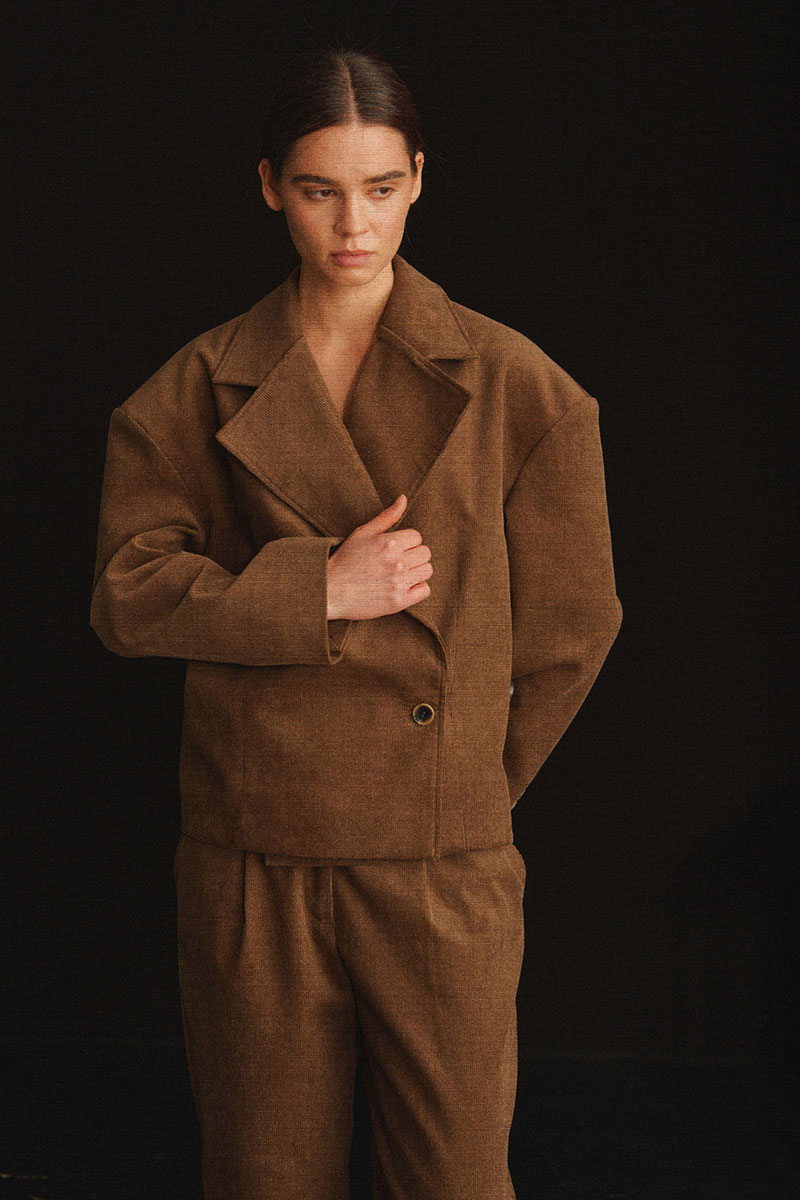 Укороченный жакет с объемной линией плеча. В конструкции жакета предусмотрено 2 варианта носки: классический и приталенный. В приталенном варианте жакет застегивается на пуговицу, которая пришита к боковому шву.