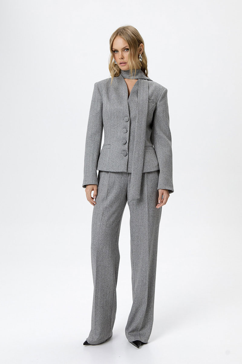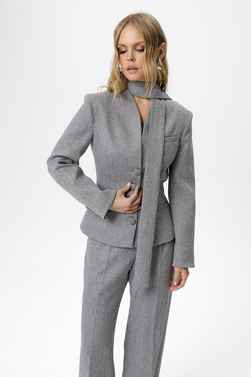 Детали: жакет полуприлегающего силуэта, цельнокроеный воротник-стойка, рельефные швы переда и спинки, функциональные карманы, застежка на петли и пуговицы, на подкладке. В комплекте съемный шарфик.