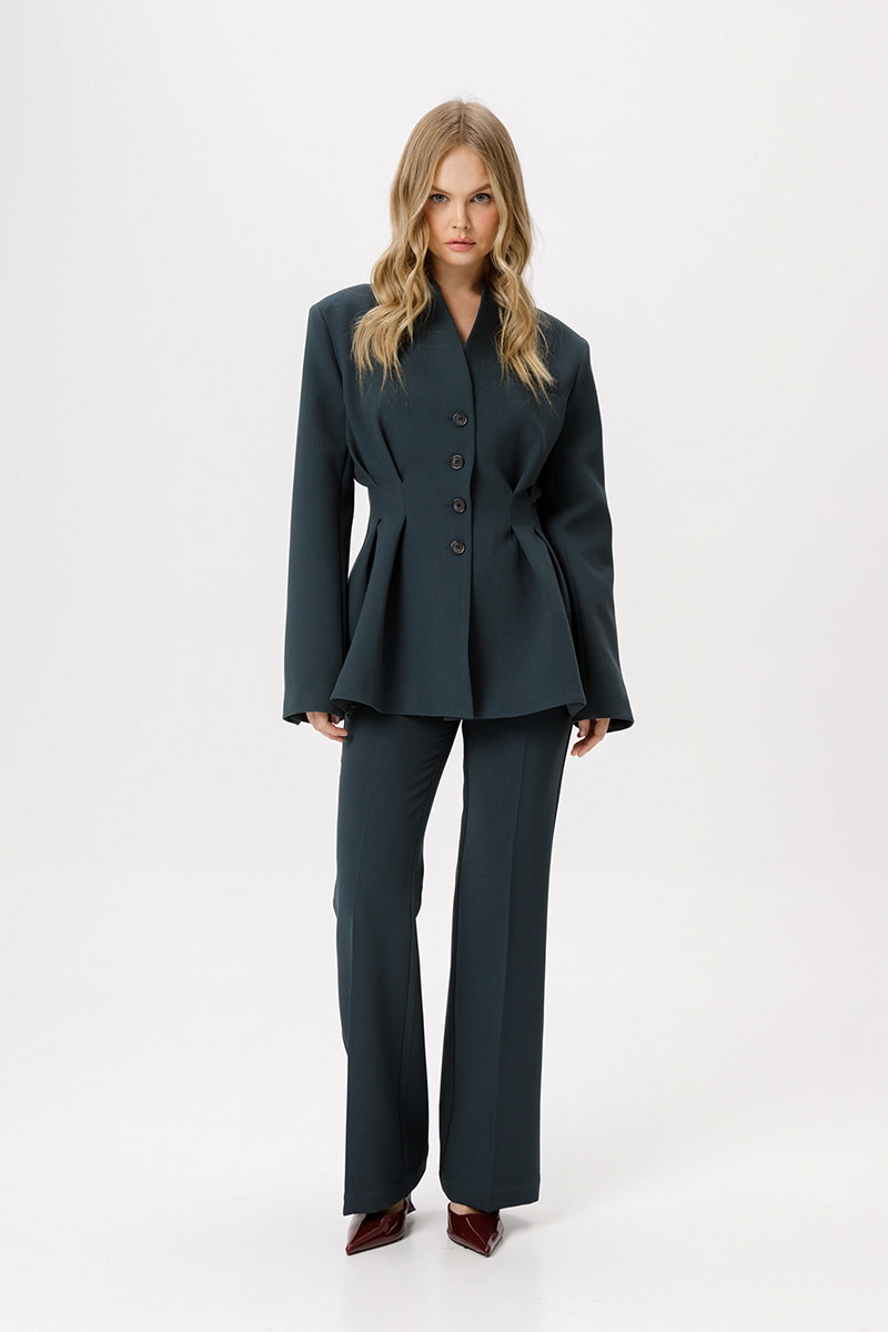 Приталенный жакет со складками и расширенными плечами. Детали: полуприлегающий силуэт с расширенными плечами, цельнокроеный воротник-стойка, застежка на петли и пуговицы, рукава втачные двушхшовные, жакет на подкладке.