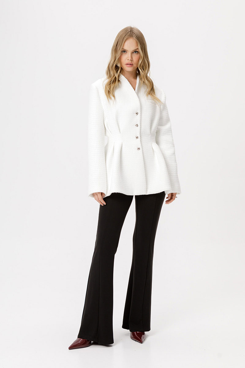 Приталенный жакет со складками и расширенными плечами из фактурной ткани.
