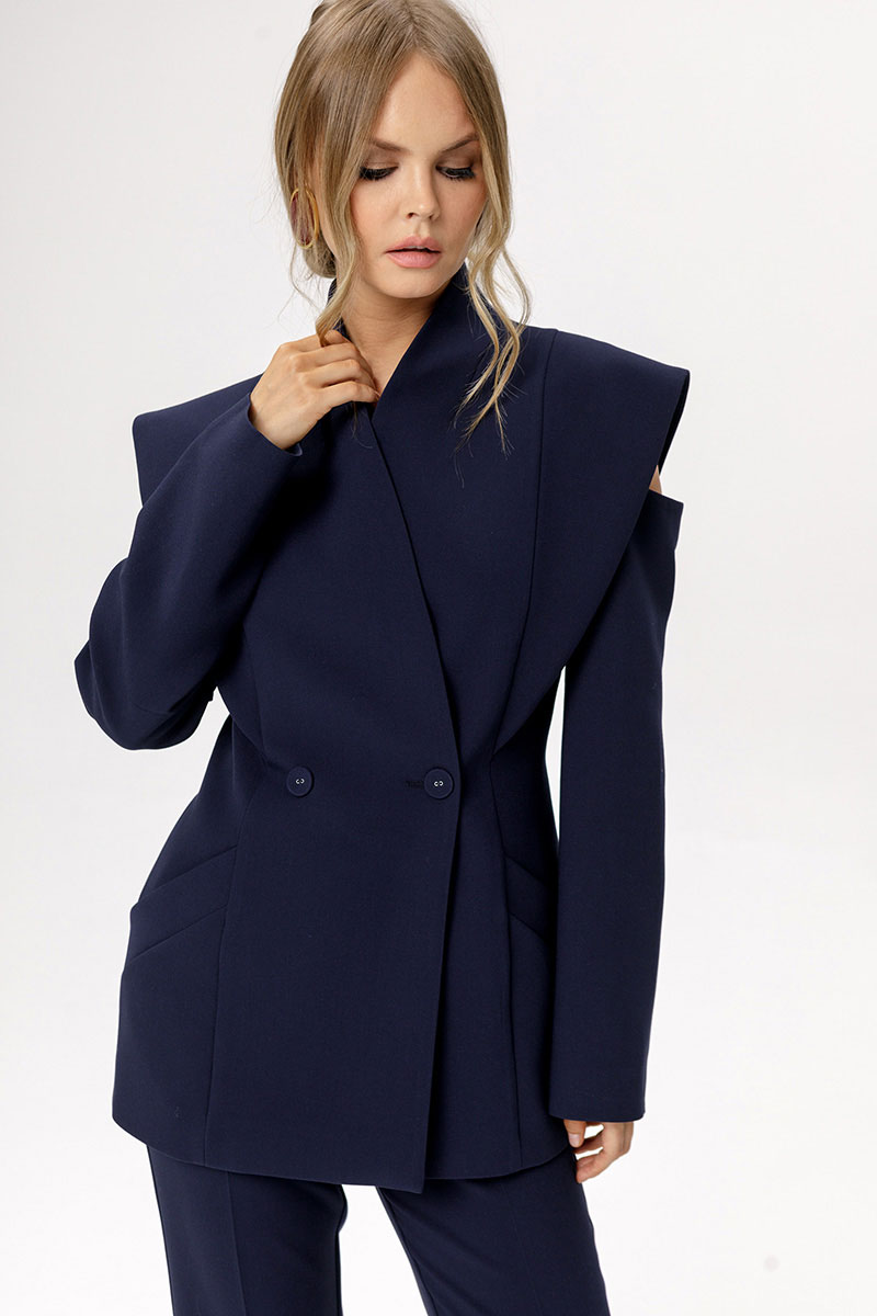 Детали: полуприлегающий силуэт, цельнокроеный воротник-стойка, двубортная застёжка на петли и пуговицы, рельефные швы переда и спинки с декоративным элементом, рукава длинные с вырезами по верху, функциональные карманы, жакет на подкладке.