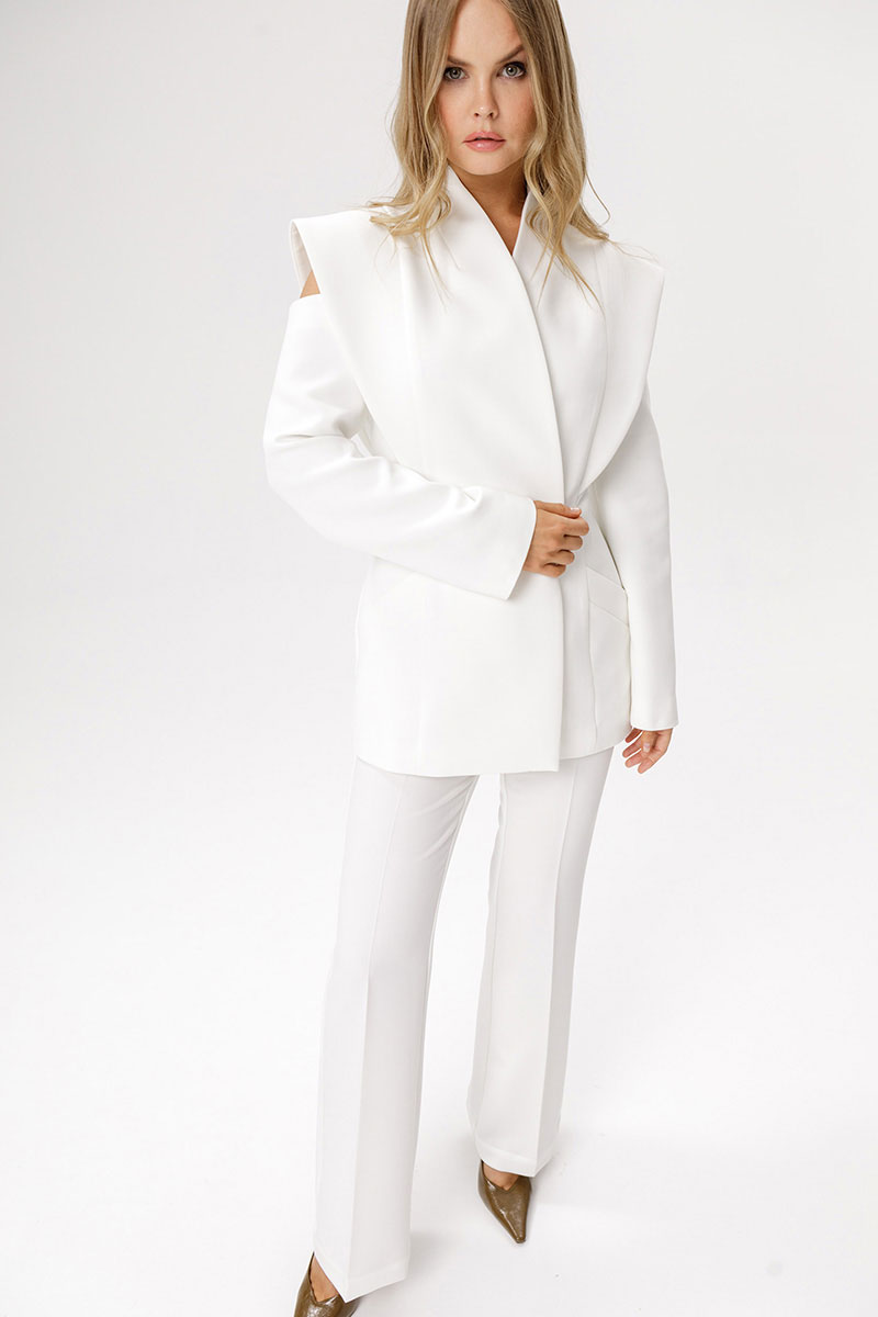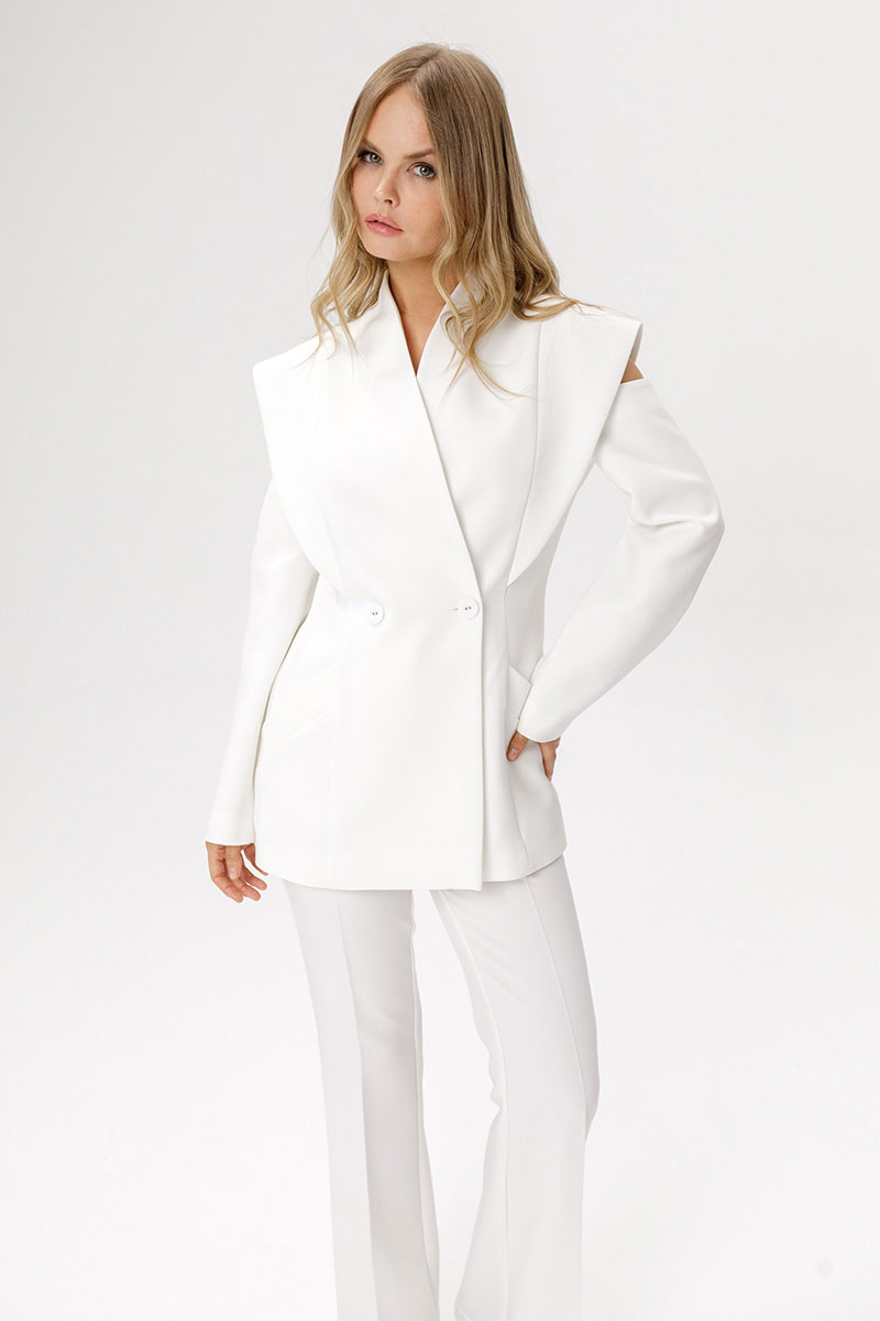 Детали: полуприлегающий силуэт, цельнокроеный воротник-стойка, двубортная застёжка на петли и пуговицы, рельефные швы переда и спинки с декоративным элементом, рукава длинные с вырезами по верху, функциональные карманы, жакет на подкладке.