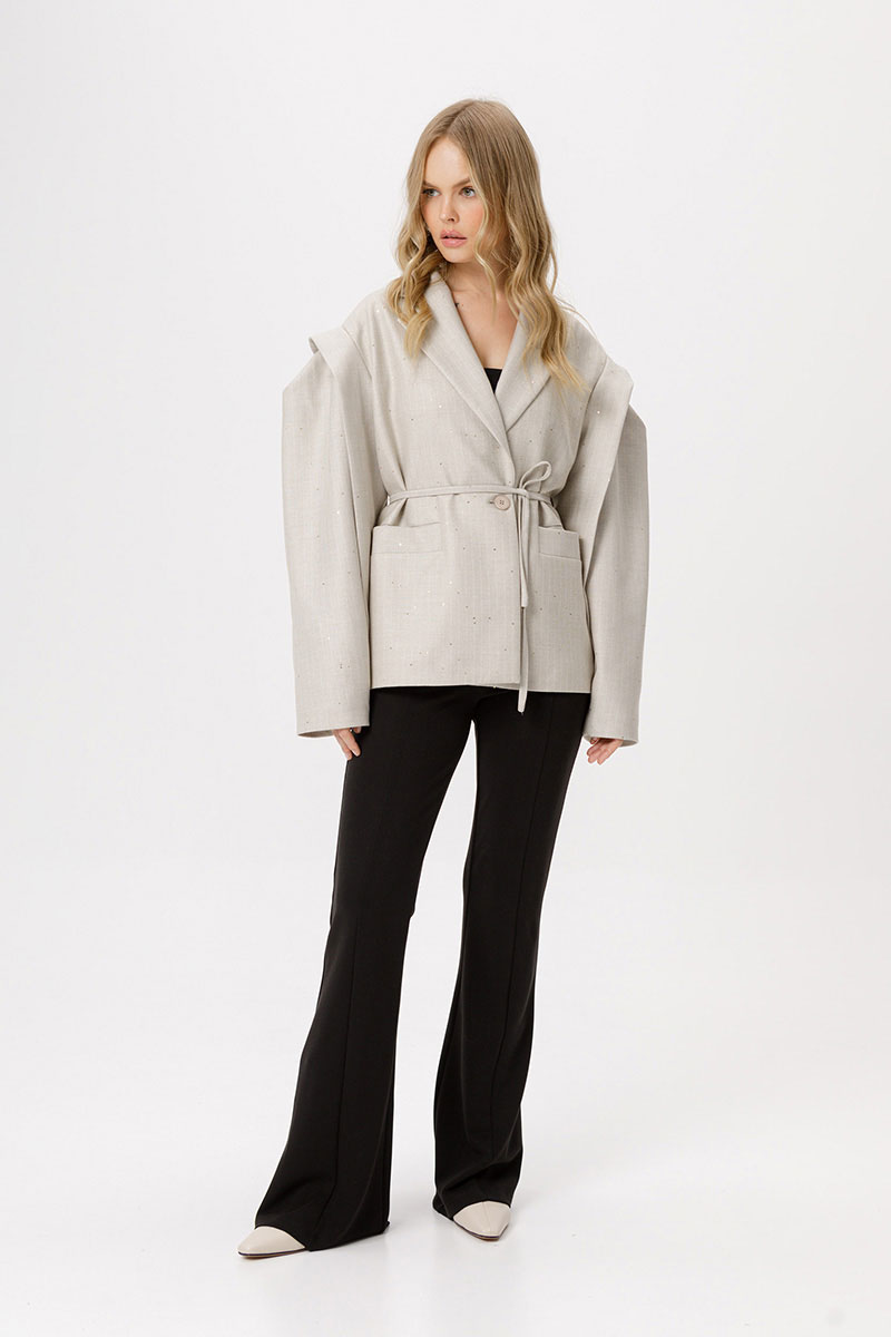 Детали: прямой силуэт, удлинённая линия плеча, втачной одношовный рукав с ассиметричными складками, функциональные карманы, центральная застёжка на 1 пуговицу, жакет на подкладке.