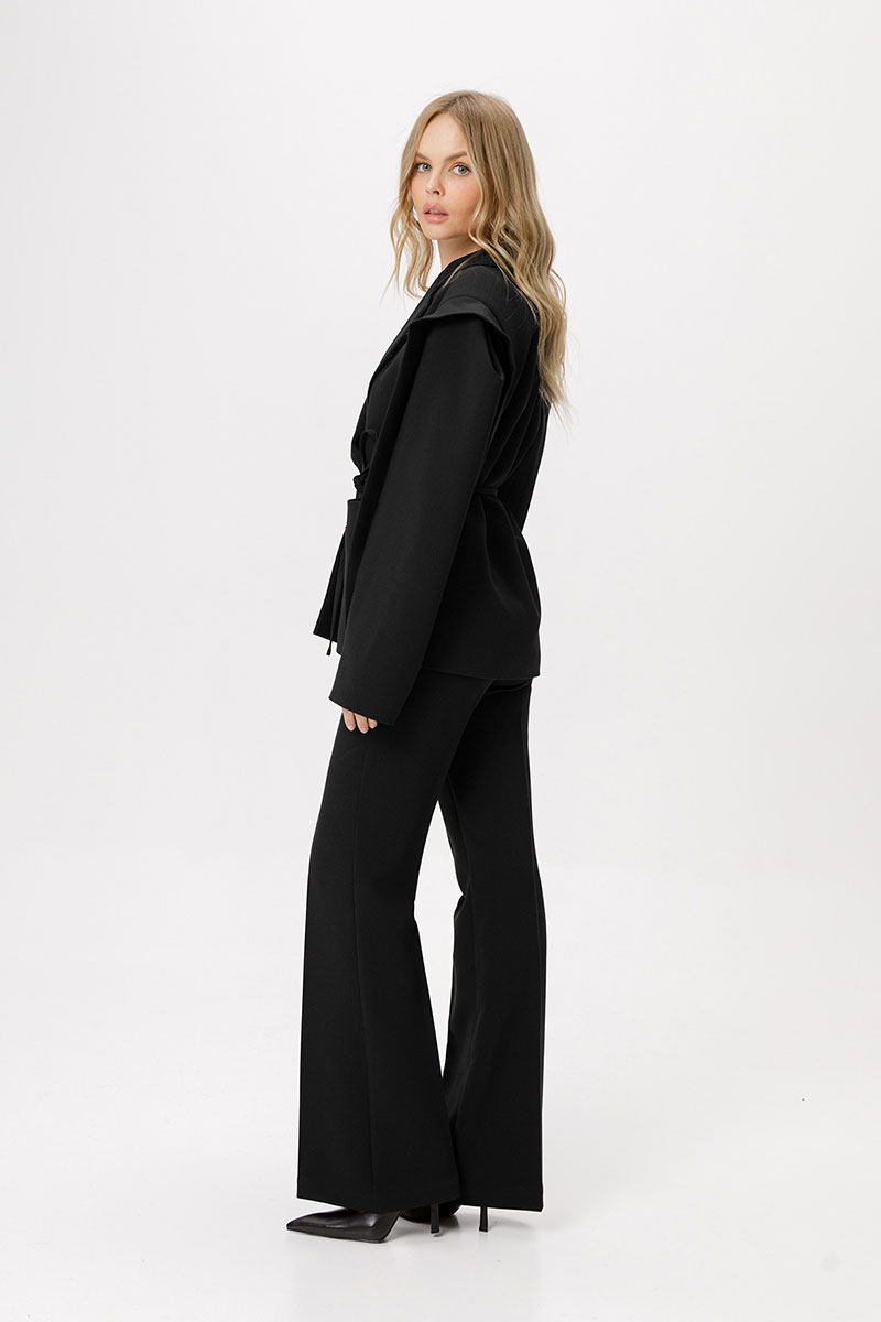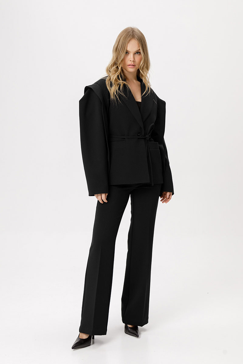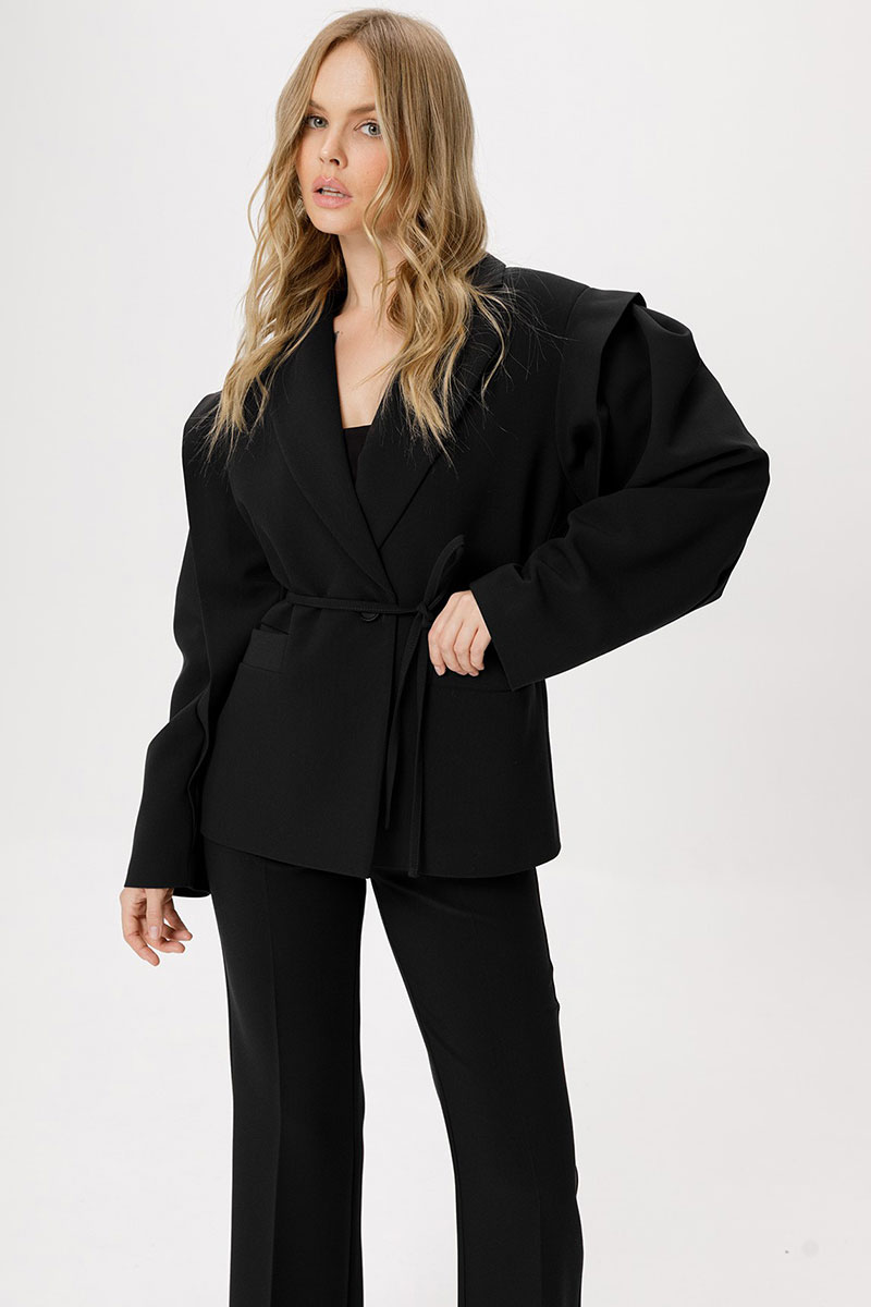 Детали: прямой силуэт, удлинённая линия плеча, втачной одношовный рукав с ассиметричными складками, функциональные карманы, центральная застёжка на петлю и пуговицу, жакет на подкладке.