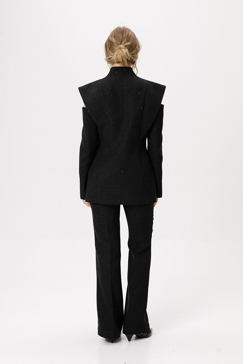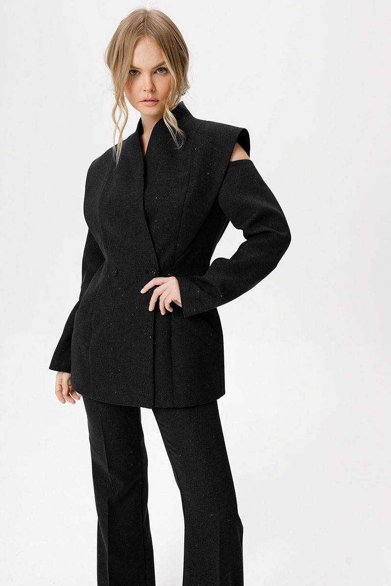 Детали: полуприлегающий силуэт, цельнокроеный воротник-стойка, двубортная застёжка на петли и пуговицы, рельефные швы переда и спинки с декоративным элементом, рукава длинные с вырезами по верху, функциональные карманы, жакет на подкладке.