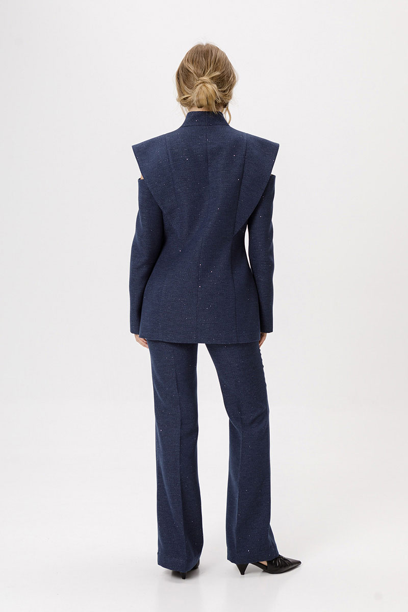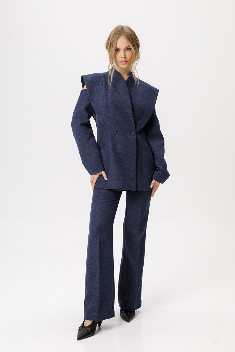 Детали: полуприлегающий силуэт, цельнокроеный воротник-стойка, двубортная застёжка на петли и пуговицы, рельефные швы переда и спинки с декоративным элементом, рукава длинные с вырезами по верху, функциональные карманы, жакет на подкладке.