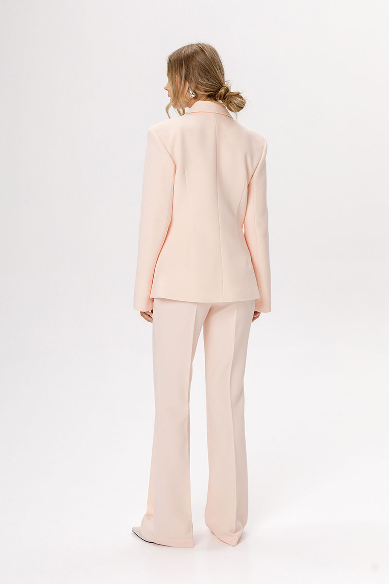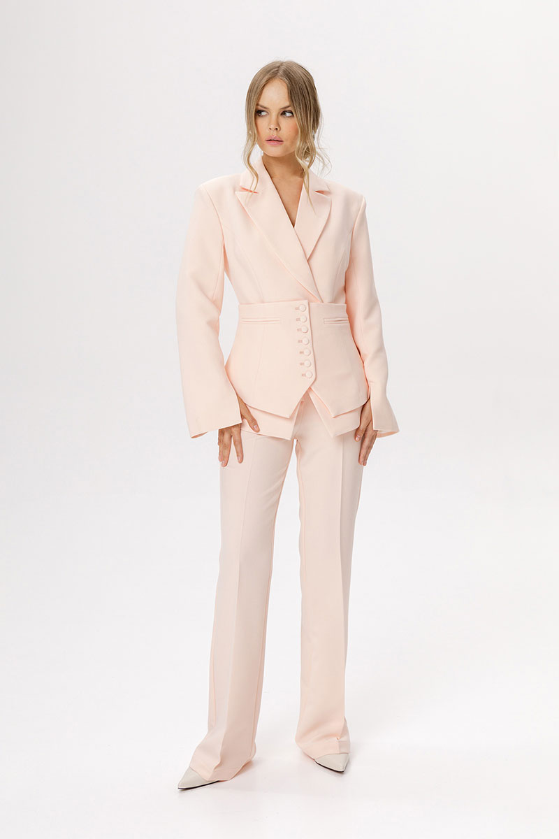 Комплект-двойка из приталенного жакета с разрезами по рукавам и съёмной баски.