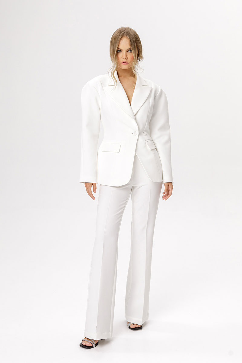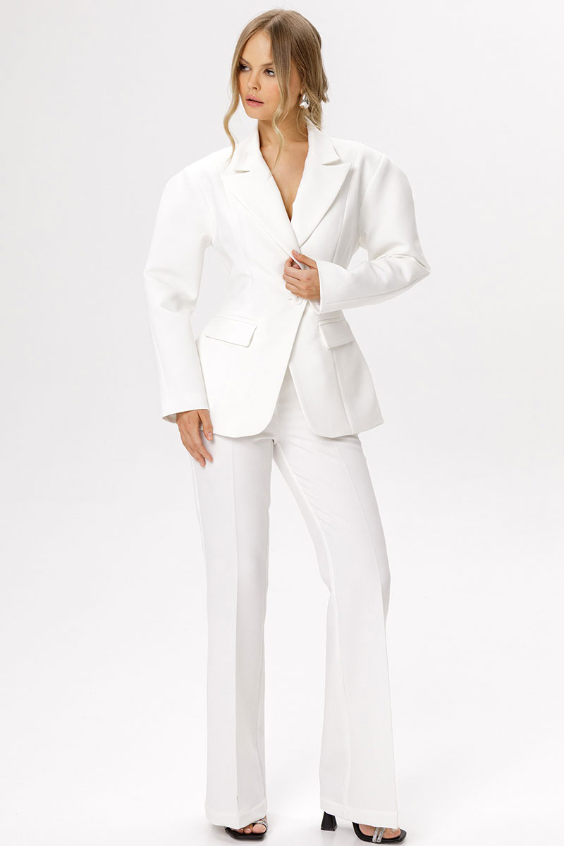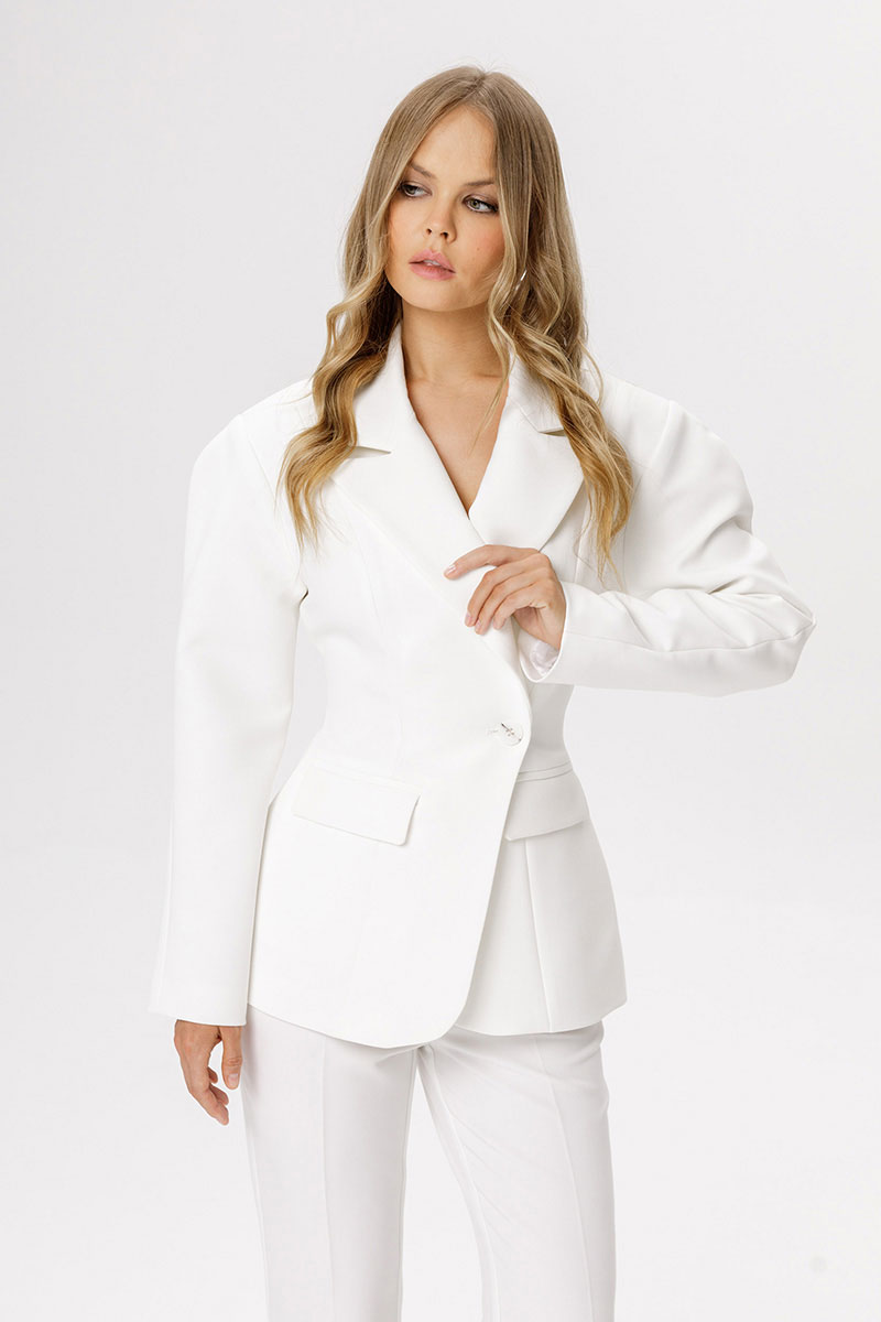 Детали: жакет приталенного силуэта, расширенная линия плеч, пиджачный воротник, рукава фигурной формы с верхним швом, спинка со шнуровкой и застежка на две пуговицы, с помощью которых можно регулировать прилегание по талии, на подкладке.