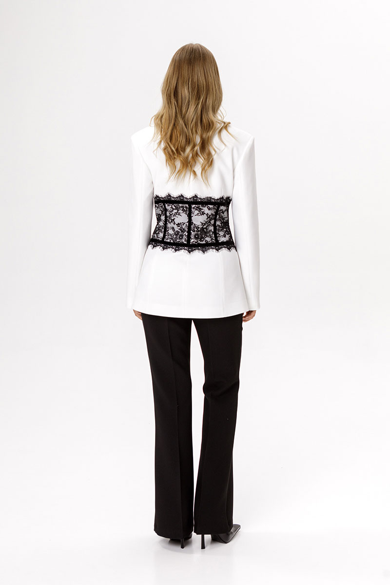 Детали: полуприлегающий силуэт, V-образный вырез горловины, талиевые вытачки переда и спинки, спинка со средним швом, втачные двухшовные рукава, застёжка на навесные петли и пуговицы, отделка кружевом и бархатной лентой, жакет на подкладке.
