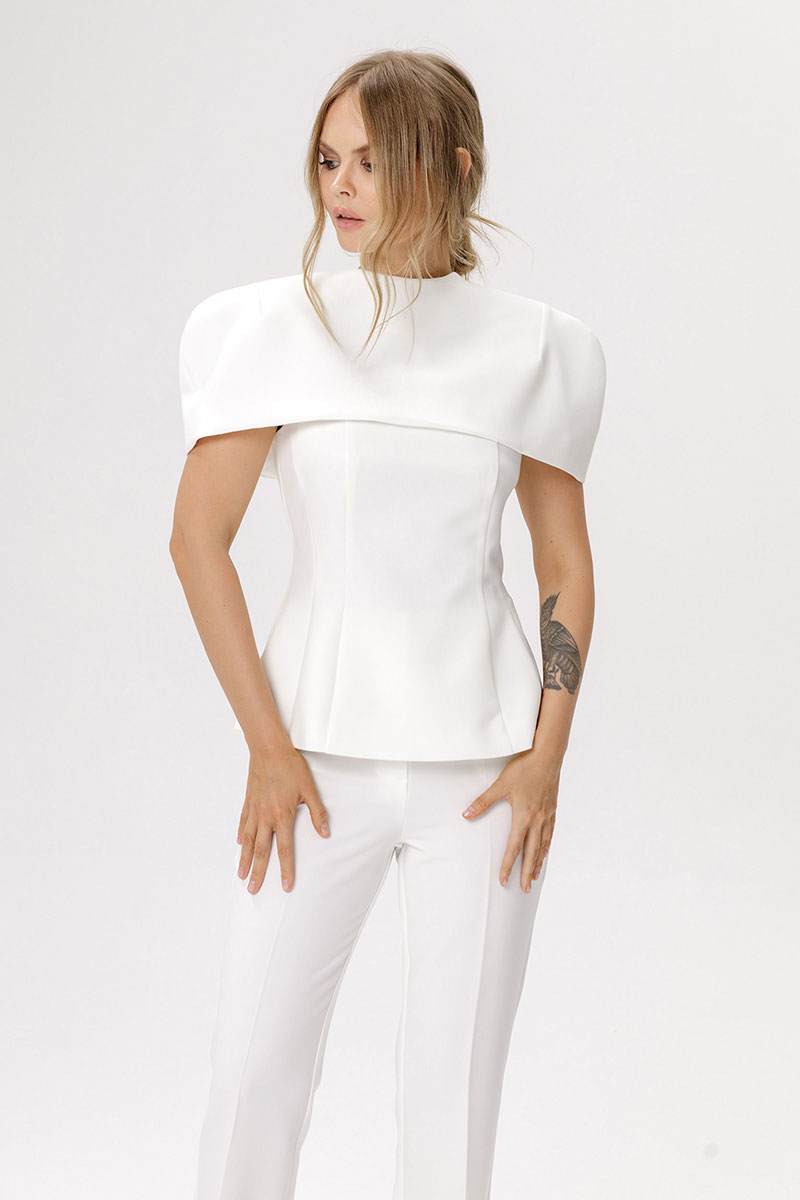 Детали: круглая горловина, вытачками по плечам и плевые накладки, застежка на навесную петлю и пуговицу, на подкладке. Кейп не имеет переда и спинки.
