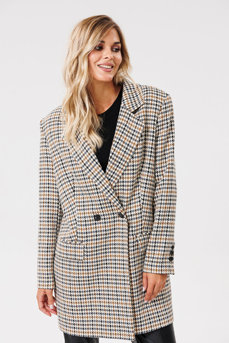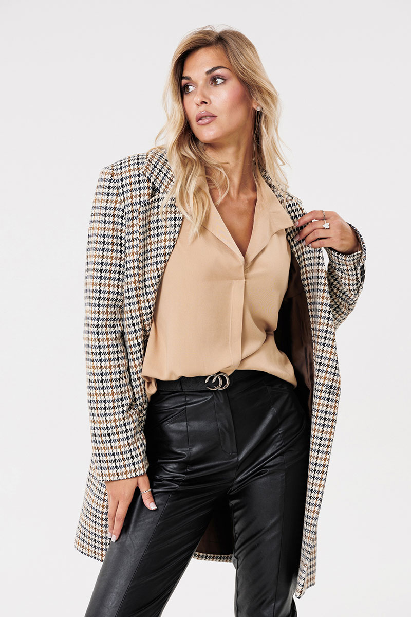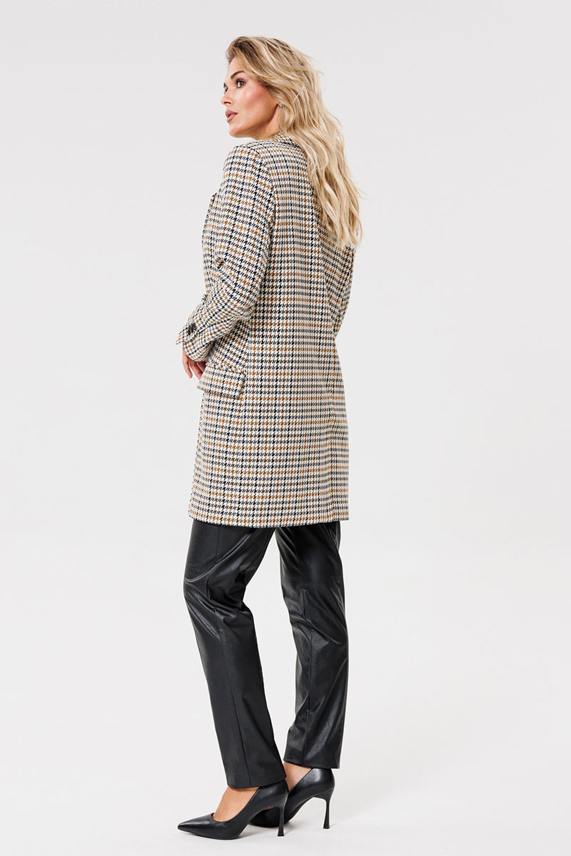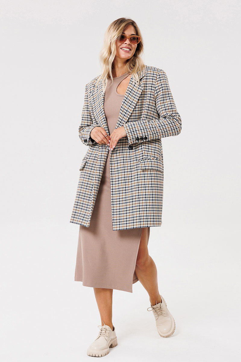 Жакет женский на подкладке из текстильной ткани, двубортный, оверсайз. По переду расположены талиевые вытачки с прорезными карманами с клапаном. Спинка со средним швом и шлицей. Рукав двухшовный со шлицей на петлях-пуговицах. Застежка жакета двубортная на петлях-пуговицах. Вырез горловины оформлен воротником с лацканами.