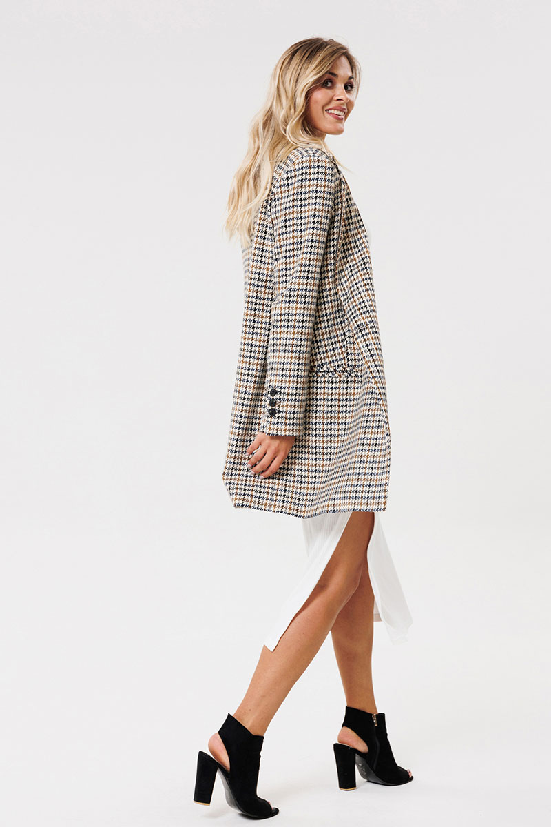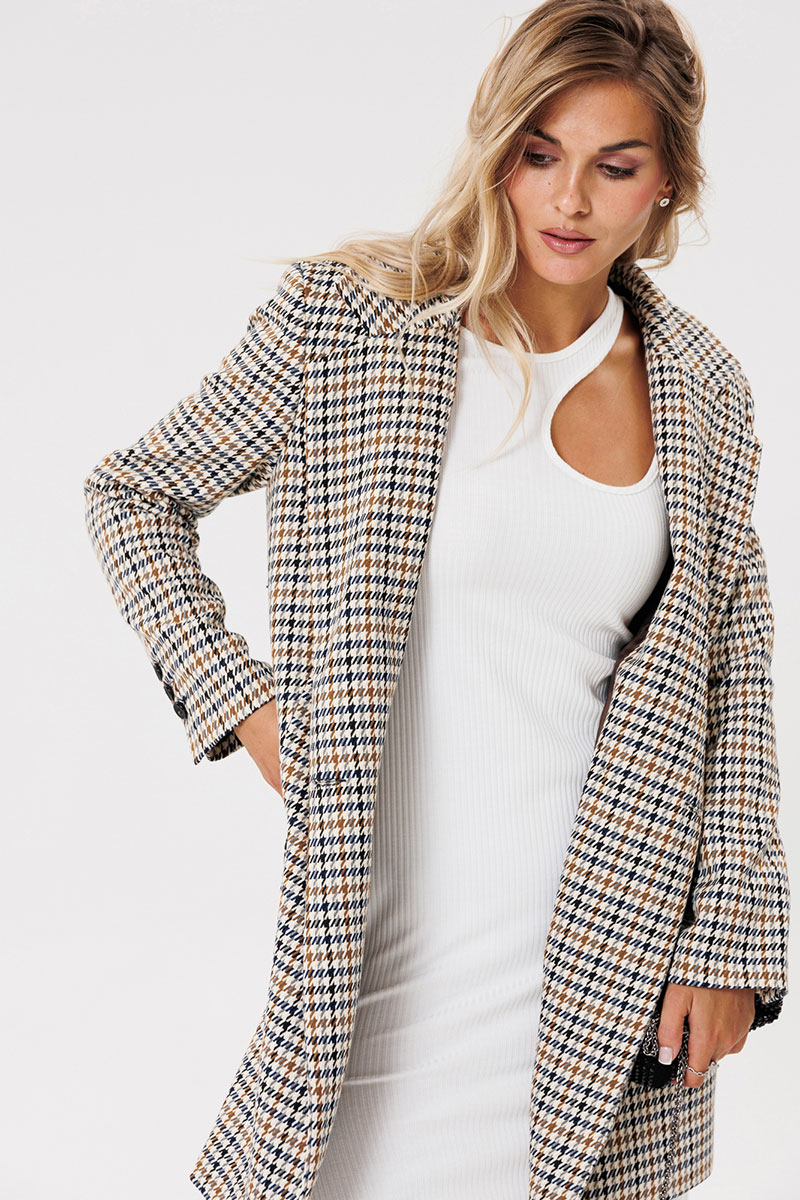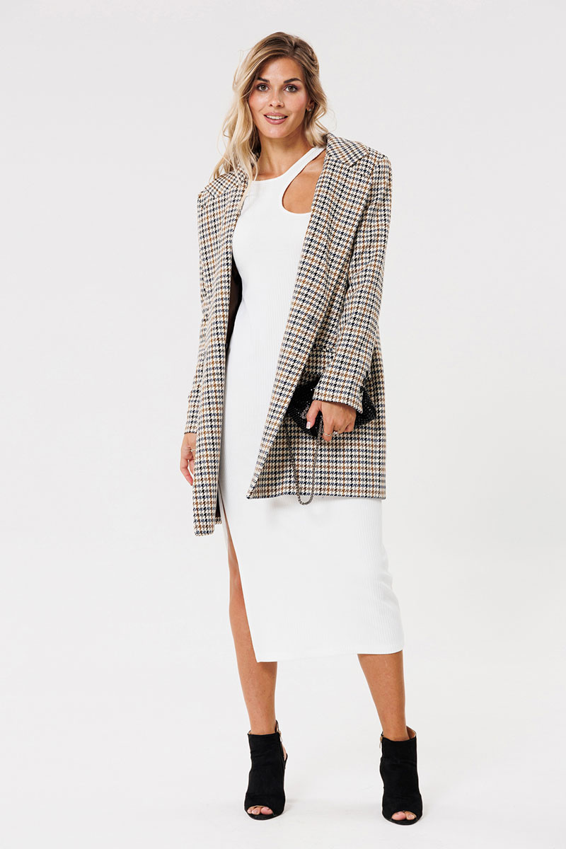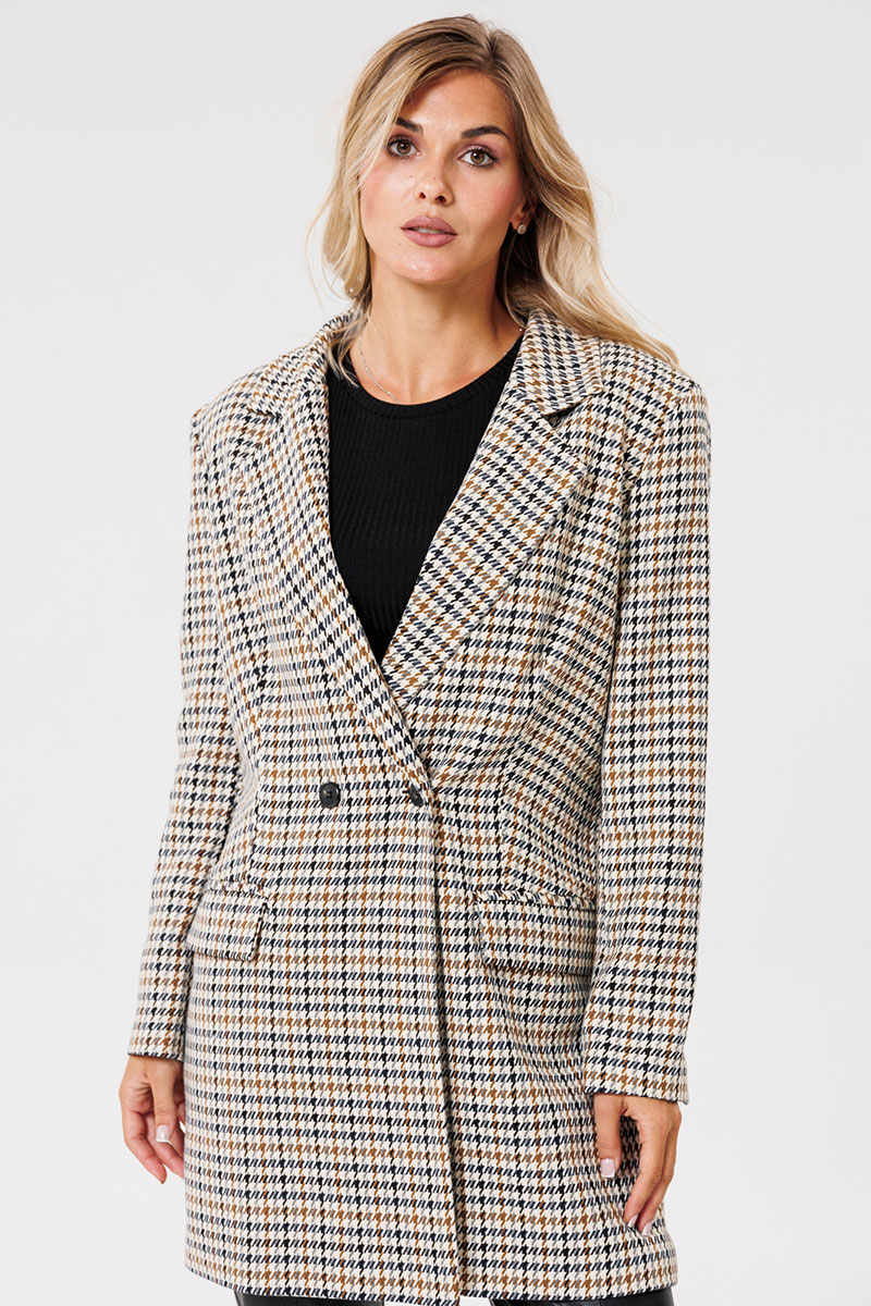 Жакет женский на подкладке из текстильной ткани, двубортный, оверсайз. По переду расположены талиевые вытачки с прорезными карманами с клапаном. Спинка со средним швом и шлицей. Рукав двухшовный со шлицей на петлях-пуговицах. Застежка жакета двубортная на петлях-пуговицах. Вырез горловины оформлен воротником с лацканами.