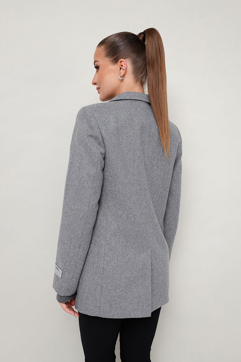 Стильный жакет полуприлегающего силуэта, выполнен из костюмной ткани. Воротник пиджачного типа с отложными лацканами. Застежка центральная на петли и пуговицы. Спереди обработаны накладные карманы, в области груди подрезы с нагрудными вытачками. Спинка с рельефами и средним швом, переходящим в шлицу. Рукава втачные двухшовные, на левом рукаве декоративная нашивка. Изделие на подкладке.