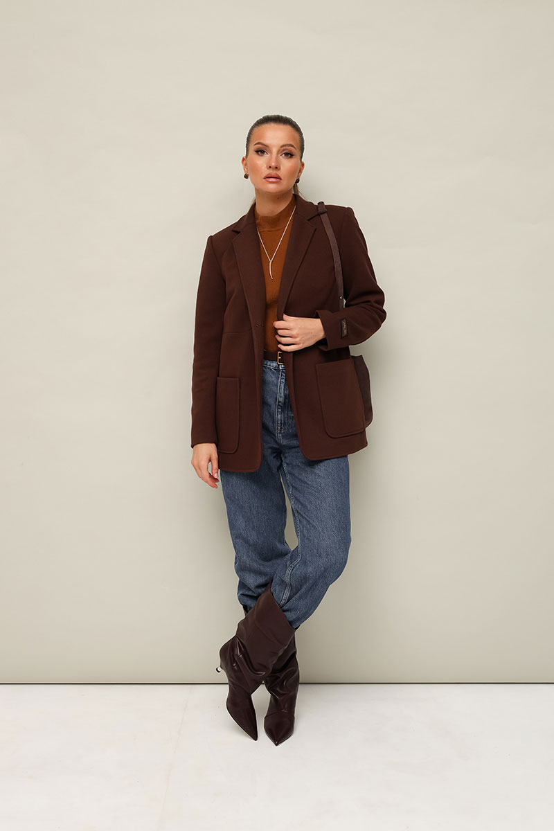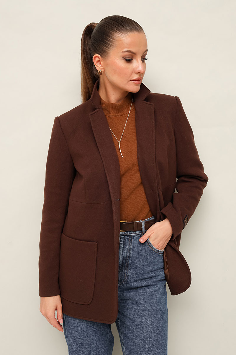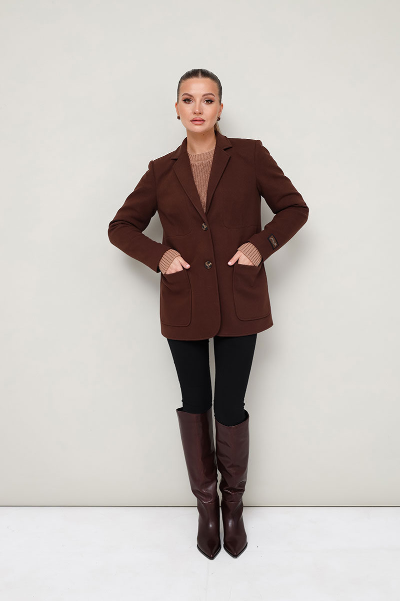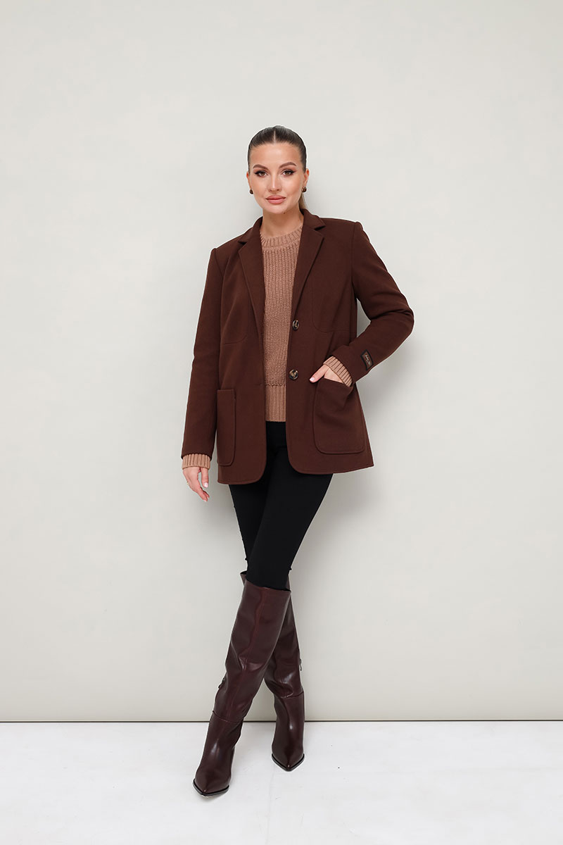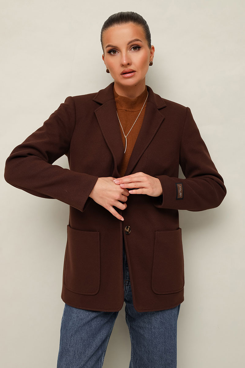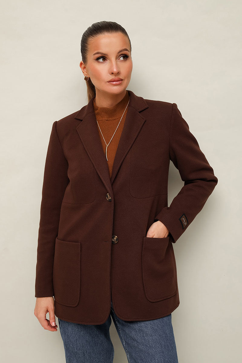 Стильный жакет полуприлегающего силуэта, выполнен из костюмной ткани. Воротник пиджачного типа с отложными лацканами. Застежка центральная на петли и пуговицы. Спереди обработаны накладные карманы, в области груди подрезы с нагрудными вытачками. Спинка с рельефами и средним швом, переходящим в шлицу. Рукава втачные двухшовные, на левом рукаве декоративная нашивка. Изделие на подкладке.