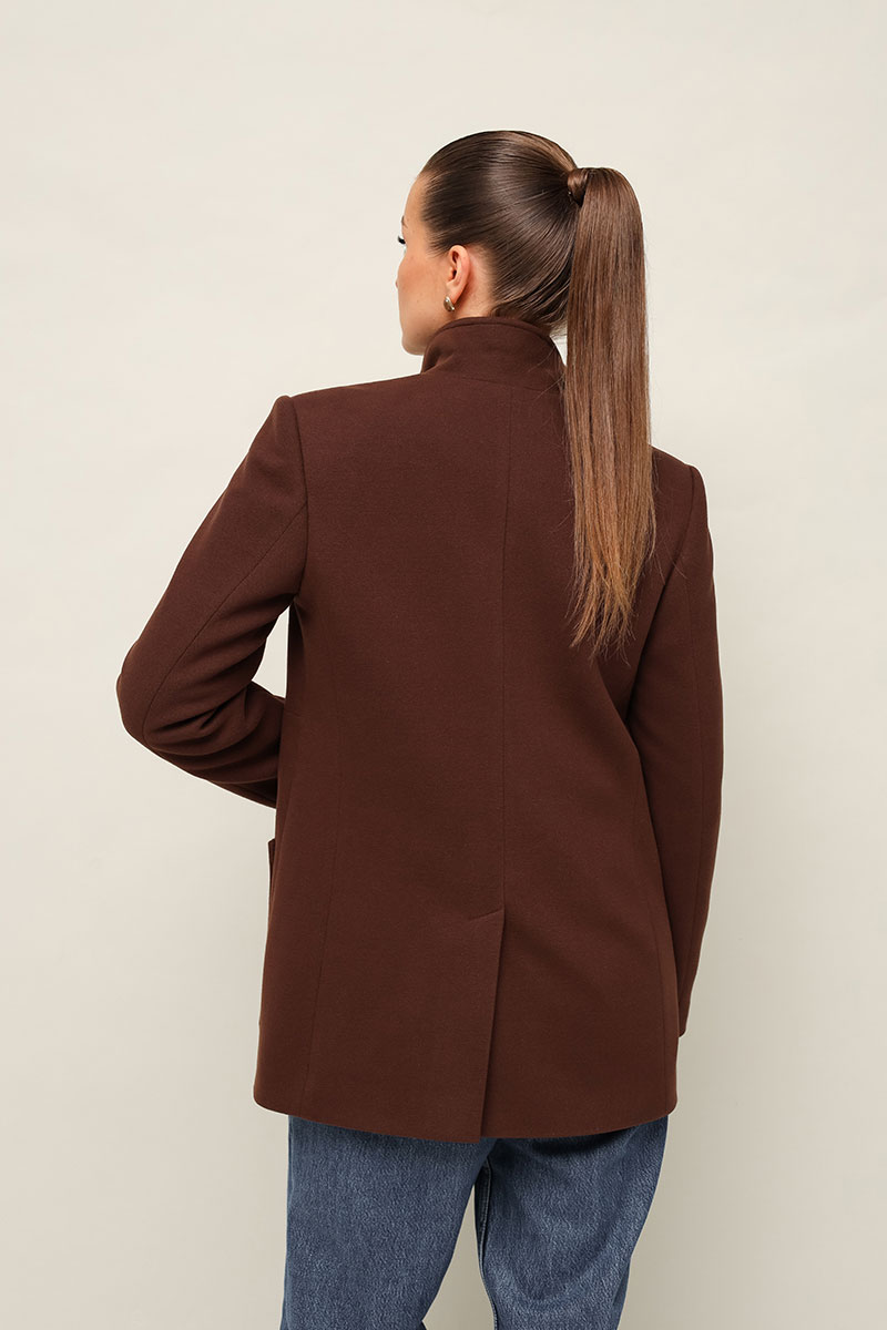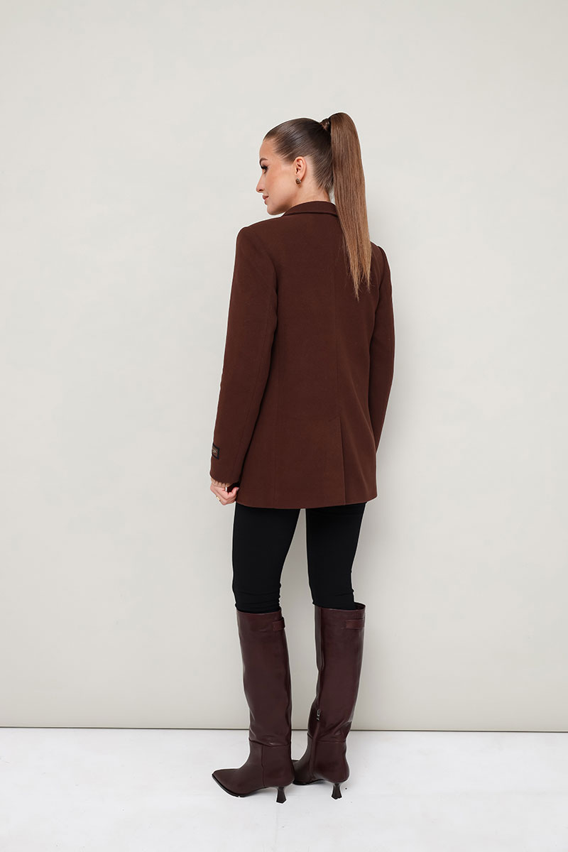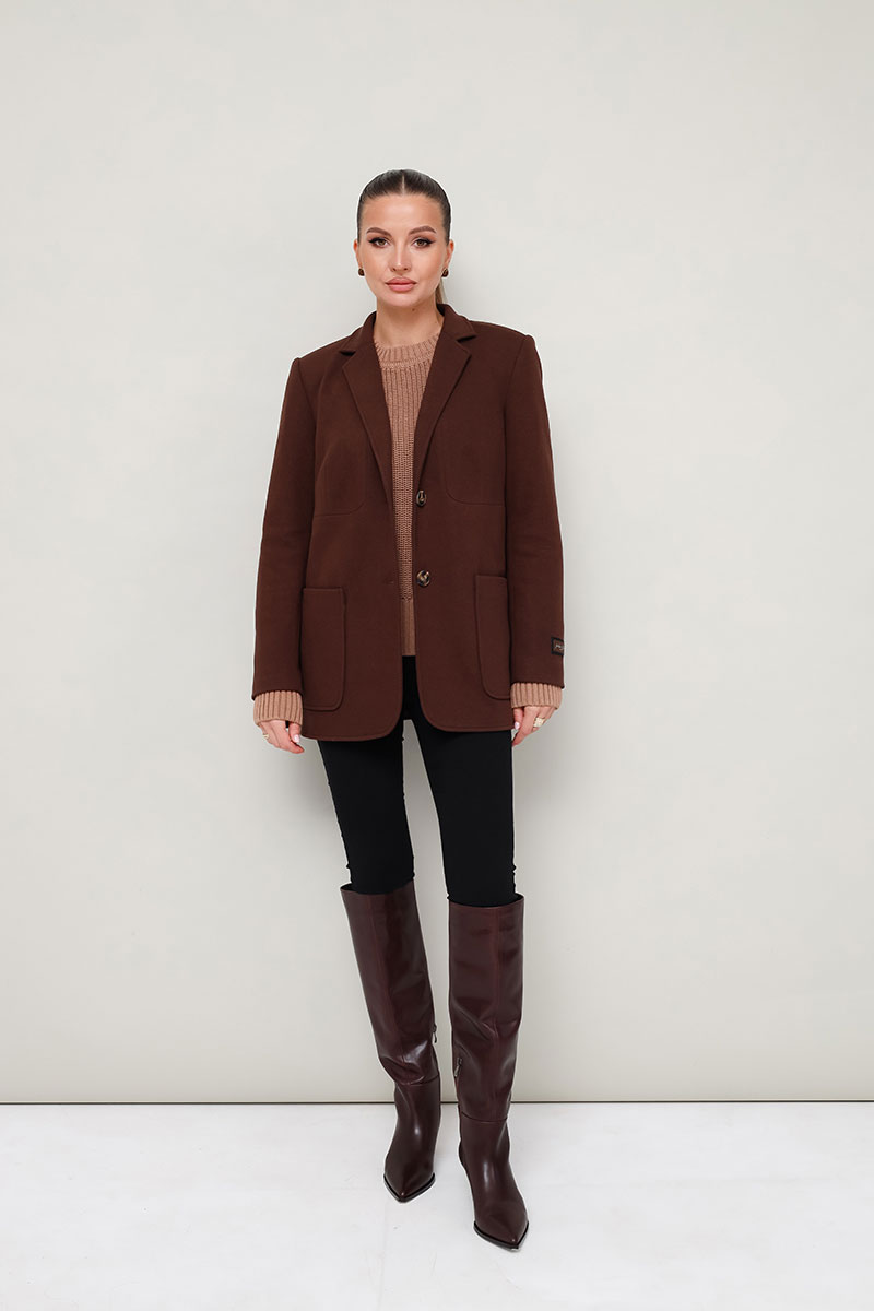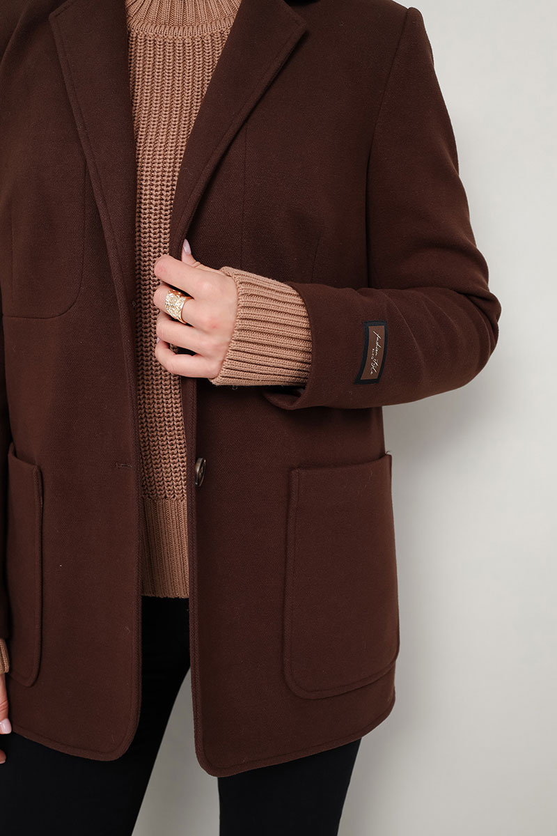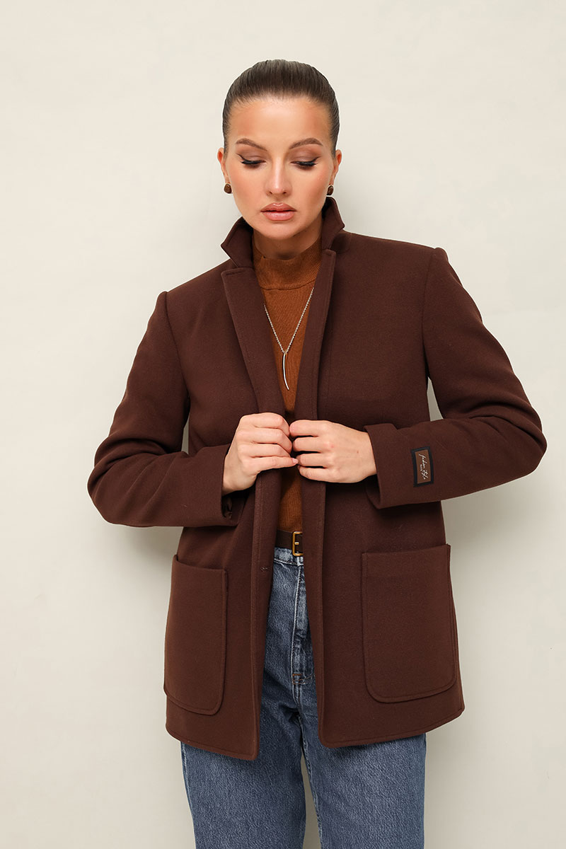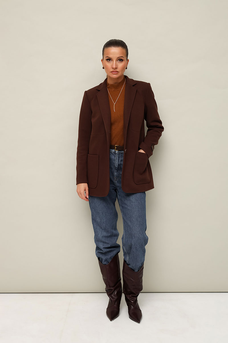 Стильный жакет полуприлегающего силуэта, выполнен из костюмной ткани. Воротник пиджачного типа с отложными лацканами. Застежка центральная на петли и пуговицы. Спереди обработаны накладные карманы, в области груди подрезы с нагрудными вытачками. Спинка с рельефами и средним швом, переходящим в шлицу. Рукава втачные двухшовные, на левом рукаве декоративная нашивка. Изделие на подкладке.
