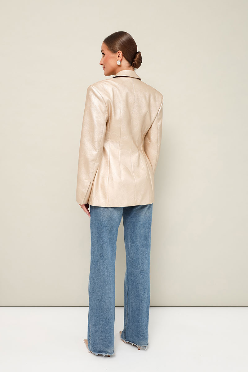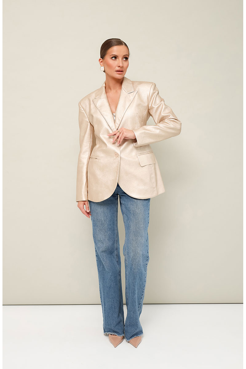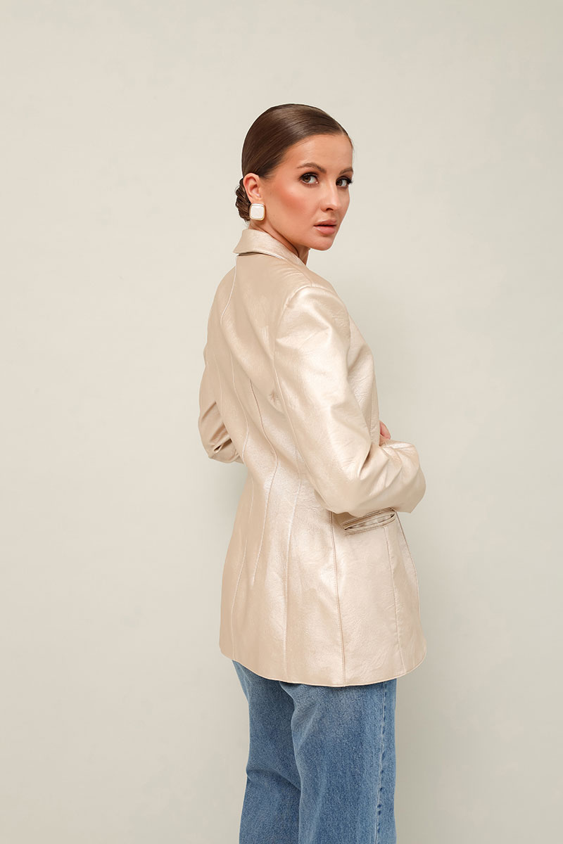 Силуэтный жакет с подчеркнутой линией талии, в ыполнен из качественной матовой экокожи в золотистом оттенке. Центральная застежка на петли и пуговицы. Воротник пиджачного типа с отложными лацканами, край борта скругленный по низу жакета. Спереди обработаны прорезные карманы в рамку с клапанами. Рукава втачные, двухшовные со шлицами. Спинка с рельефами и средним швом. Жакет на подкладке.