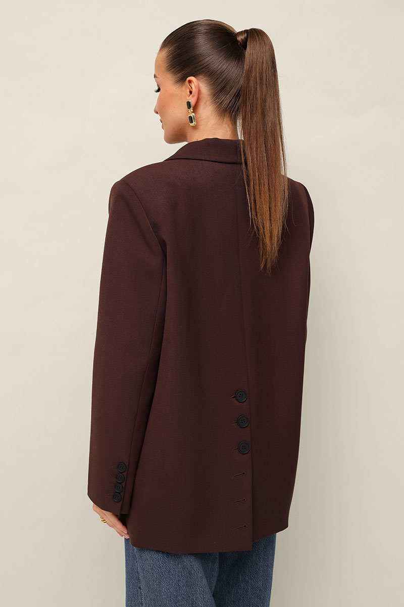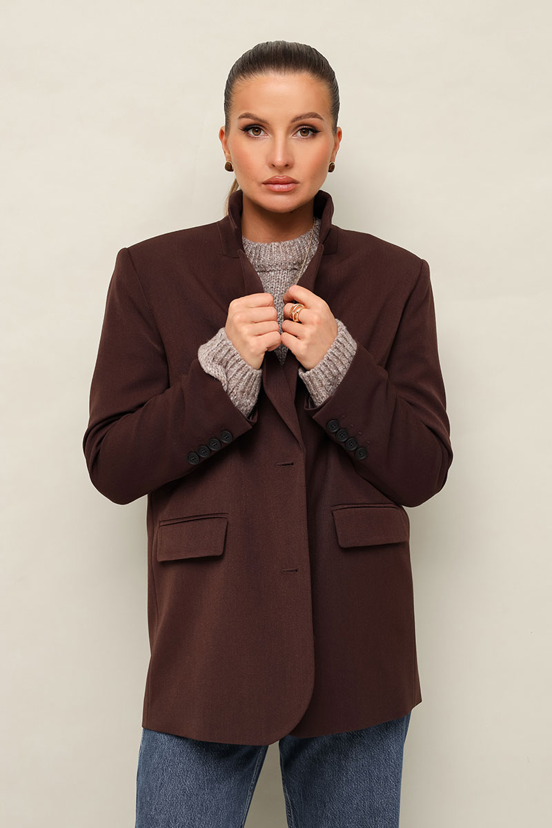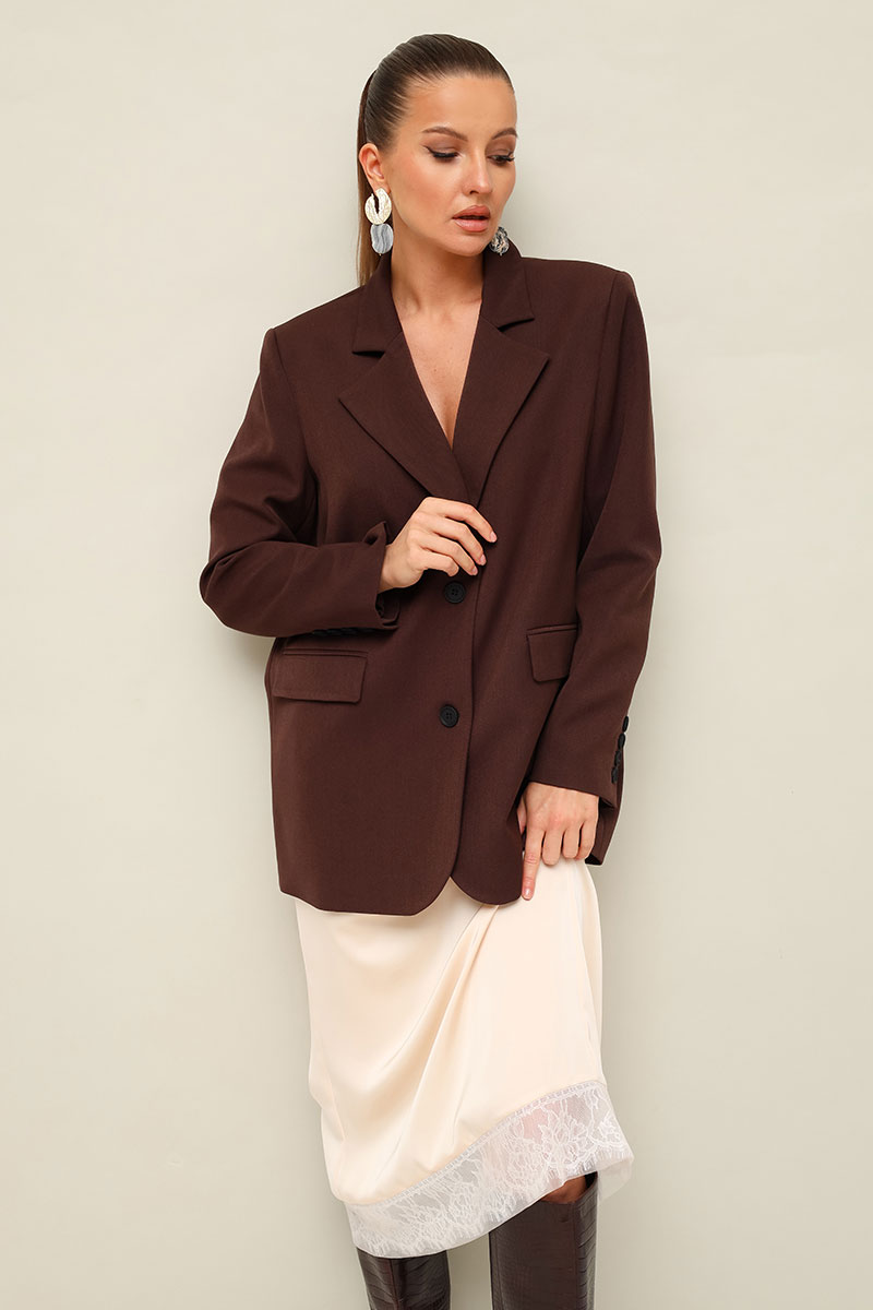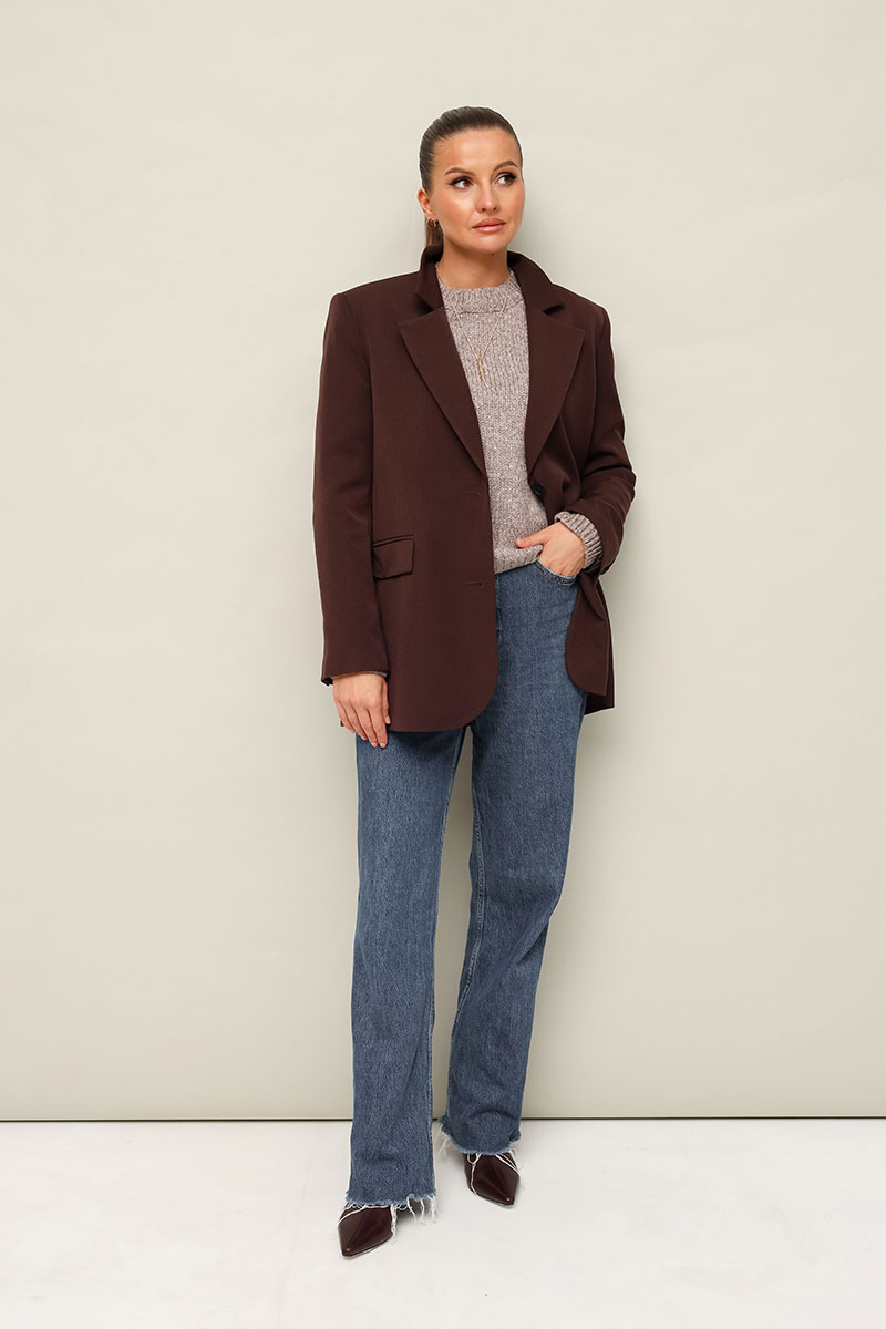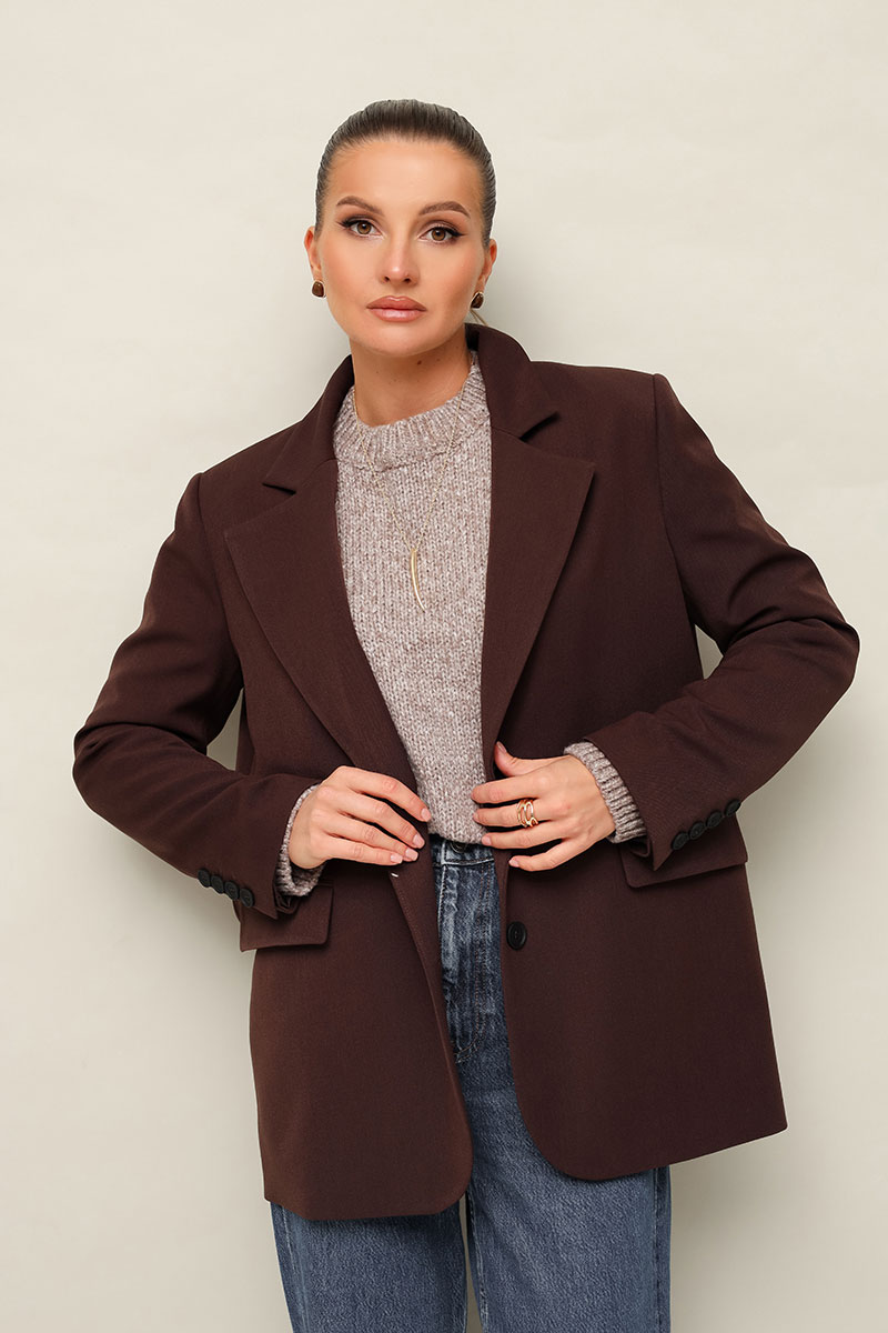 Жакет актуального прямого кроя, выполнен из костюмной ткани. Воротник пиджачного типа с отложными лацканами, край борта скругленный по низу жакета. Спереди обработаны прорезные карманы в рамку с клапанами. Рукава втачные двухшовные со шлицей и пуговицами. Спинка со средним швом, переходящим в высокую шлицу с застежкой на петли и пуговицы. Жакет на подкладке.