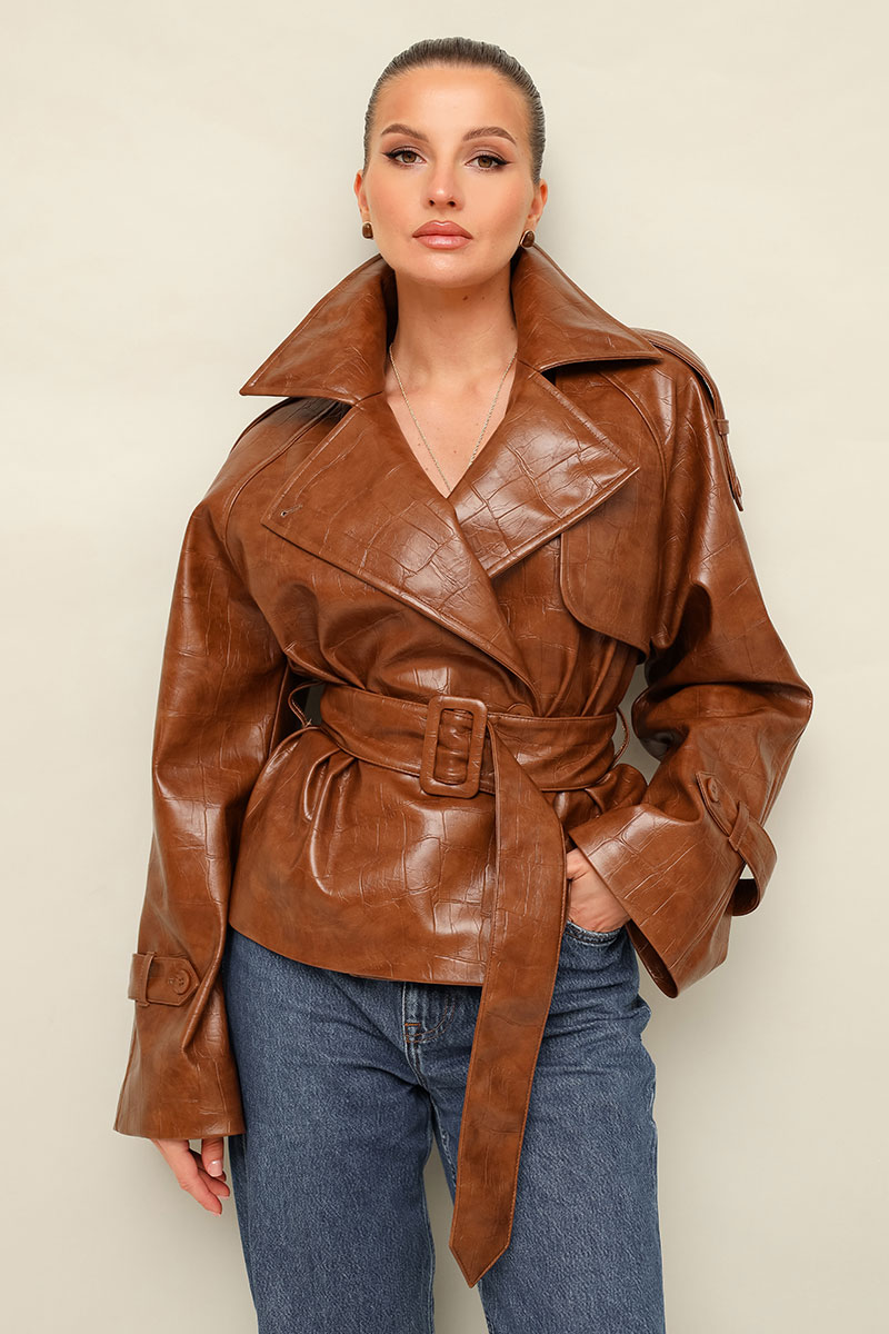 Жакет современного прямого силуэта, двубортный с застежкой на петли и пуговицы. По плечевому шву обработаны погоны. Воротник пиджачного типа с отложными лацканами. Спереди отлетная кокетка. Рукава кроя реглан, с патами по низу, с фиксацией на пряжки. Спинка со средним швом. Изделие на подкладке. В комплекте пояс из основной ткани с пряжкой.