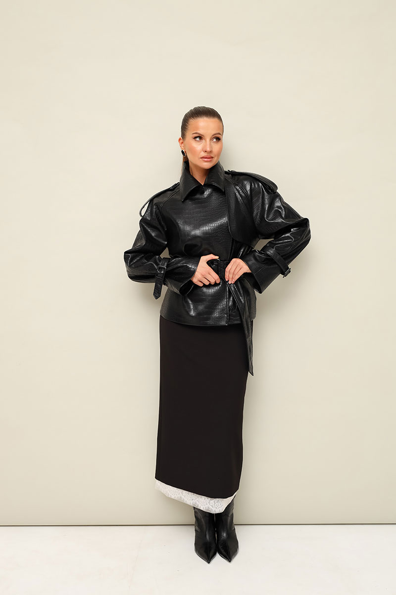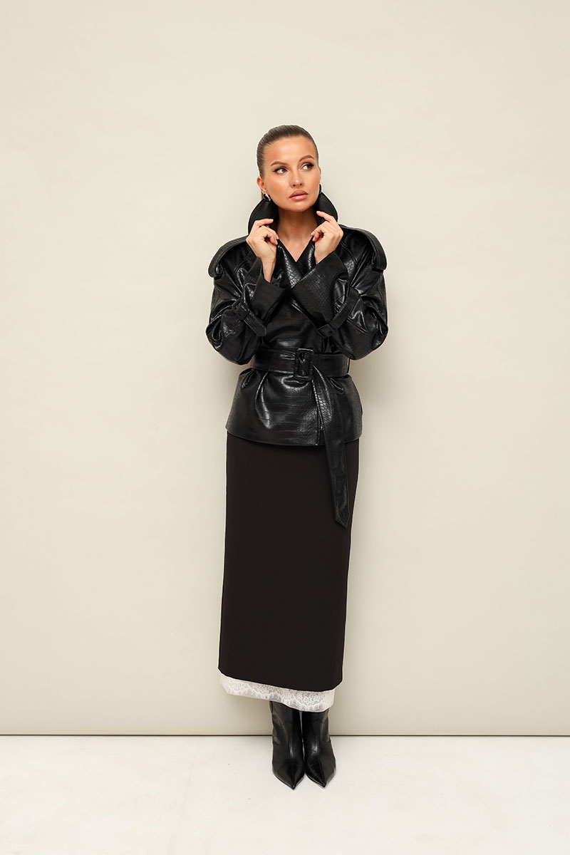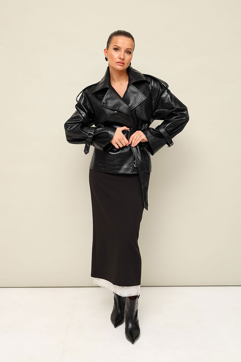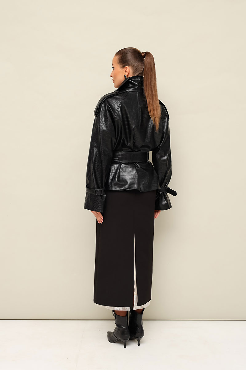 Жакет современного прямого силуэта, двубортный с застежкой на петли и пуговицы. По плечевому шву обработаны погоны. Воротник пиджачного типа с отложными лацканами. Спереди отлетная кокетка. Рукава кроя реглан, с патами по низу, с фиксацией на пряжки. Спинка со средним швом. Изделие на подкладке. В комплекте пояс из основной ткани с пряжкой.