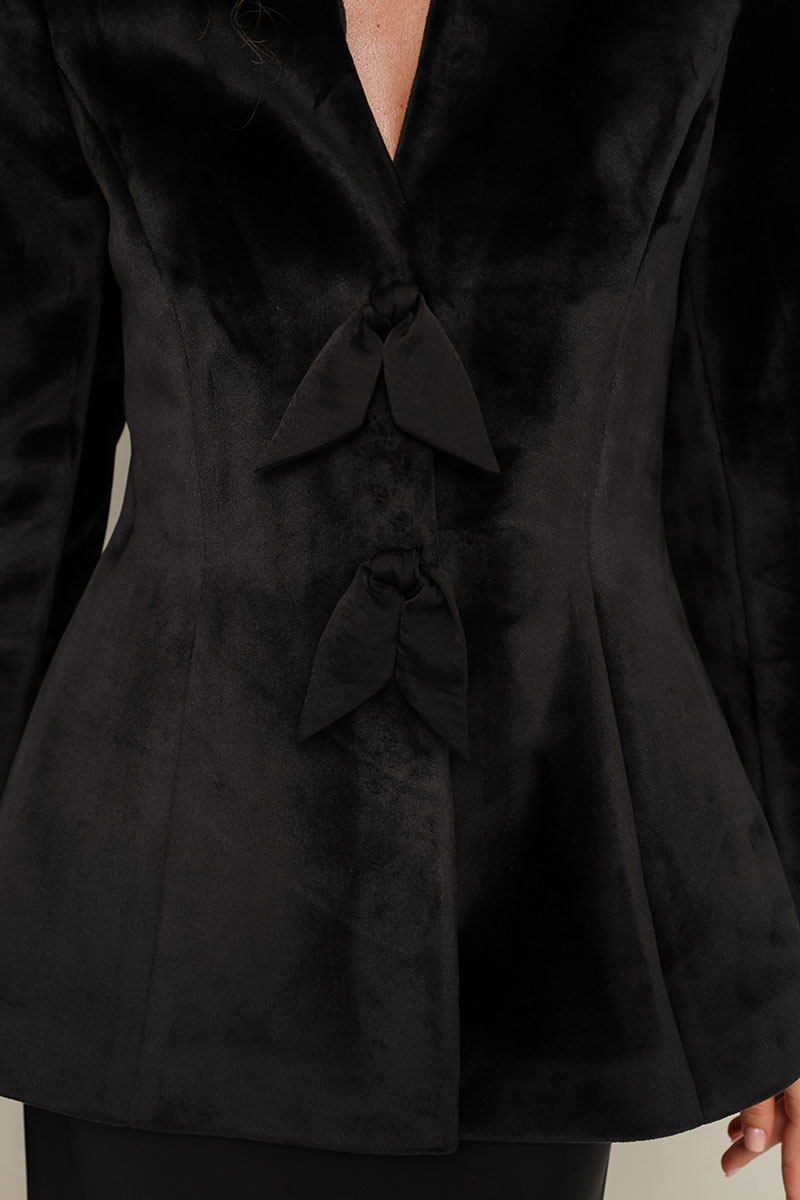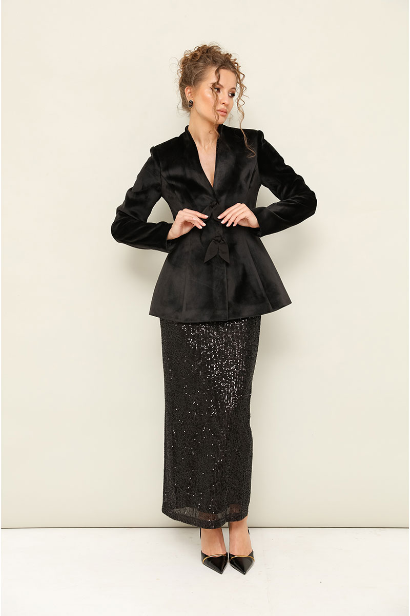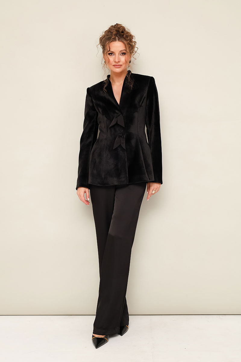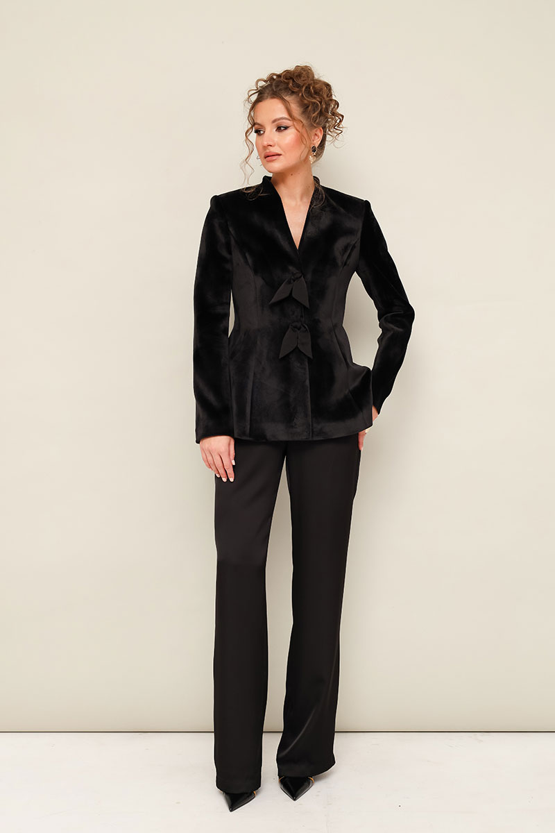 Вечерний жакет полуприлегающего силуэта, слегка расширенный к низу, выполнен из плотного бархата. Горловина с цельнокроеной стойкой и V-образным вырезом. Центральная застёжка на потайные пришивные кнопки. Перед с рельефами и декоративными бантами. Рукава втачные, двухшовные. Спинка с рельефами и средним швом. Жакет обработан подкладкой.