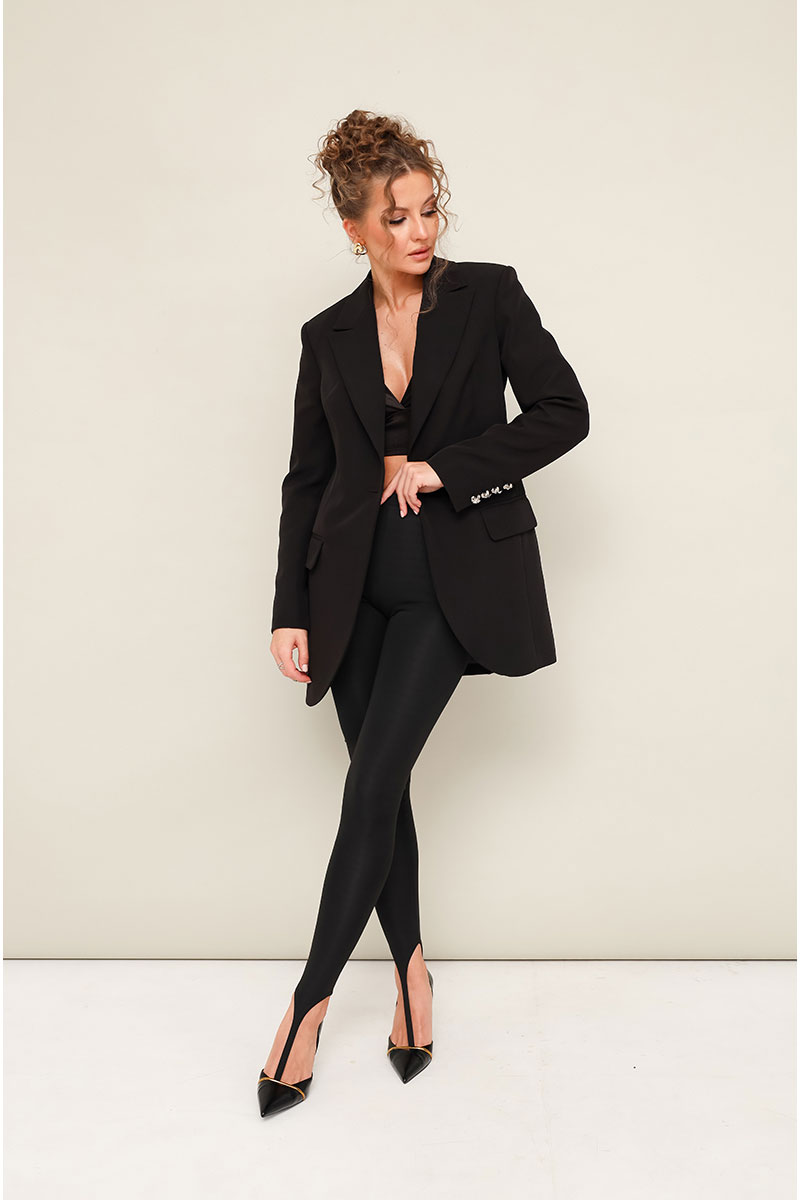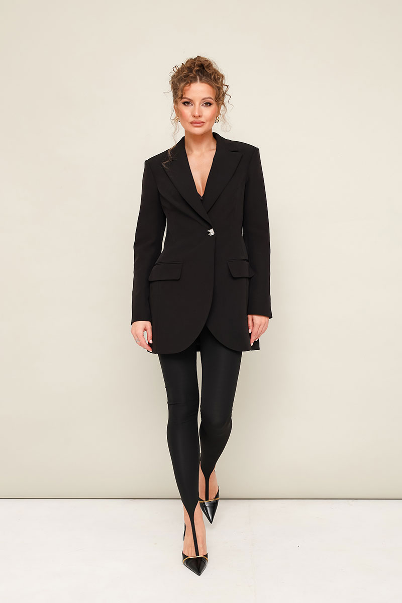 Стильный жакет полуприлегающего силуэта, выполнен из костюмной ткани. Смещенная застежка на петлю и пуговицу. Воротник пиджачного типа с отложными лацканами, край борта скругленный по низу жакета. Спереди обработаны прорезные карманы в рамку с клапанами. Рукава втачные, двухшовные со шлицами с застежкой на петли и пуговицы. Спинка с рельефами и средним швом. Жакет на подкладке.