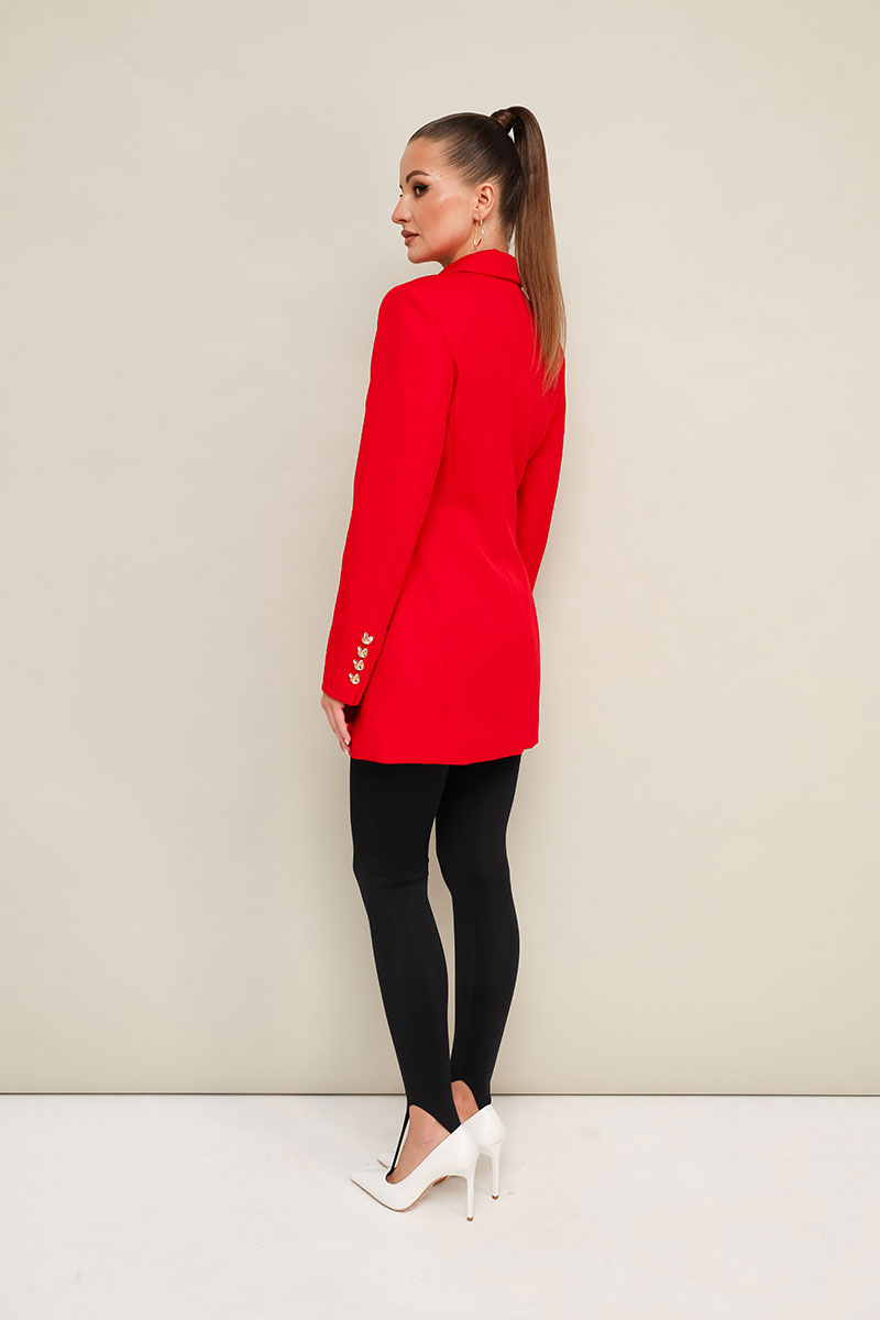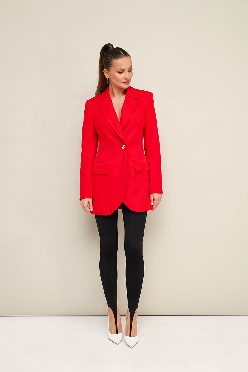 Стильный жакет полуприлегающего силуэта, выполнен из костюмной ткани. Смещенная застежка на петлю и пуговицу. Воротник пиджачного типа с отложными лацканами, край борта скругленный по низу жакета. Спереди обработаны прорезные карманы в рамку с клапанами. Рукава втачные, двухшовные со шлицами с застежкой на петли и пуговицы. Спинка с рельефами и средним швом. Жакет на подкладке