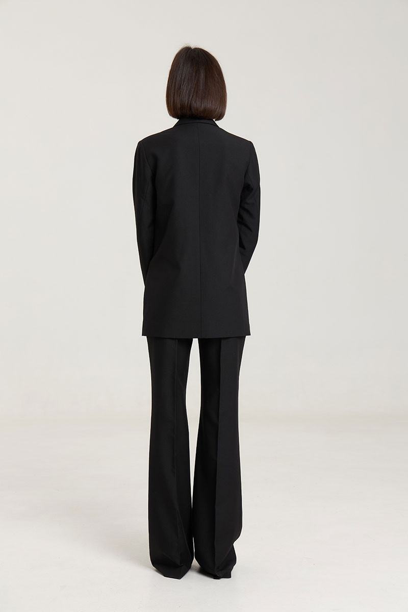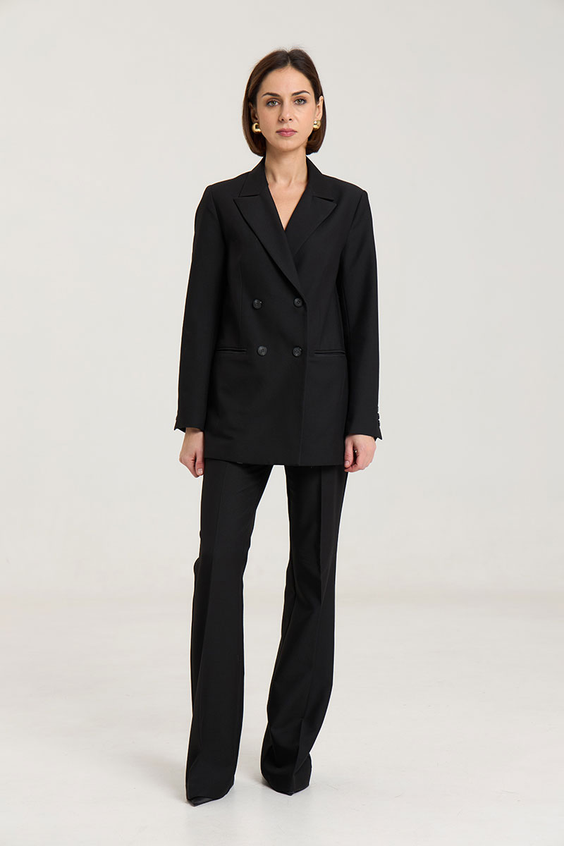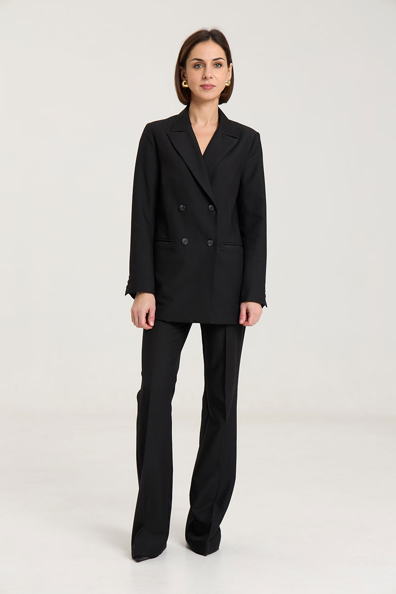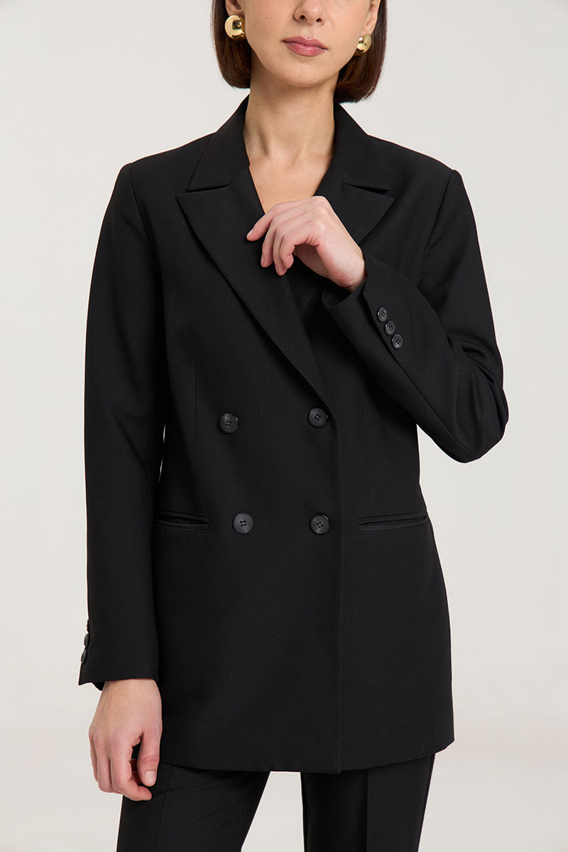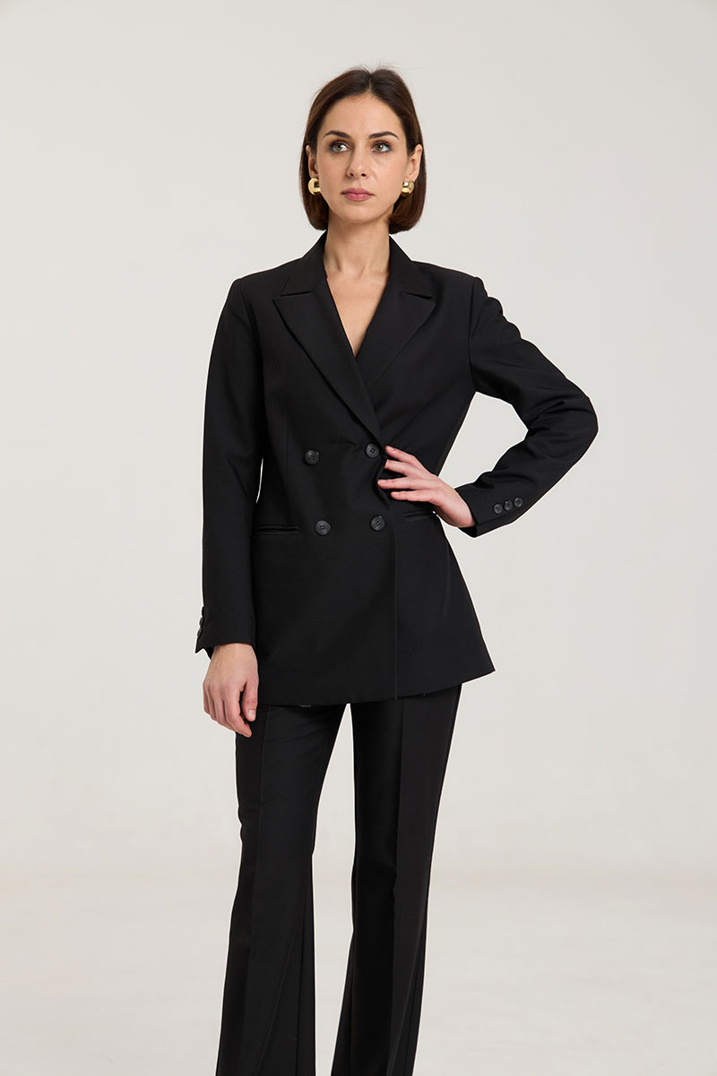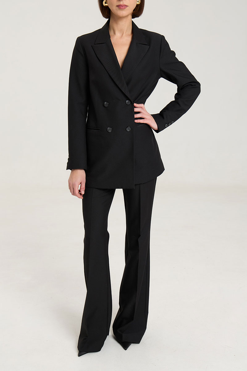 Жакет пошит таким образом, чтобы в нем было комфортно женщине любого возраста, с любыми формами.Жакет двубортный, с нагрудными выточками, прорезные карманы в рамку с клапанами, застежка на петли и пуговицы, спинка со средним швом, втачные двухшовные рукава, с тремя отделочными пуговицами,жакет на подкладке. Выполнен из премиальной ткани костюмной группы.