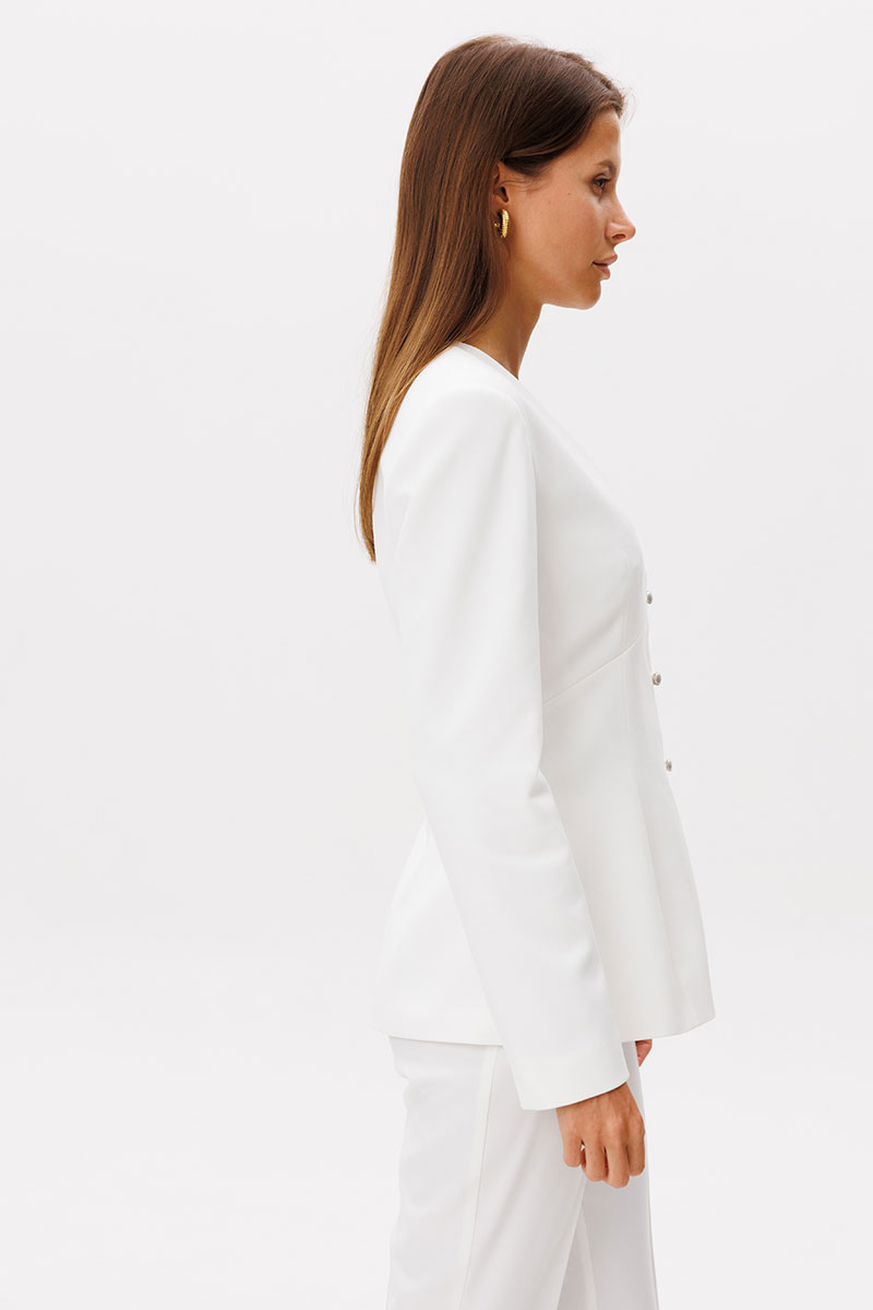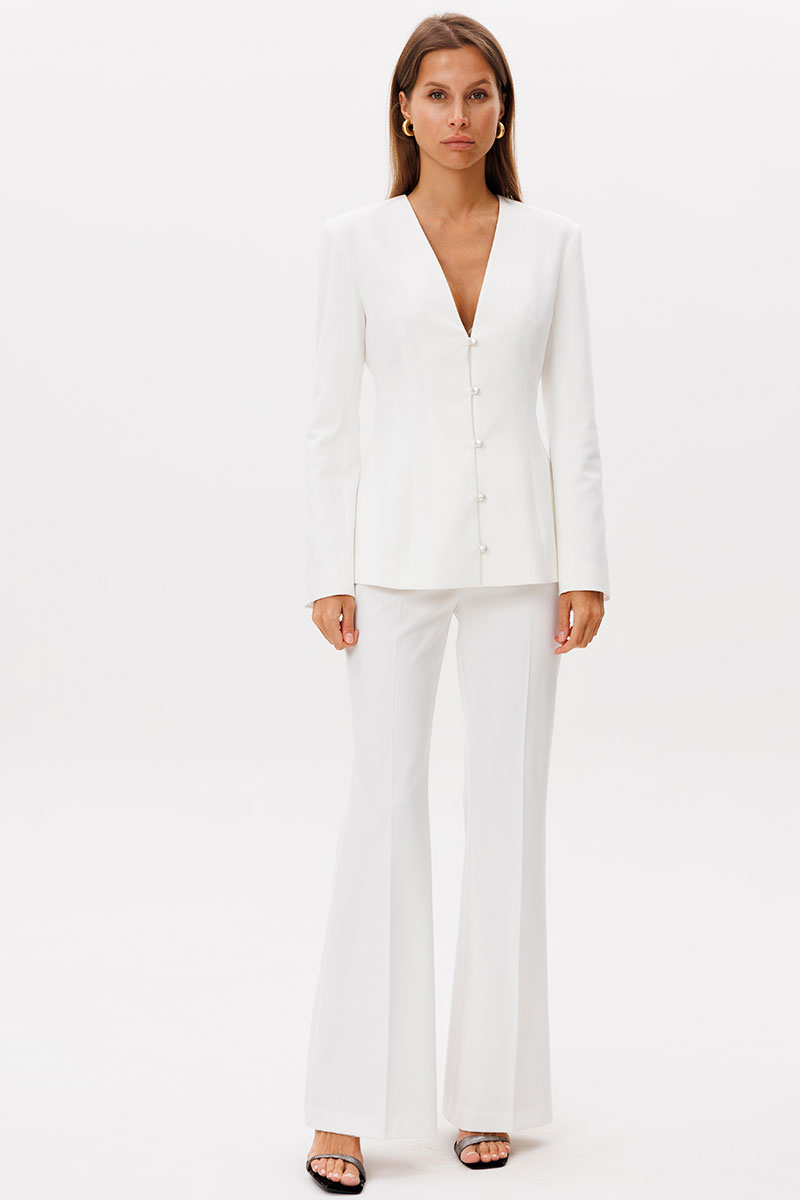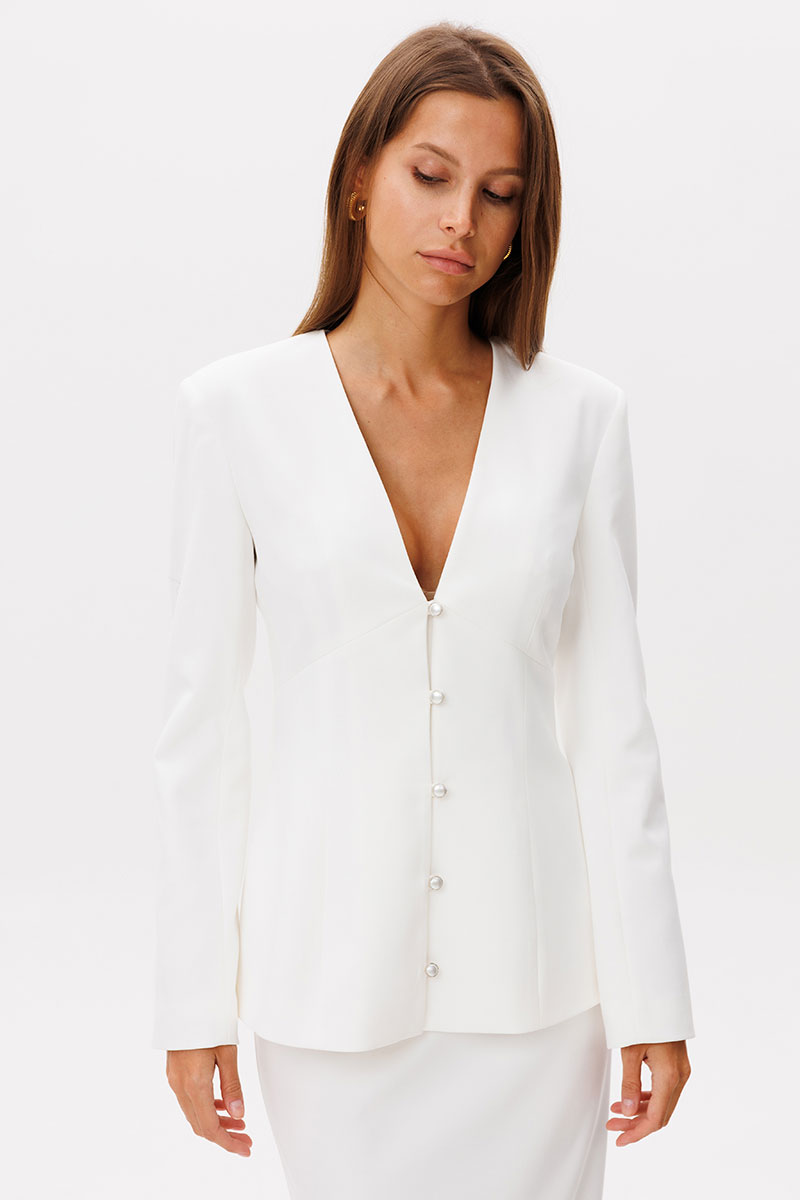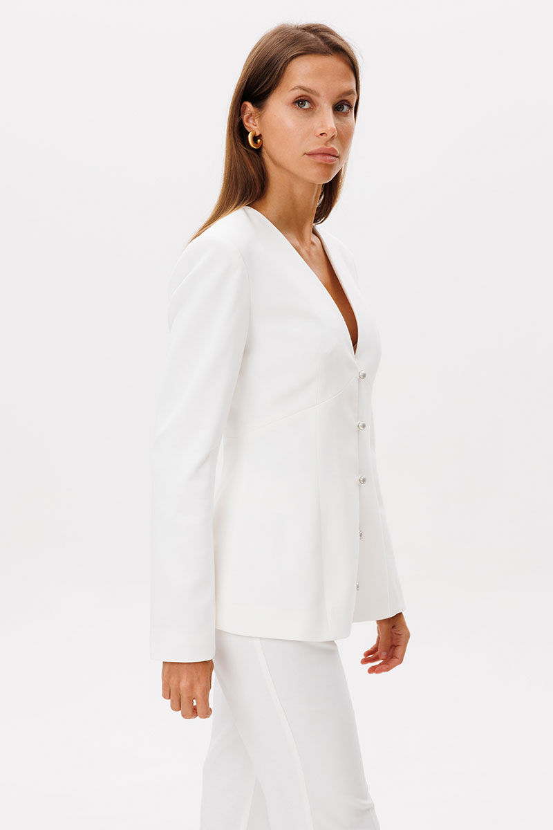 Жакет прилегающего силуэта с глубоким V-м вырезом, застежка центральная на навесные петли. Талия отрезная, Полочка и спинка верхней части с выточками, нижняя часть полочки с выточками и рельефами. Рукав втачной, двухшовный с плечевой накладкой. Жакет на подкладке. Такой жакет максимально подчеркнет линию талии, сделает образ притягательным и женственным. Жакет можно ность самостоятельно с любым низом. Красиво будет смотреться юбка из светлого атласа, брюки арт 2272 в бежевом цвете.