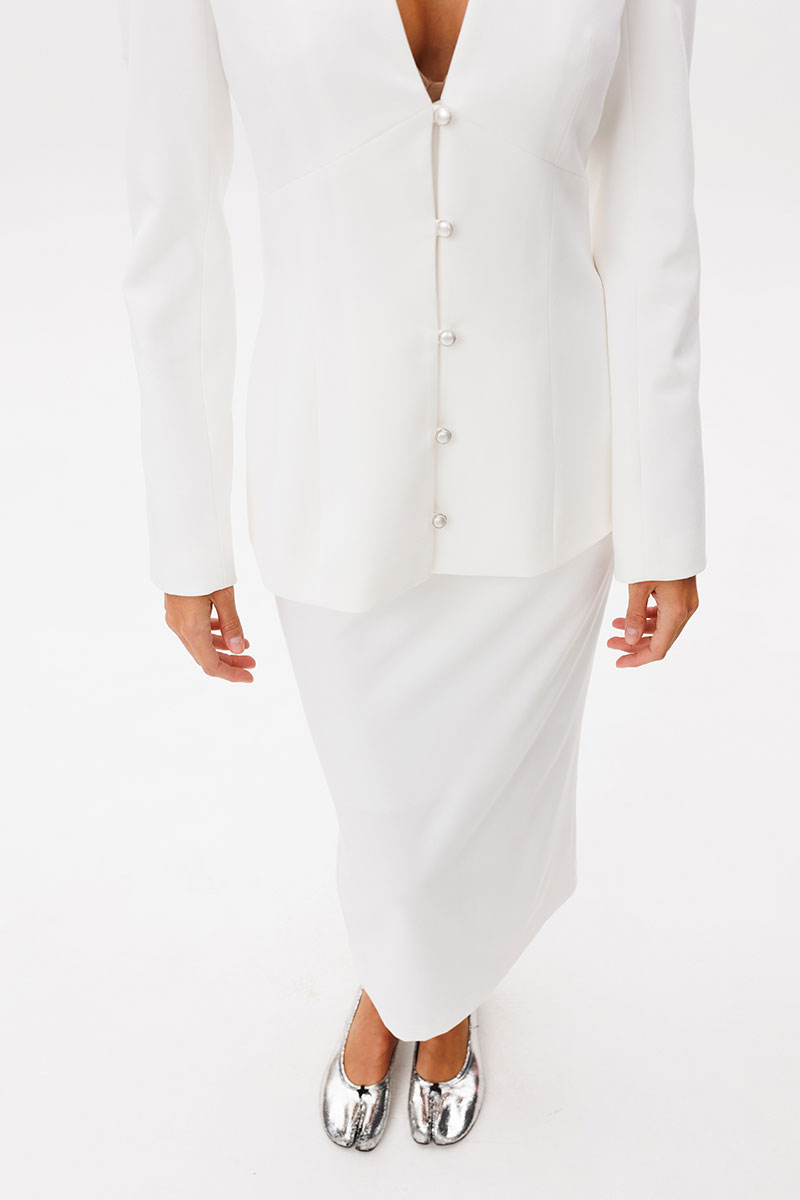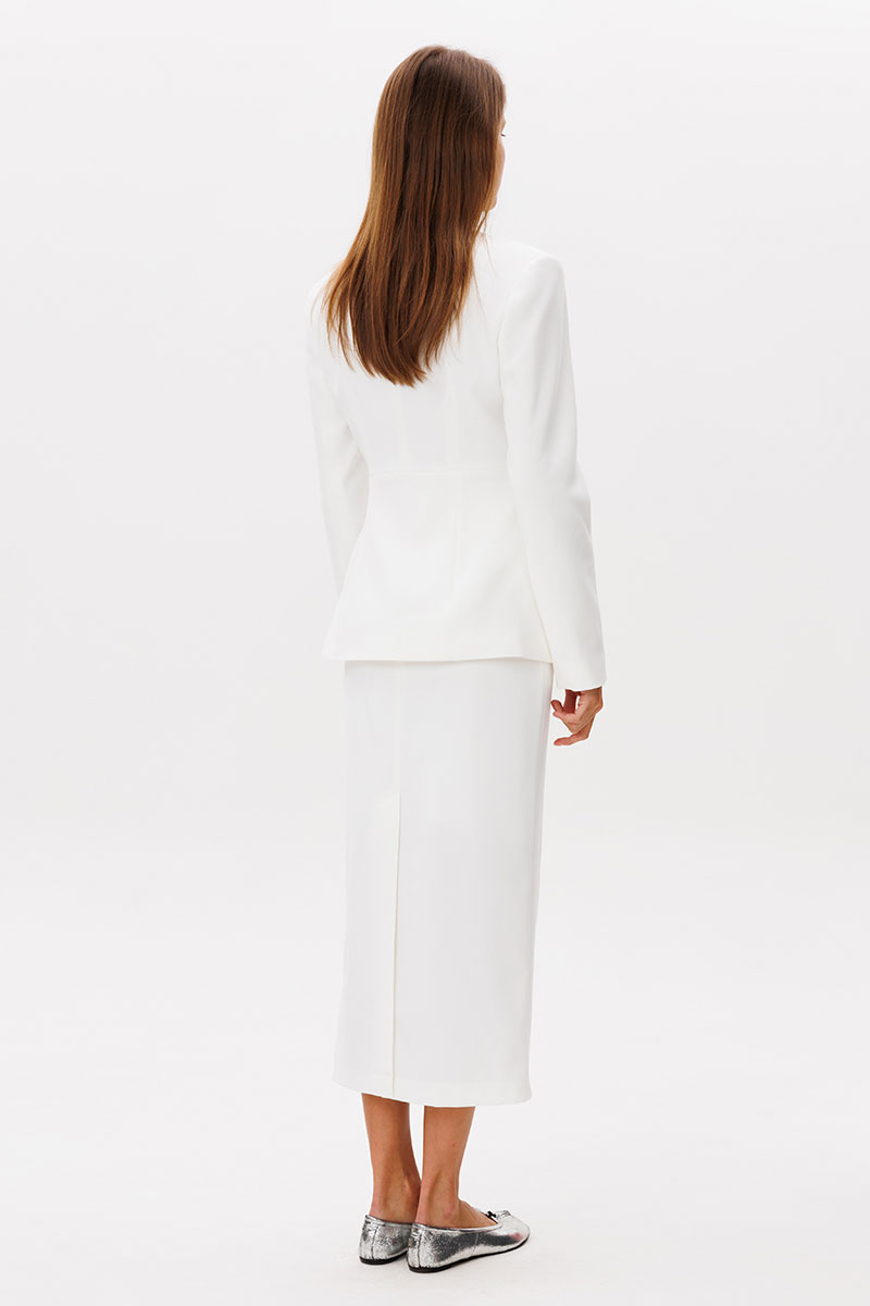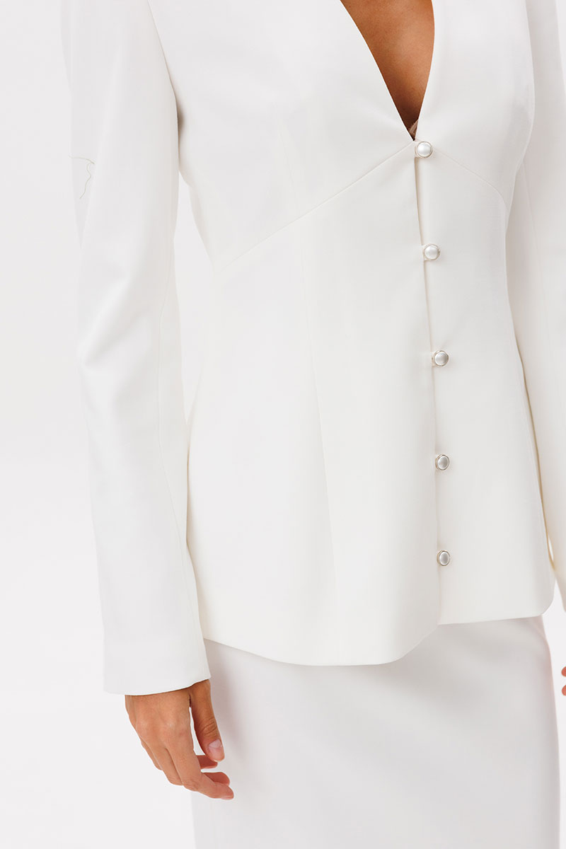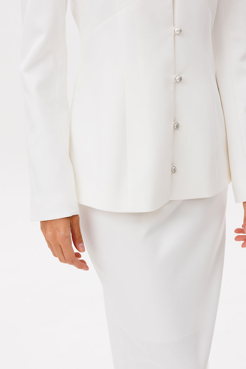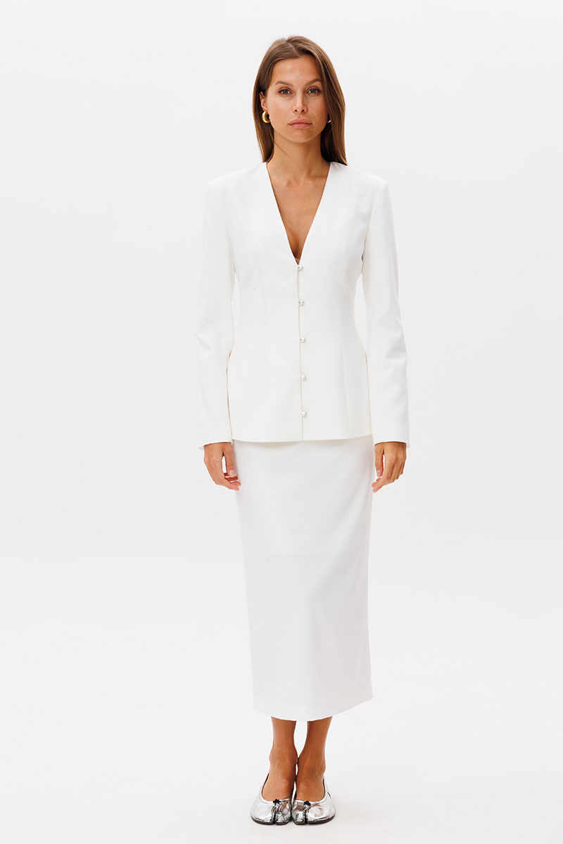 Жакет прилегающего силуэта с глубоким V-м вырезом, застежка центральная на навесные петли. Талия отрезная, Полочка и спинка верхней части с выточками, нижняя часть полочки с выточками и рельефами. Рукав втачной, двухшовный с плечевой накладкой. Жакет на подкладке. Такой жакет максимально подчеркнет линию талии, сделает образ притягательным и женственным. Жакет можно ность самостоятельно с любым низом. Красиво будет смотреться юбка из светлого атласа, брюки арт 2272 в бежевом цвете.