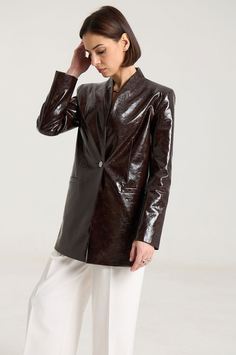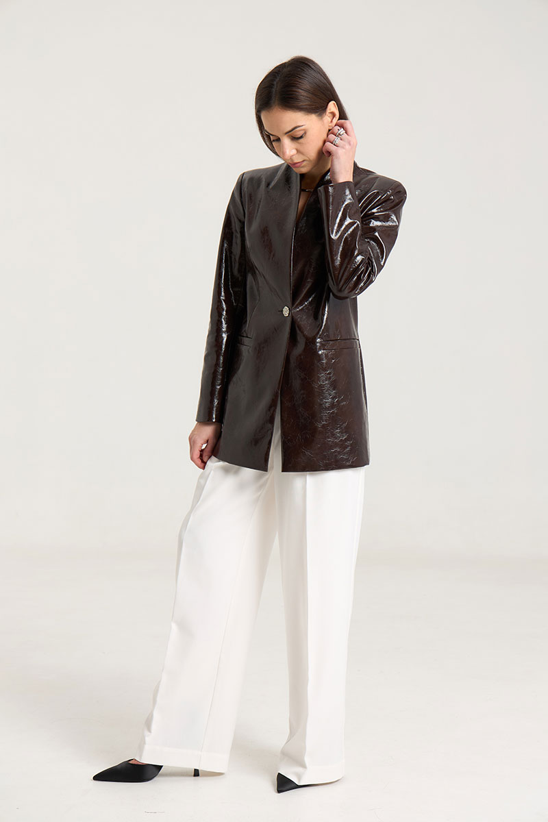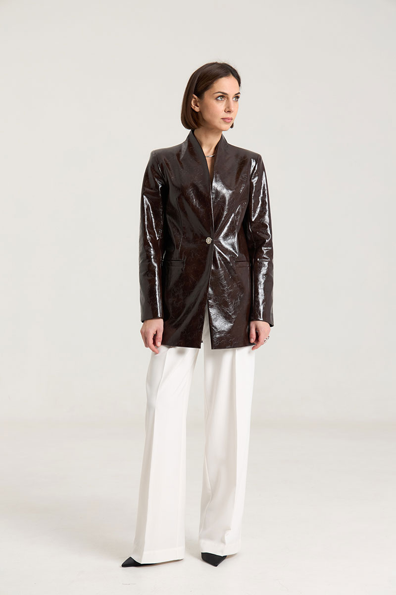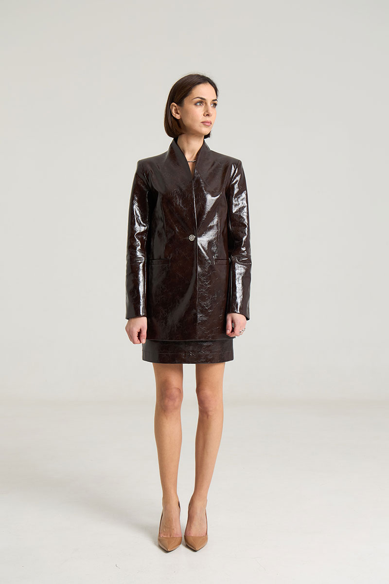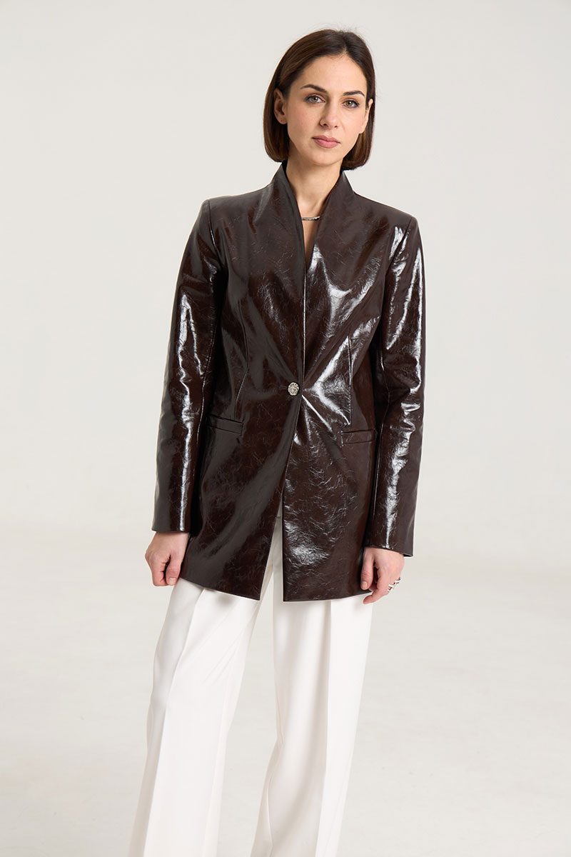 Жакет однобортный на однй центральную петлю-пуговицу, на подкладке, полуприлегающего силуэтас прорезными карманами в рамку по переду. Воротник втачной-стойка, рукав двухшовный, спинка жакета разрезная по центру с талиевыми выточками. Жакет выполнен их плотной лаковой экокожи премиум качества шоколадного цвета.Жакет красиво сочетается с брюками молочного цвета из нашей коллекции или юбкой. Рост модели на фото 168 см.