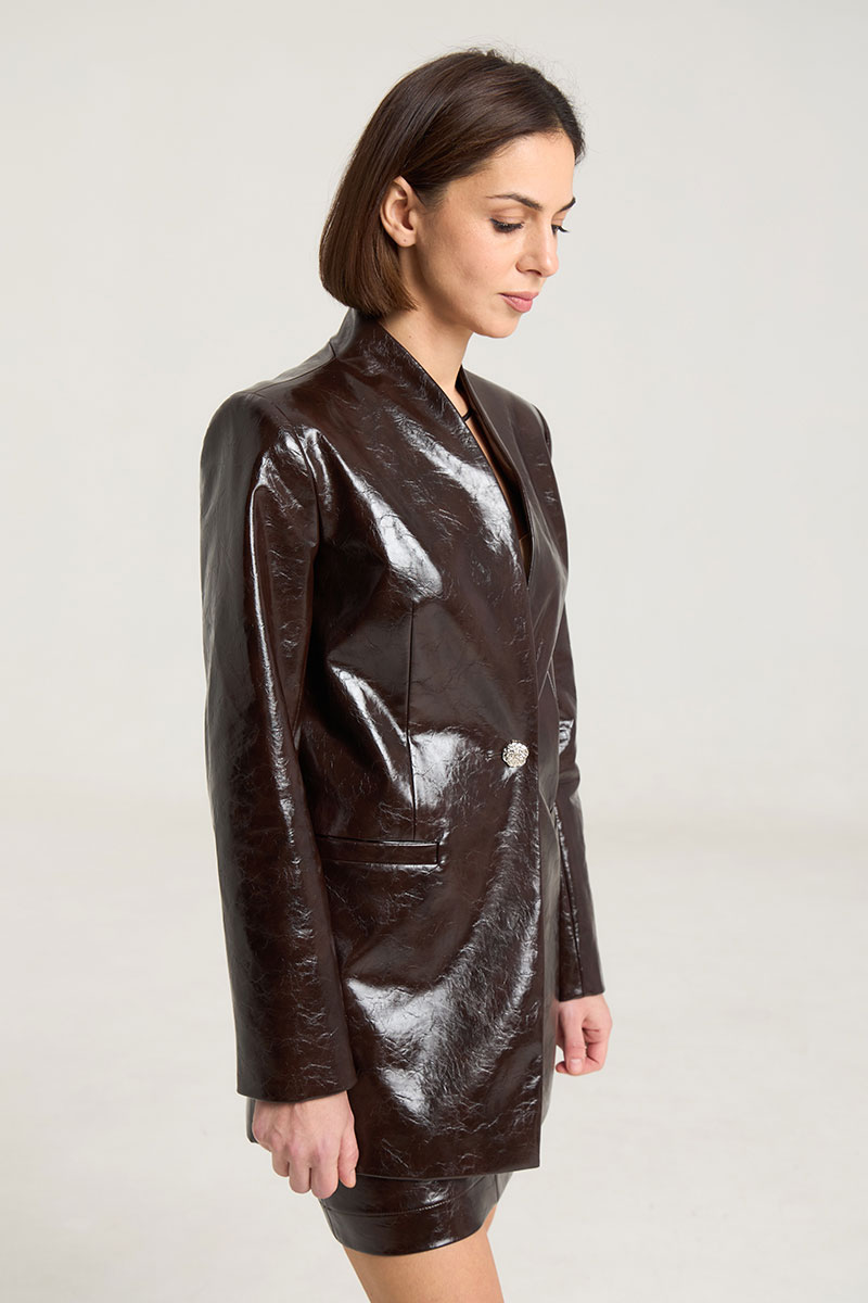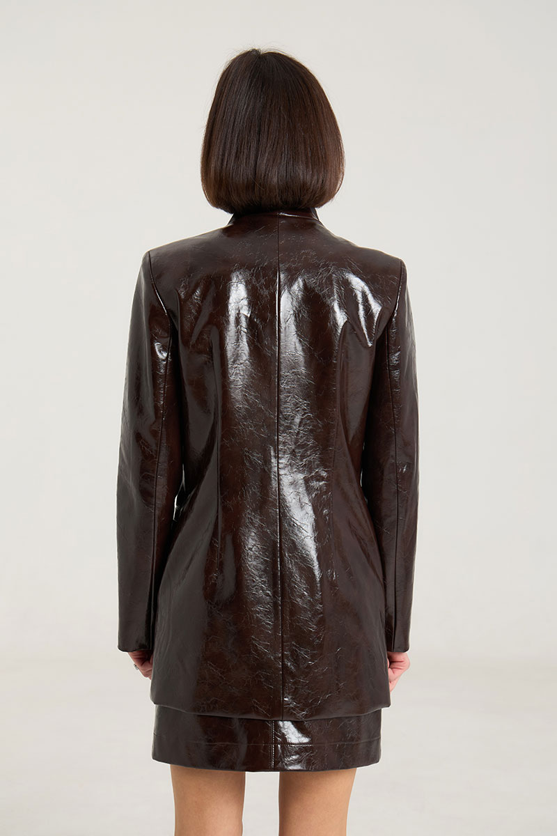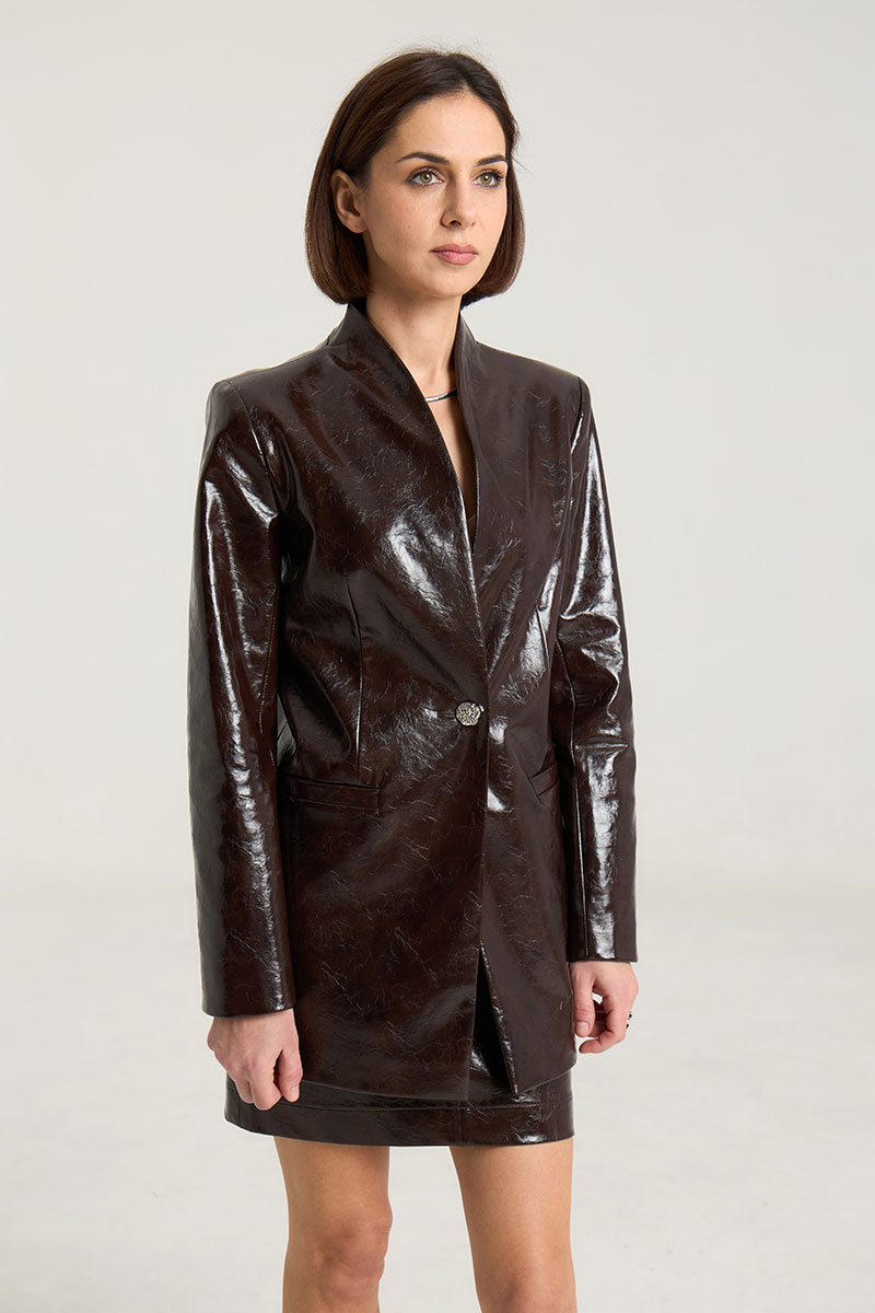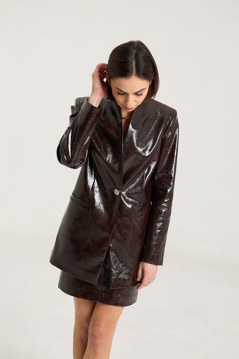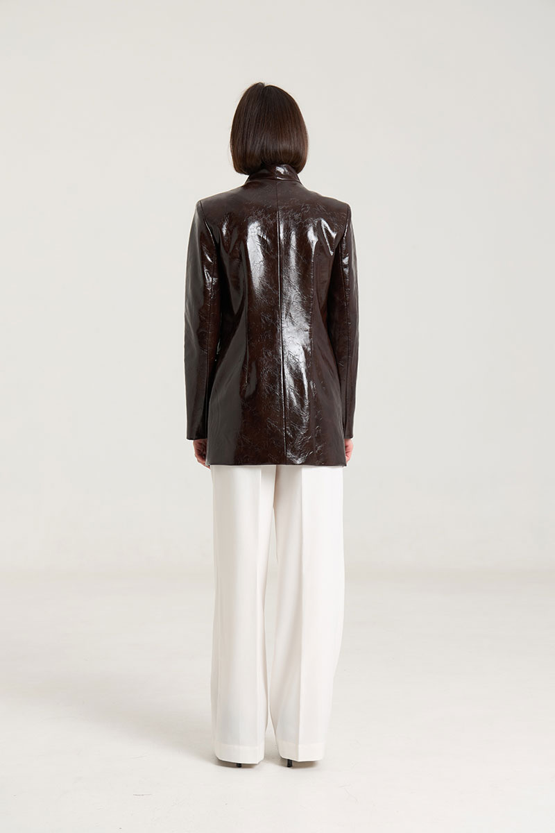Жакет однобортный на однй центральную петлю-пуговицу, на подкладке, полуприлегающего силуэтас прорезными карманами в рамку по переду. Воротник втачной-стойка, рукав двухшовный, спинка жакета разрезная по центру с талиевыми выточками. Жакет выполнен их плотной лаковой экокожи премиум качества шоколадного цвета.Жакет красиво сочетается с брюками молочного цвета из нашей коллекции или юбкой. Рост модели на фото 168 см.