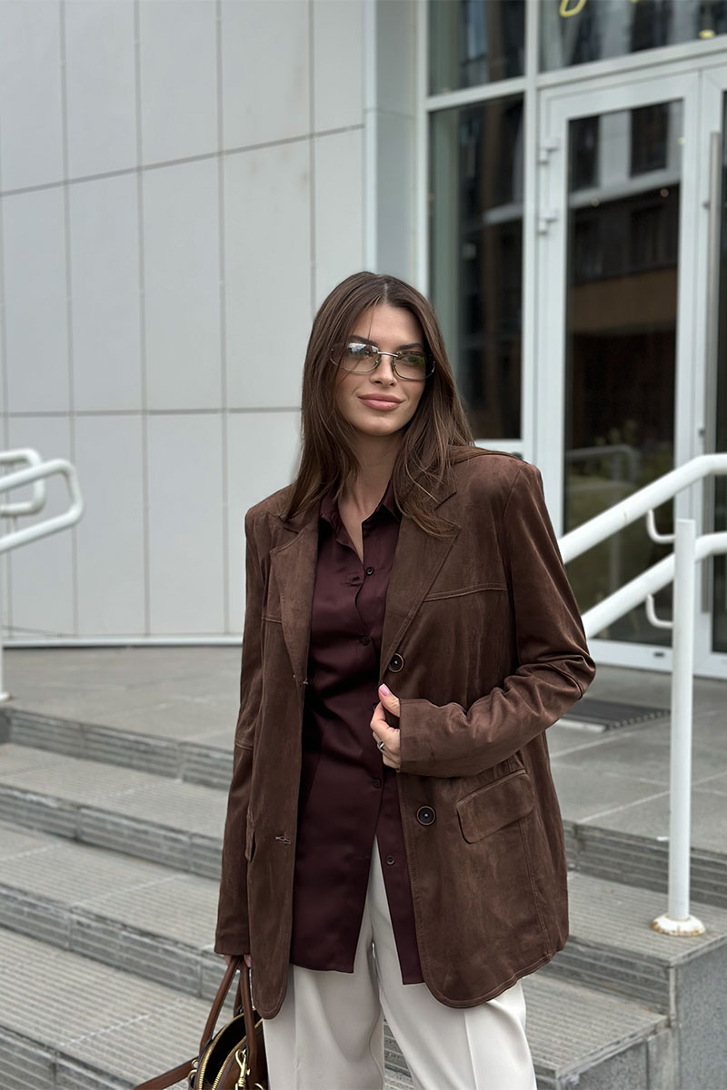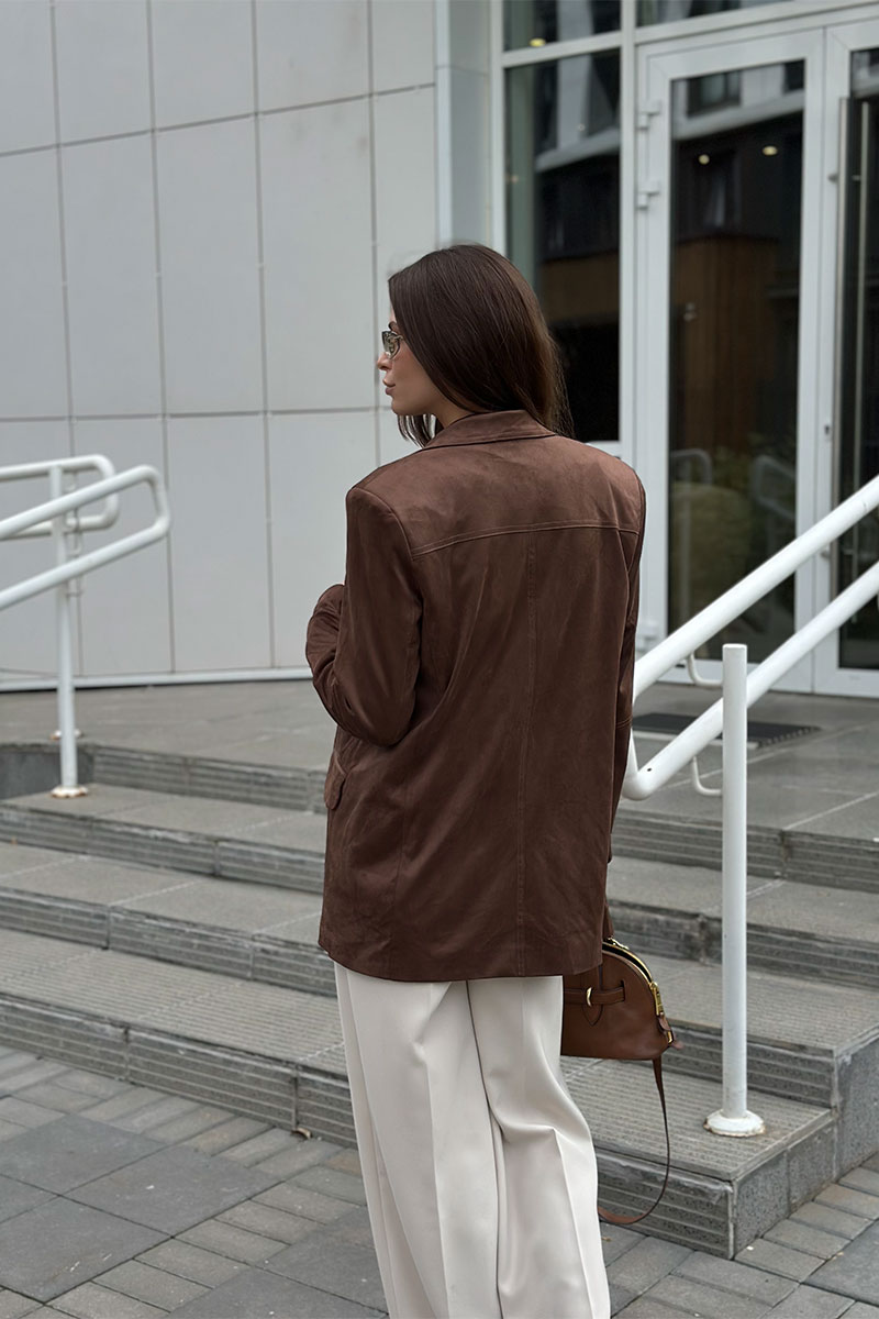 Жакет прямого кроя, выполнен из экозамши на подкладке.